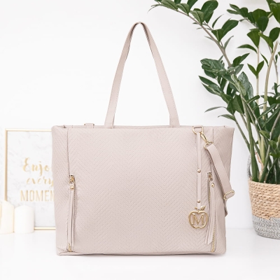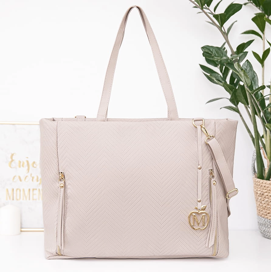 Duża i praktyczna torebka w wersji XXL. Uszyta z grubej mięsistej eko skóry która sami ręcznie pikujemy. W pięknym beżowym kolorze, ze złotymi okuciami.