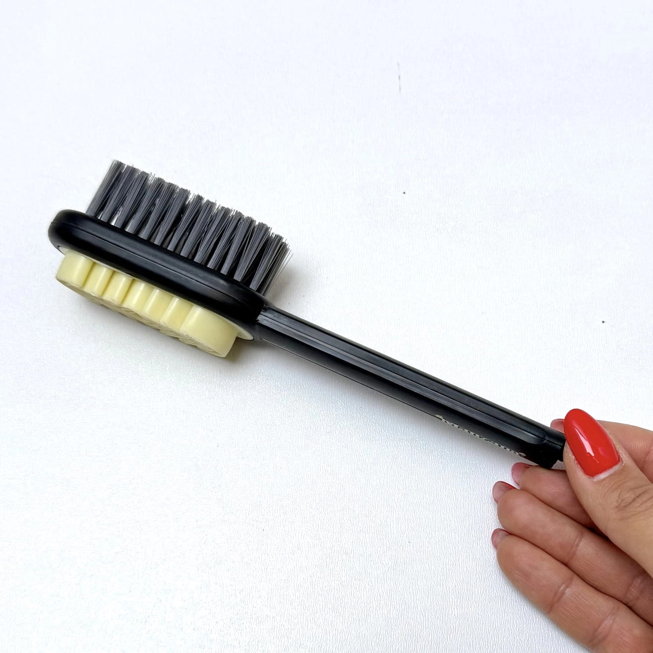 Twarde, gęste włosie usuwa zabrudzenia i przywraca strukturę zamszu.
