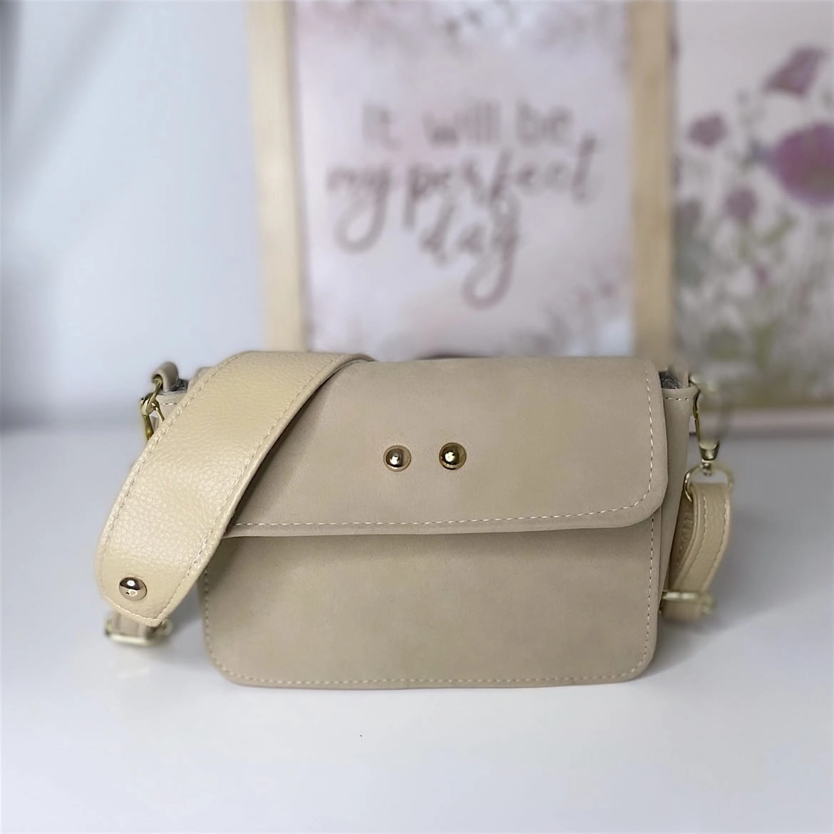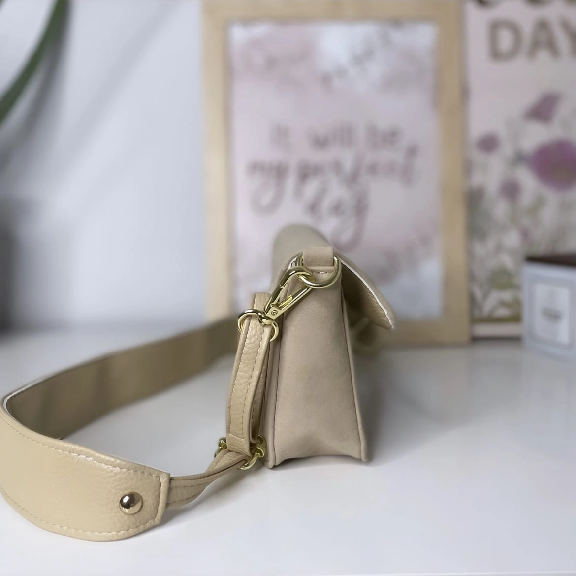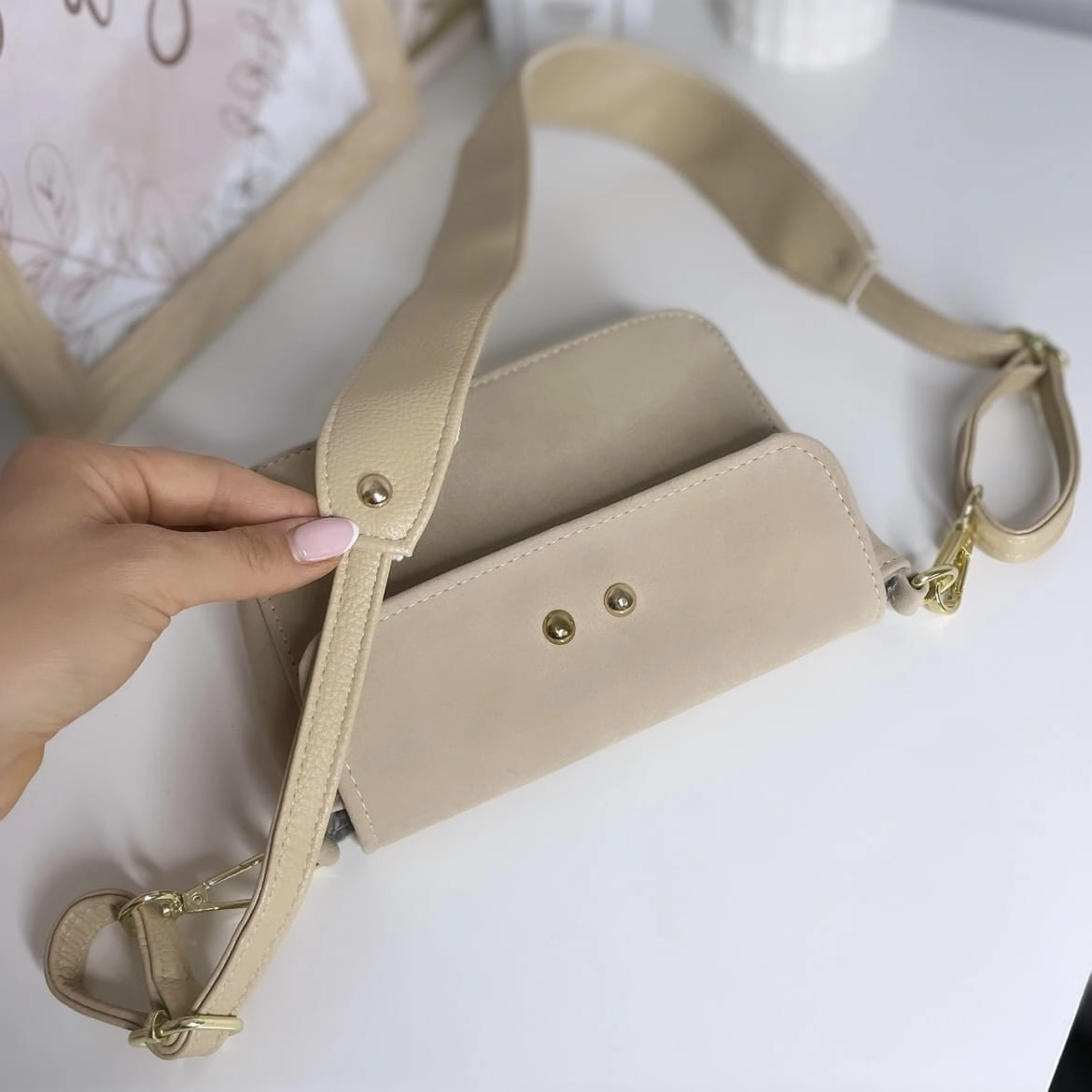 Mała listonoszka jest uszyta z eko zamszu w odcieniu beżu, pasek jest odpinany i regulowany.