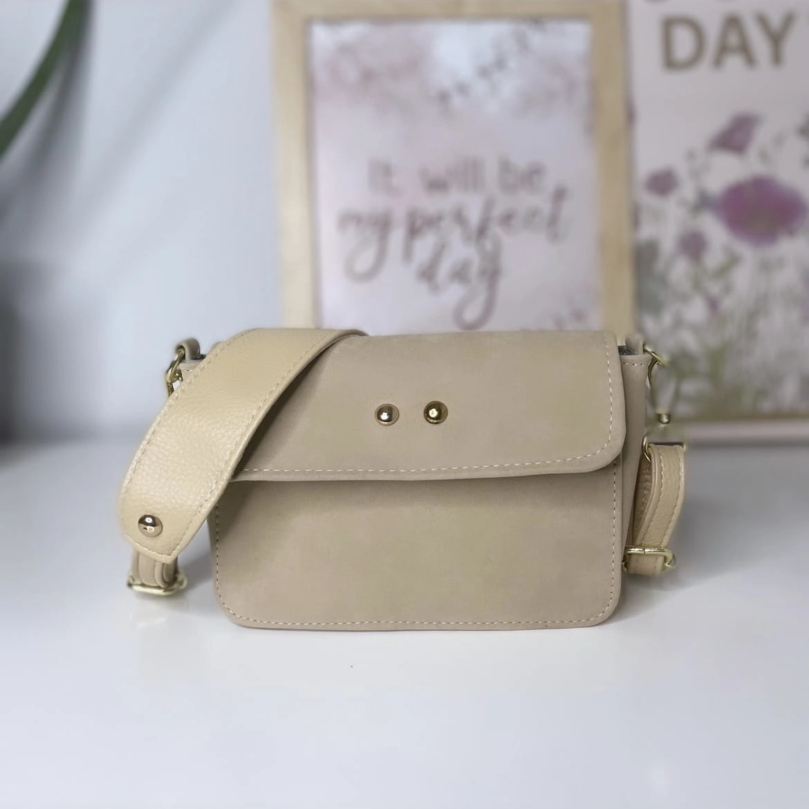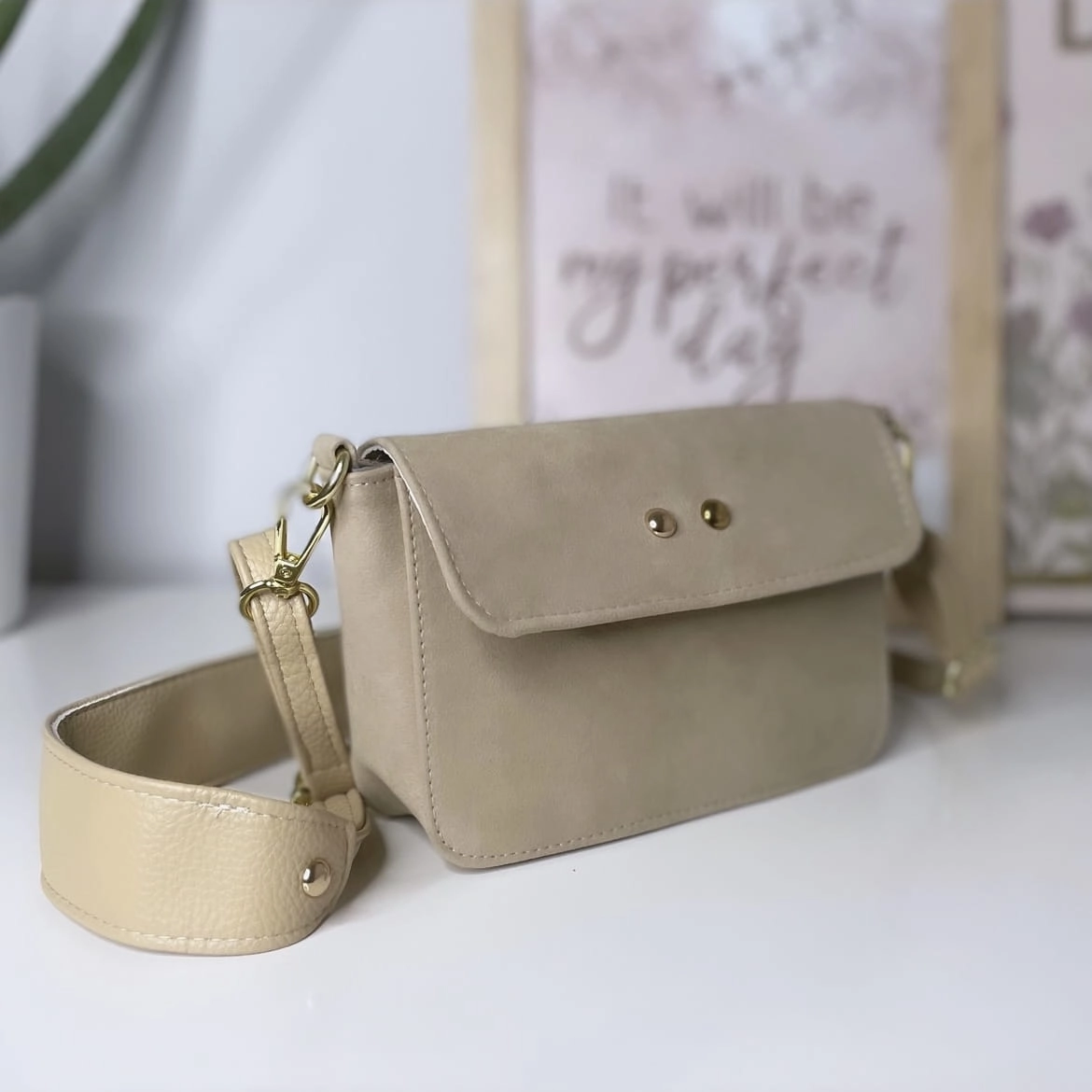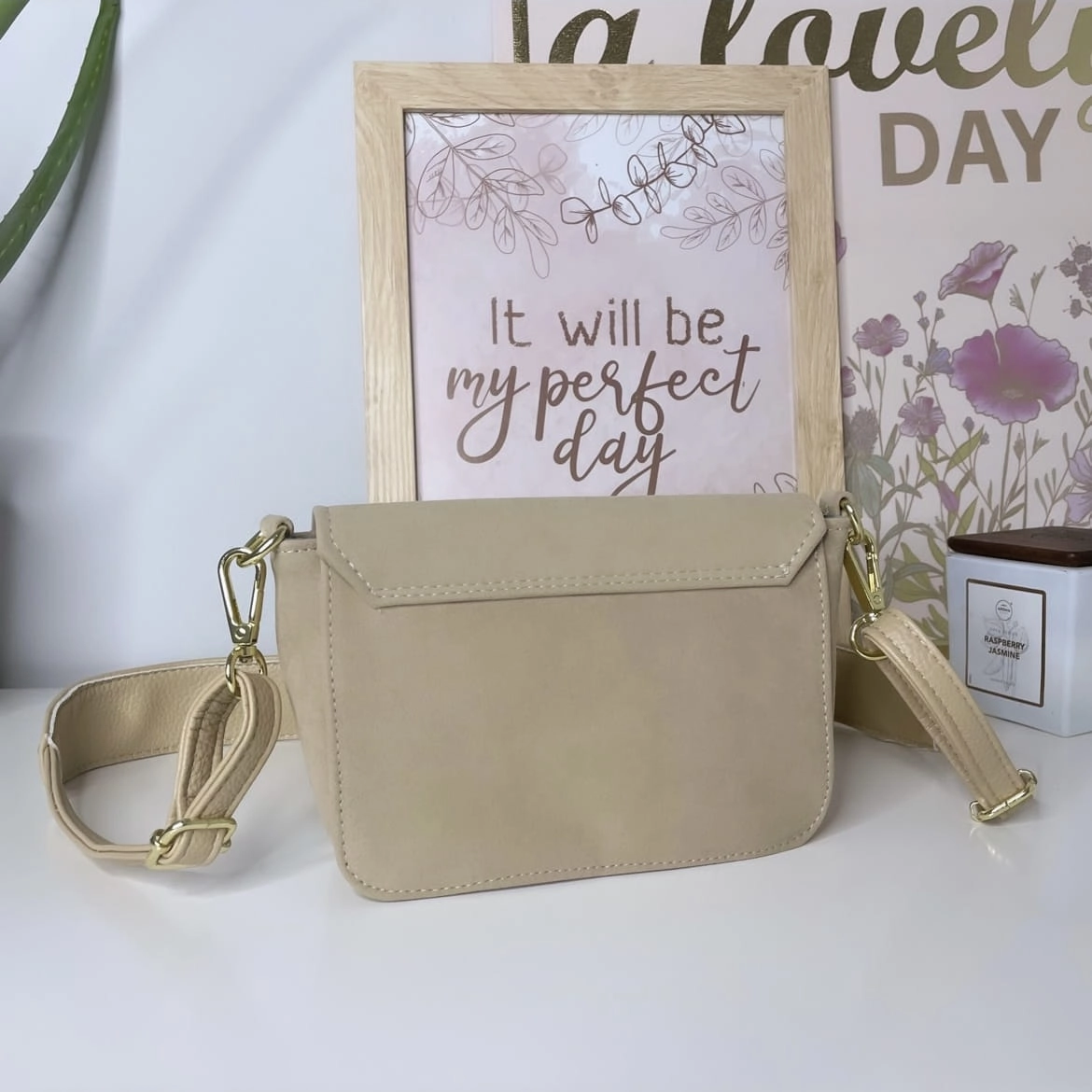 Mała listonoszka jest uszyta z eko zamszu w odcieniu beżu, pasek jest odpinany i regulowany.