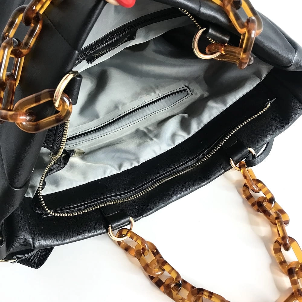 W środku torebki jest siwa podszewka. Torebka jest jednokomorowa z kieszenią zapinaną na zamek i kieszenią na drobiazgi lub telefon.
