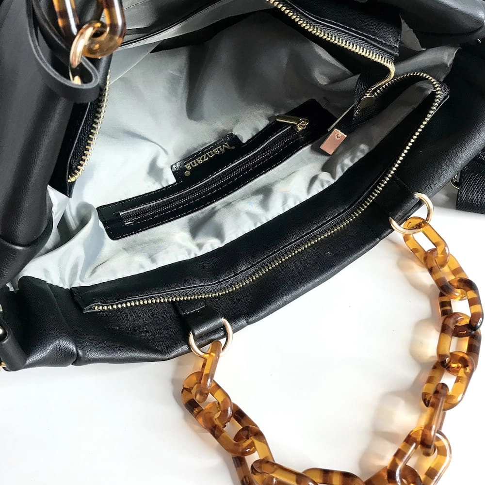 Duża, miękka, miła w dotyku torebka została uszyta z czarnej matowej eko skóra która na żywo przypomina skórę naturalną.
