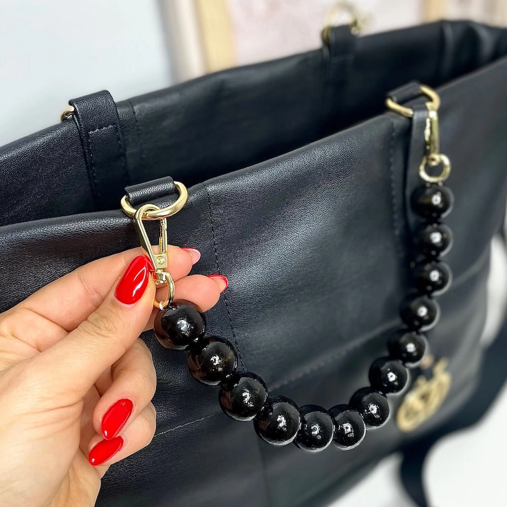 Aby przełamać klasykę dodaliśmy drewniane korale, które ręcznie malujemy. Korale w tej torebce służą jako raczki do ręki.
