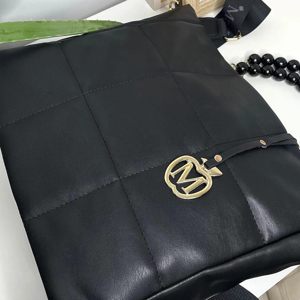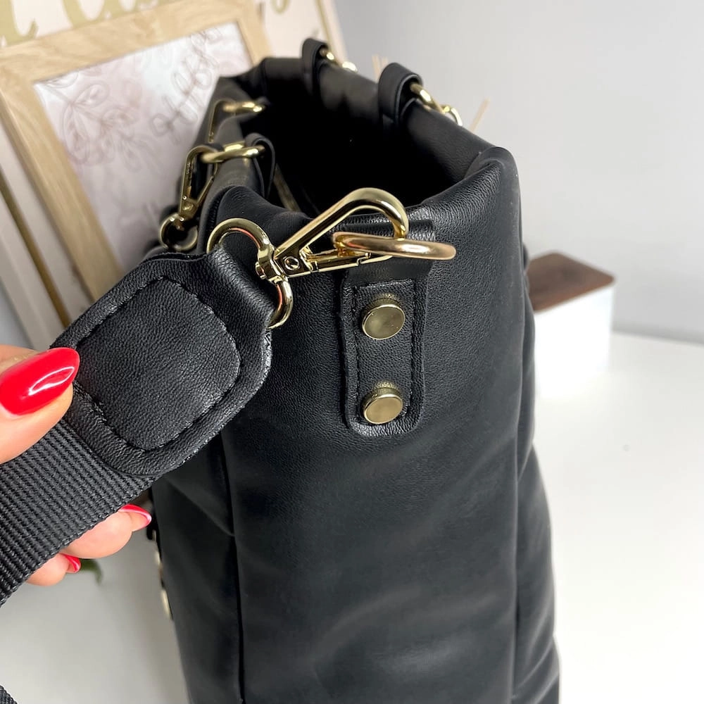Duża, miękka, miła w dotyku torebka została uszyta z czarnej matowej eko skóra która na żywo przypomina skórę naturalną.