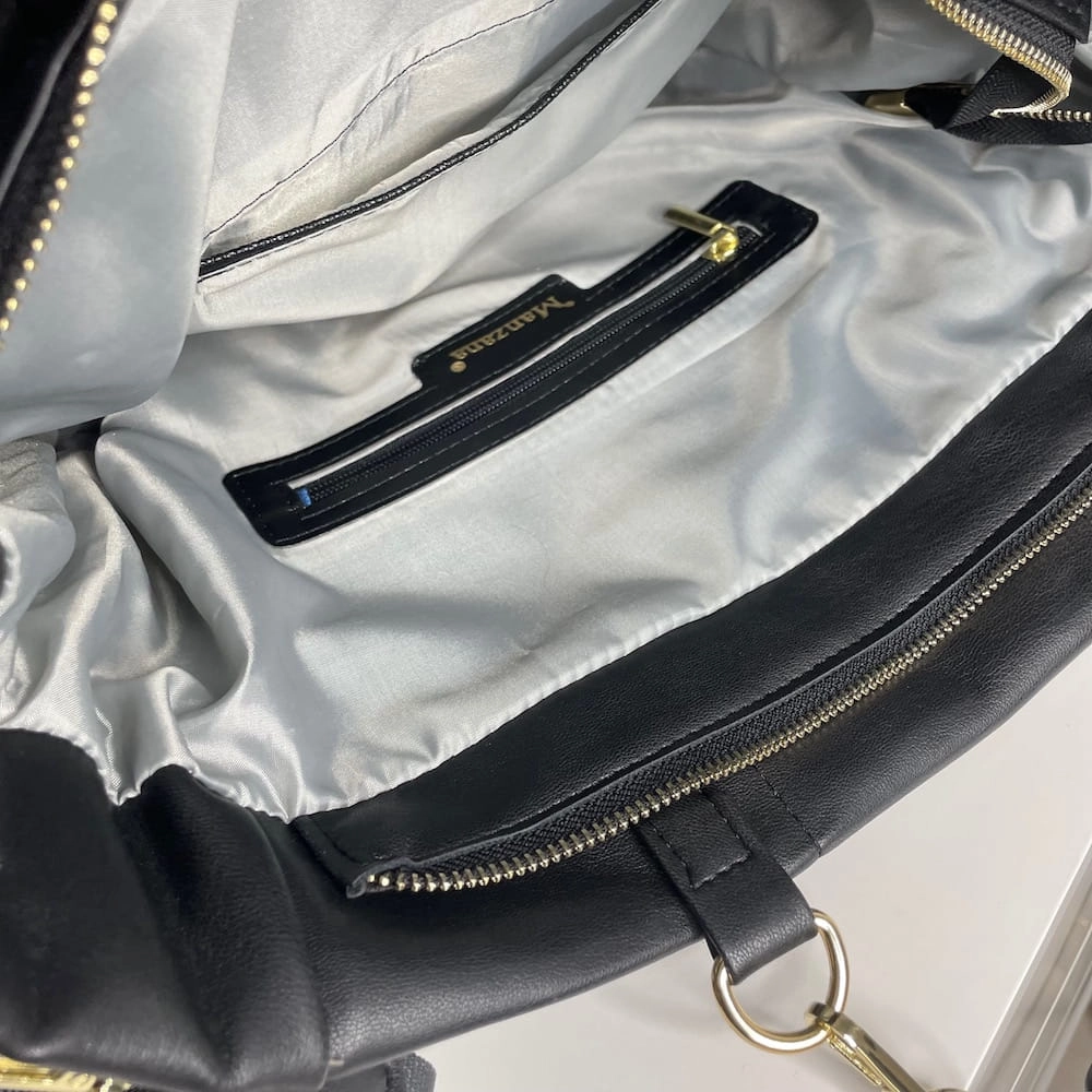 W środku torebki jest siwa podszewka. Torebka jest jednokomorowa z kieszenią zapinaną na zamek i kieszenią na drobiazgi lub telefon.
