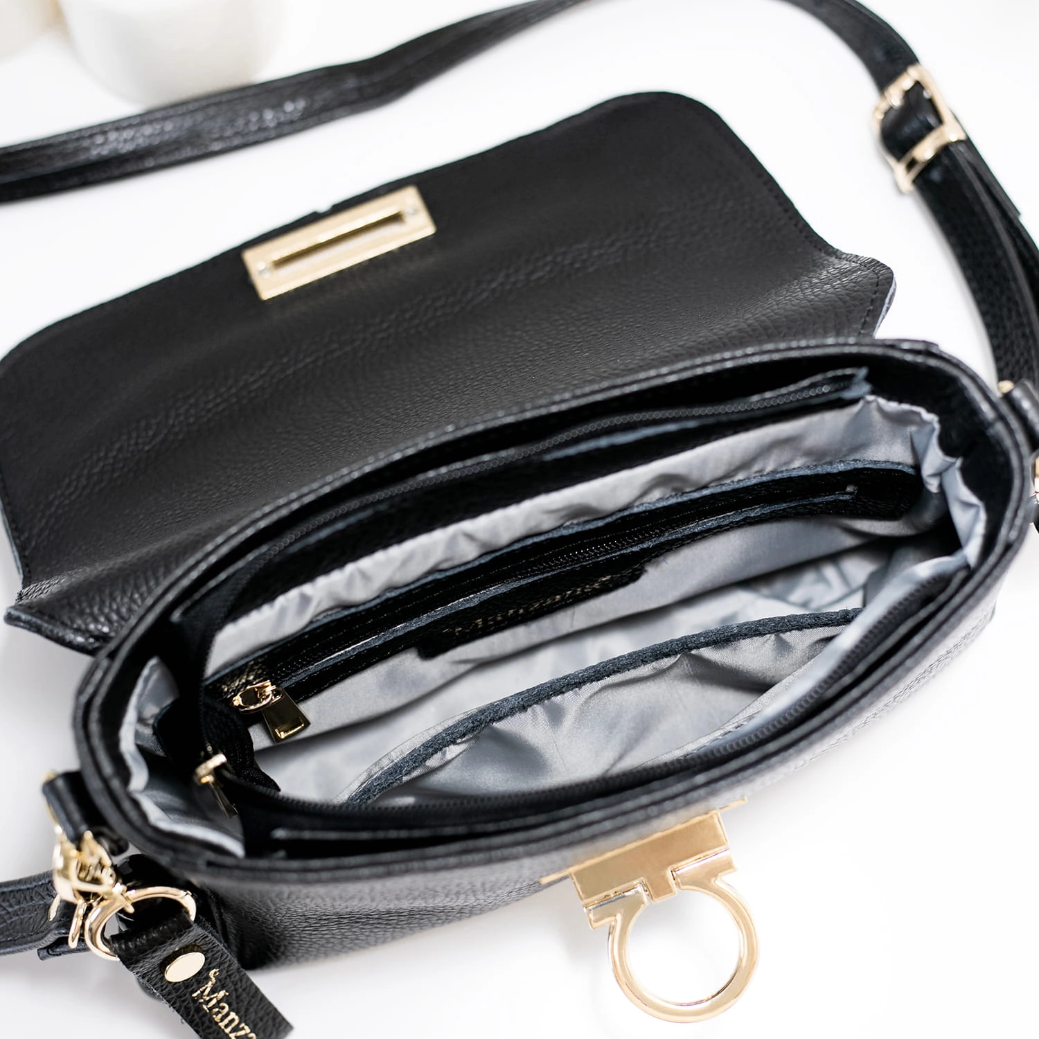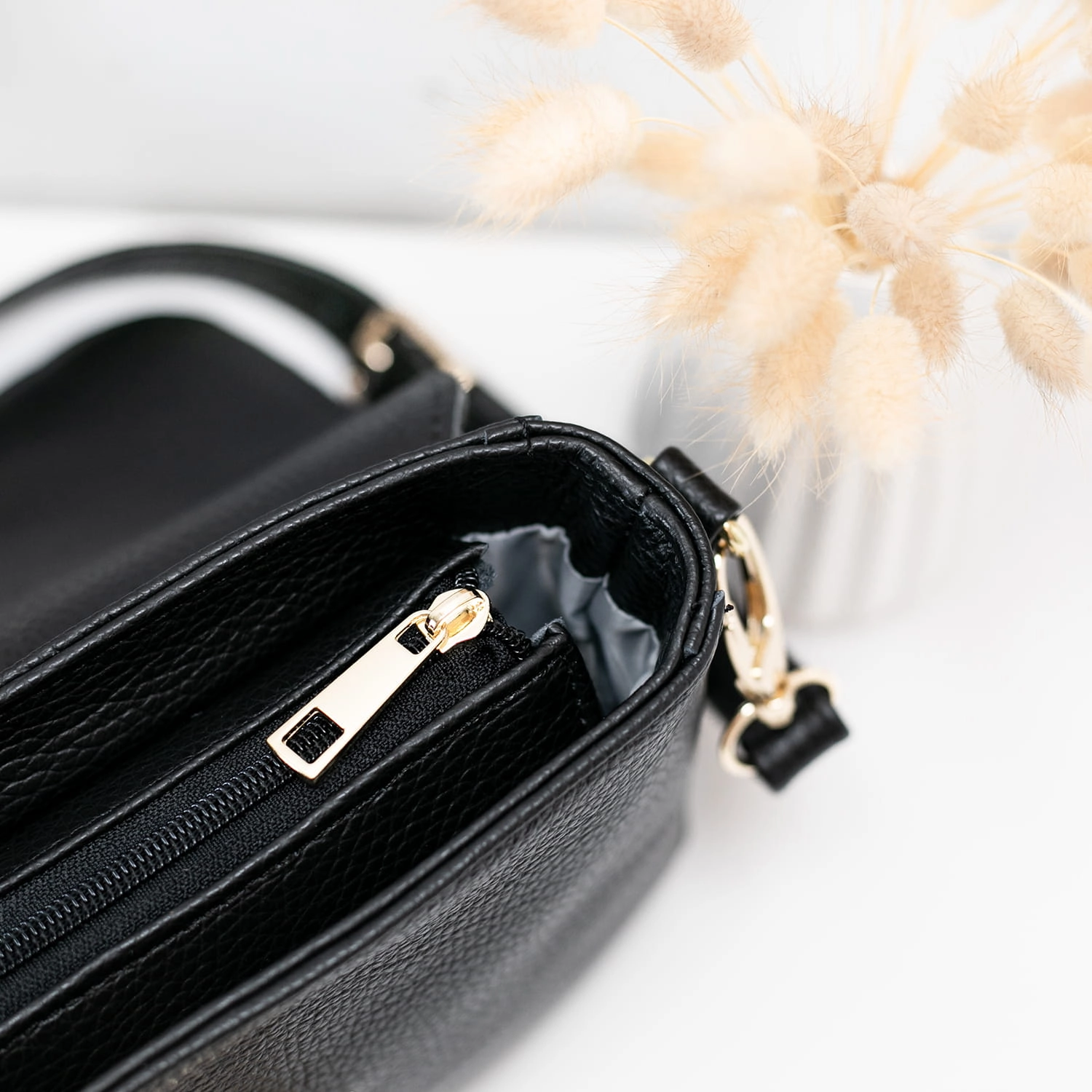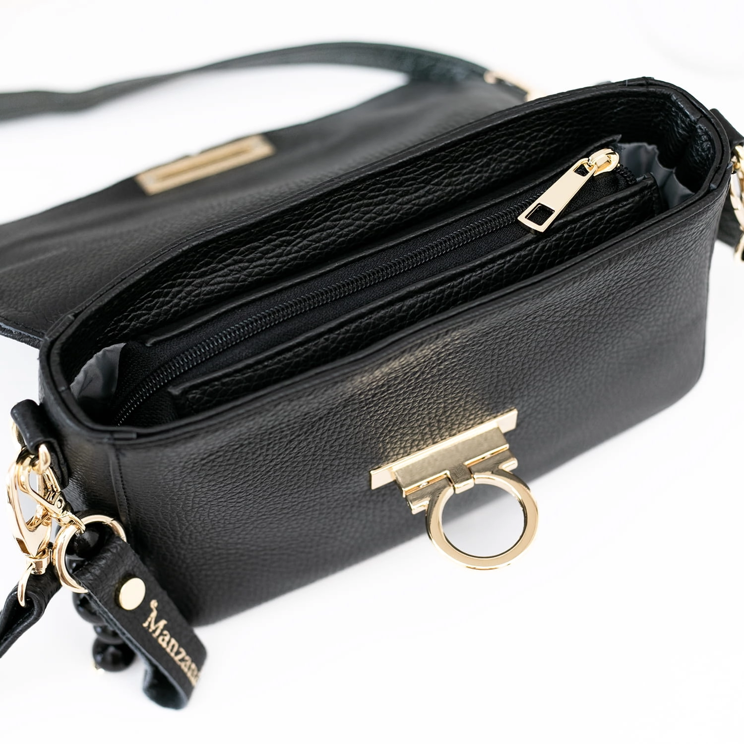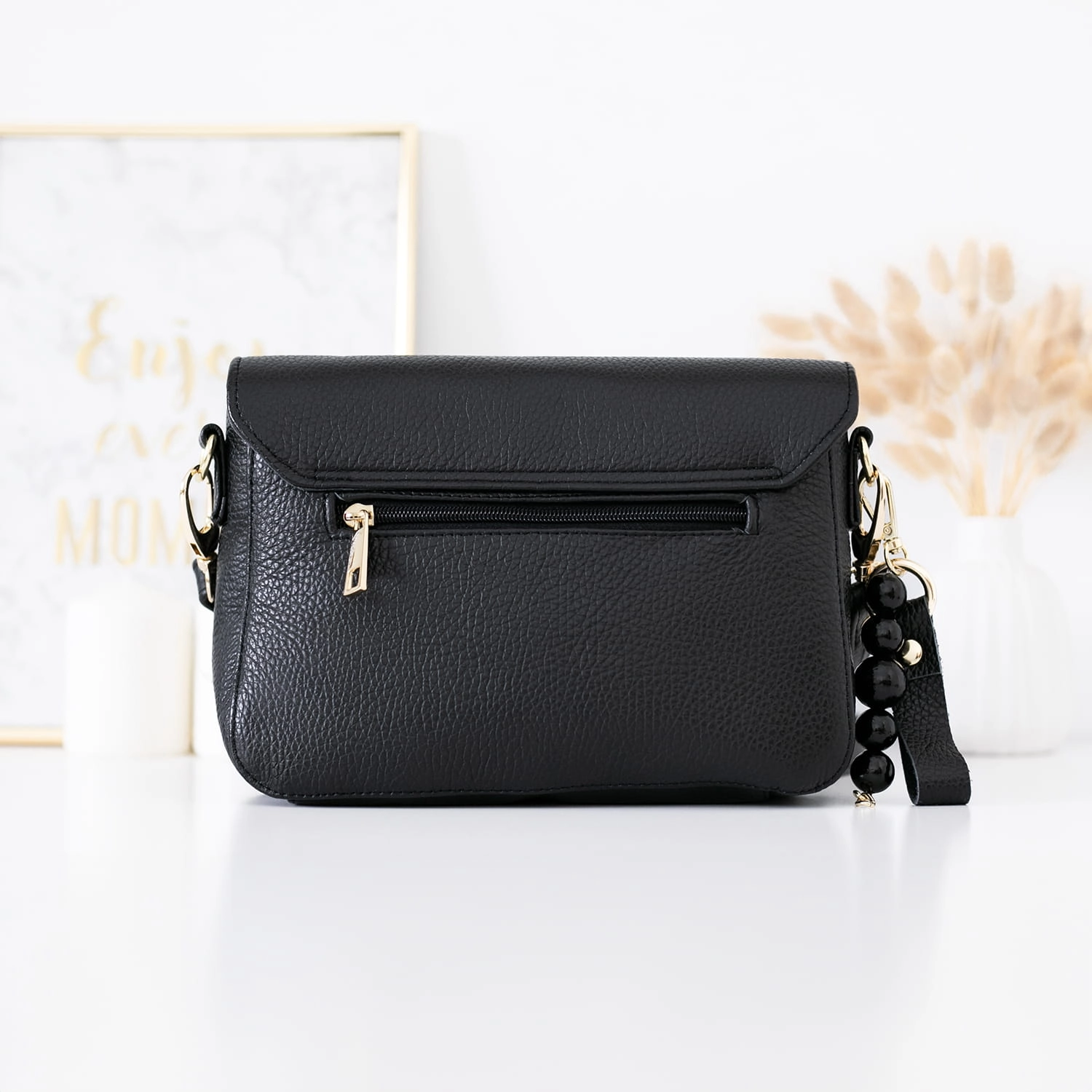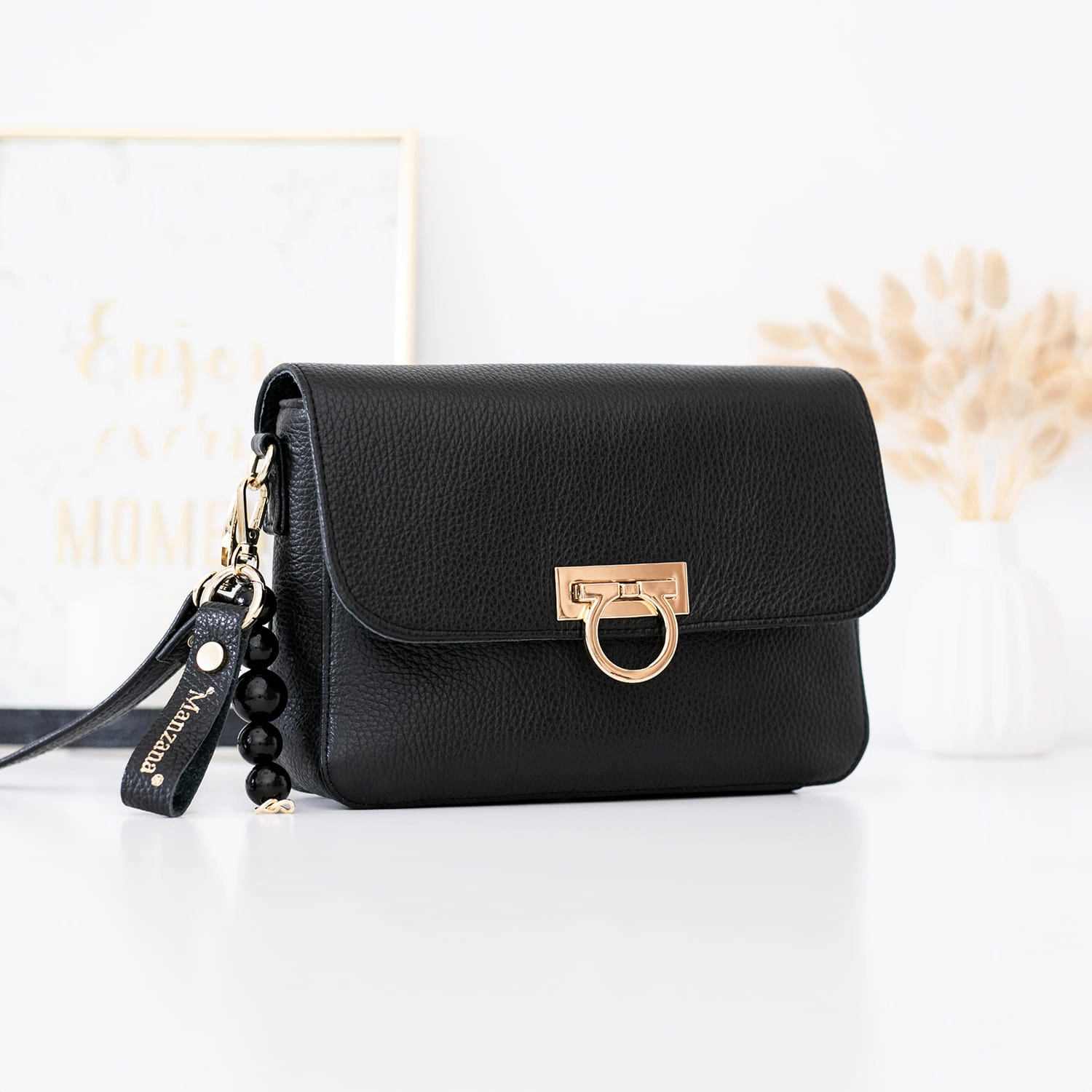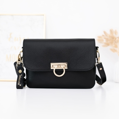 Klasyczna elegancka torebka w kolorze czarnym, wykonana z naturalnej skóry, emanuje ponadczasowym stylem i luksusem. Jej złote okucia dodają wyrafinowania i klasy. Szczegółowe detale, takie jak listonoszka z boku, breloczek i delikatne korale, nadają całości subtelny urok. Modne złote kółeczko jako zapięcie dopełnia elegancję i funkcjonalność torebki. Każdy egzemplarz jest ręcznie szyty w polskiej szwalni, co gwarantuje wysoką jakość wykonania oraz unikalność produktu. Ta torebka będzie nie tylko praktycznym dodatkiem, ale również wyrazem wyrafinowanego gustu i stylu.