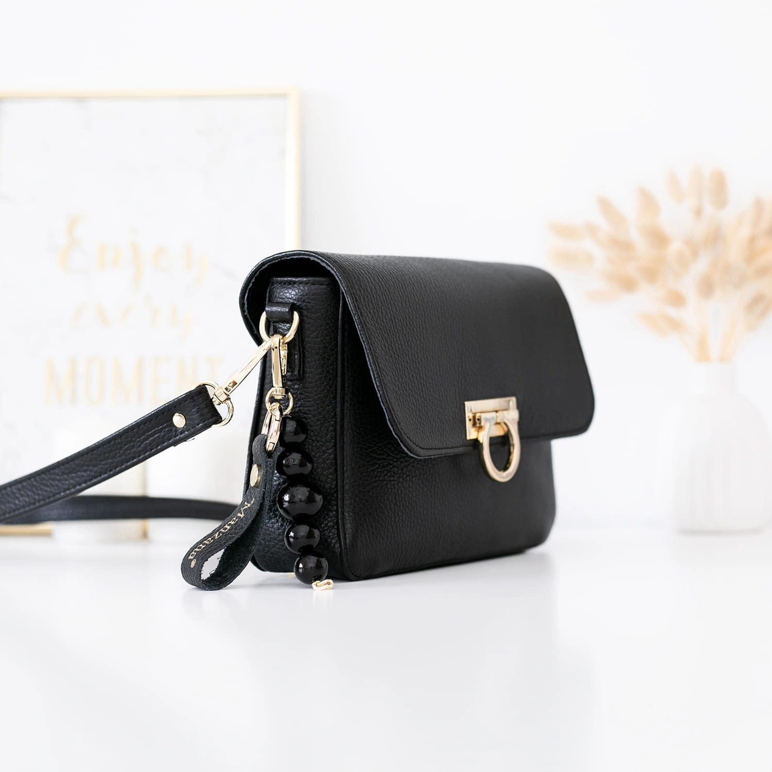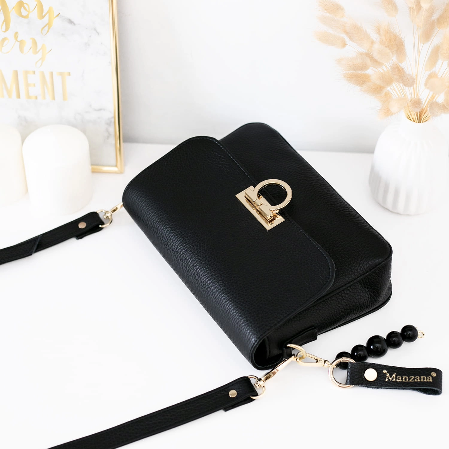 Listonoszka ALICANTE z ozdobnym zapięciem CZARNA skóra naturalna groszek korale + breloczek