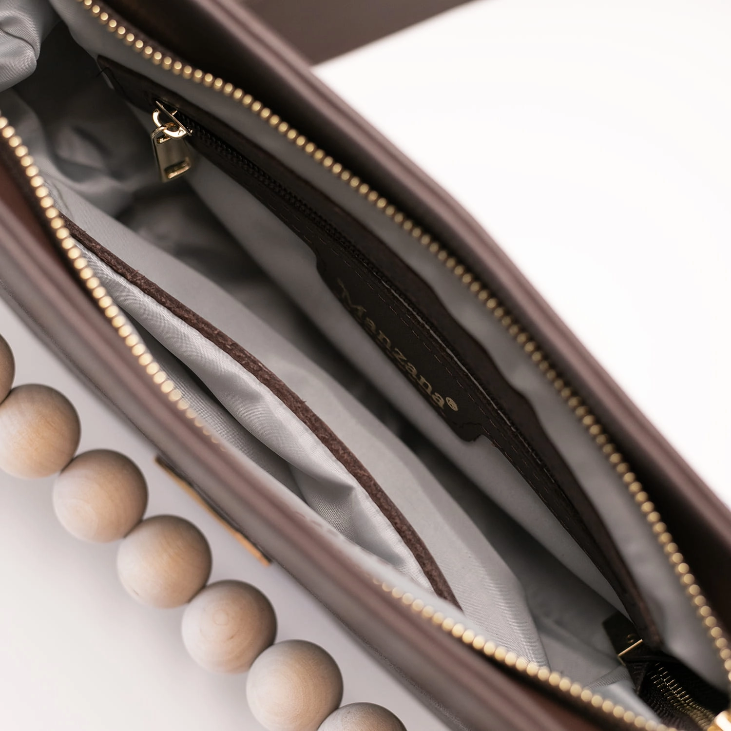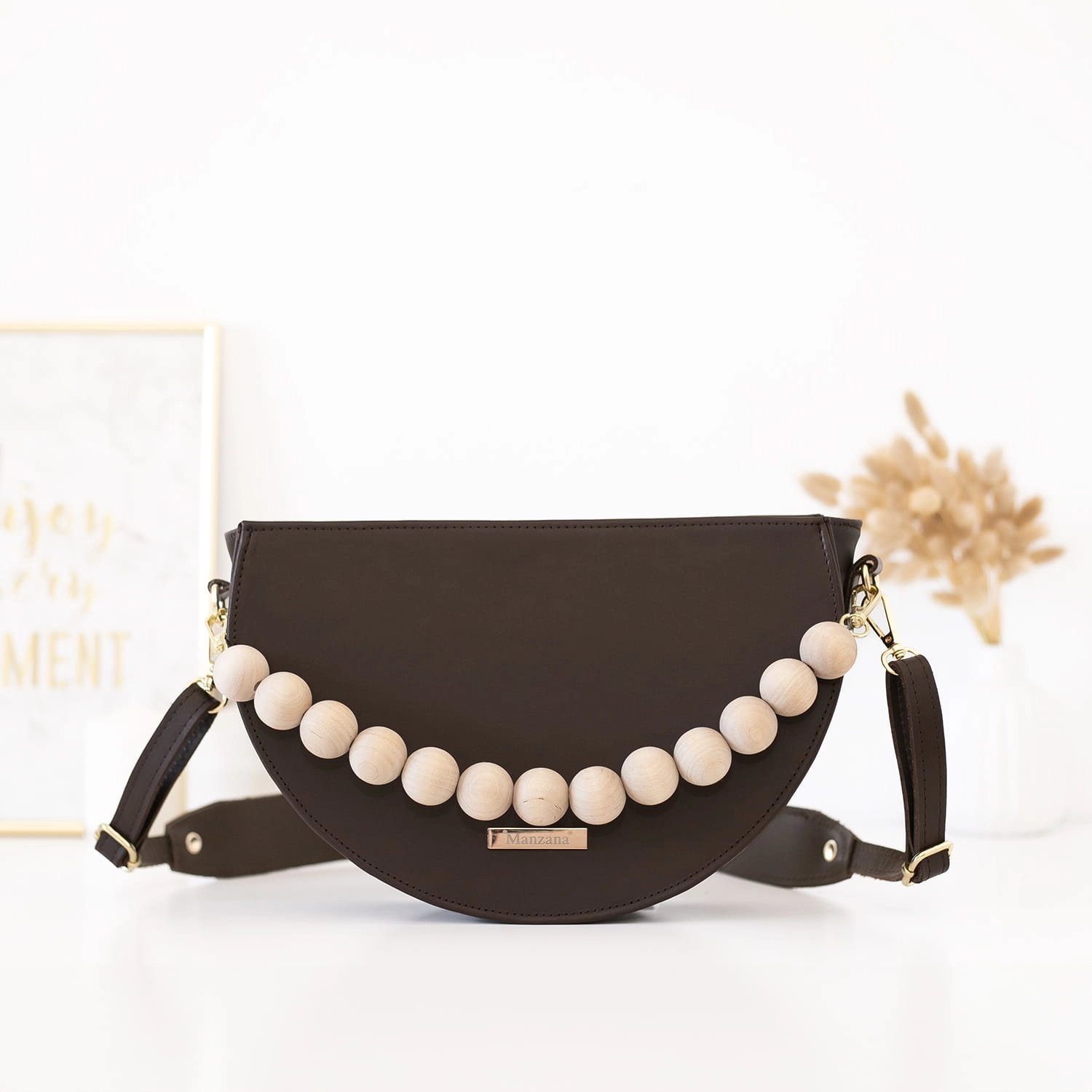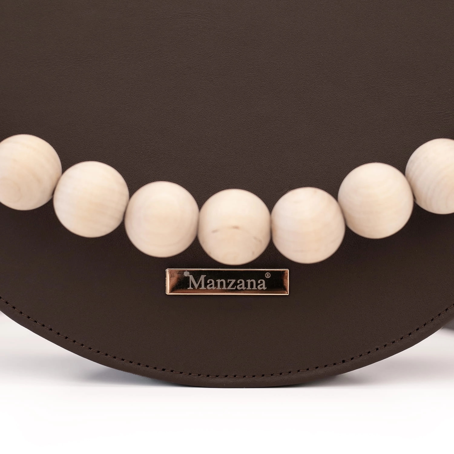 Torebka wykonana jest w całości z matowej naturalnej skóry w pięknym czekoladowym skórze ale to nie wszystko dodaliśmy drewniane korale w naturalnym kolorze drewna.