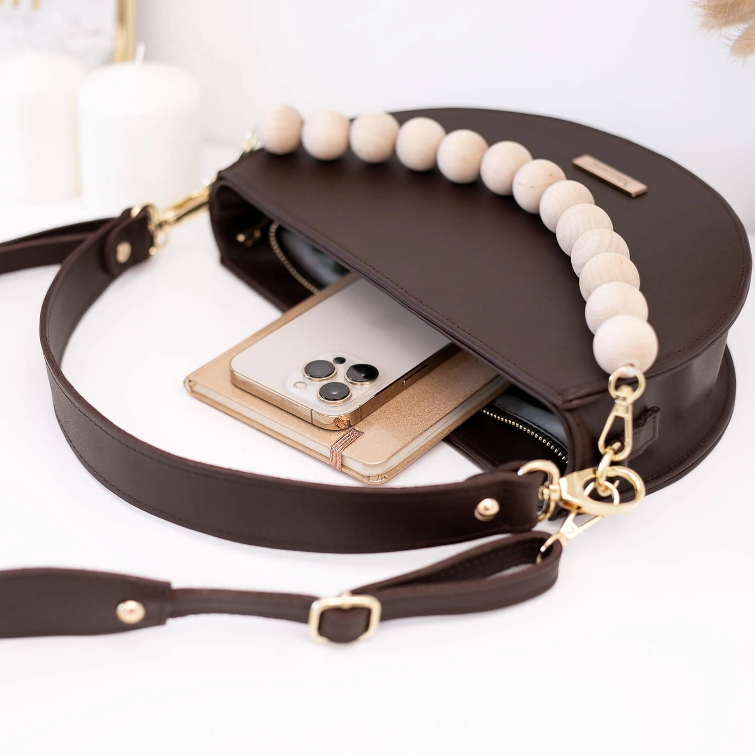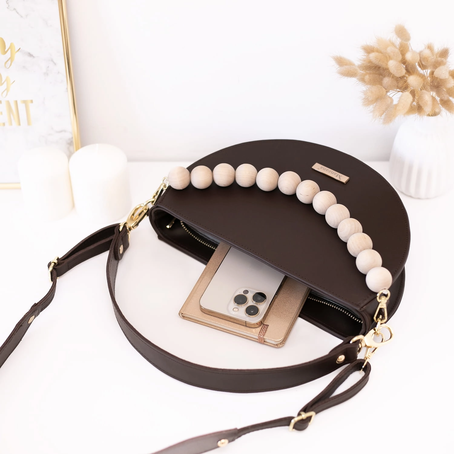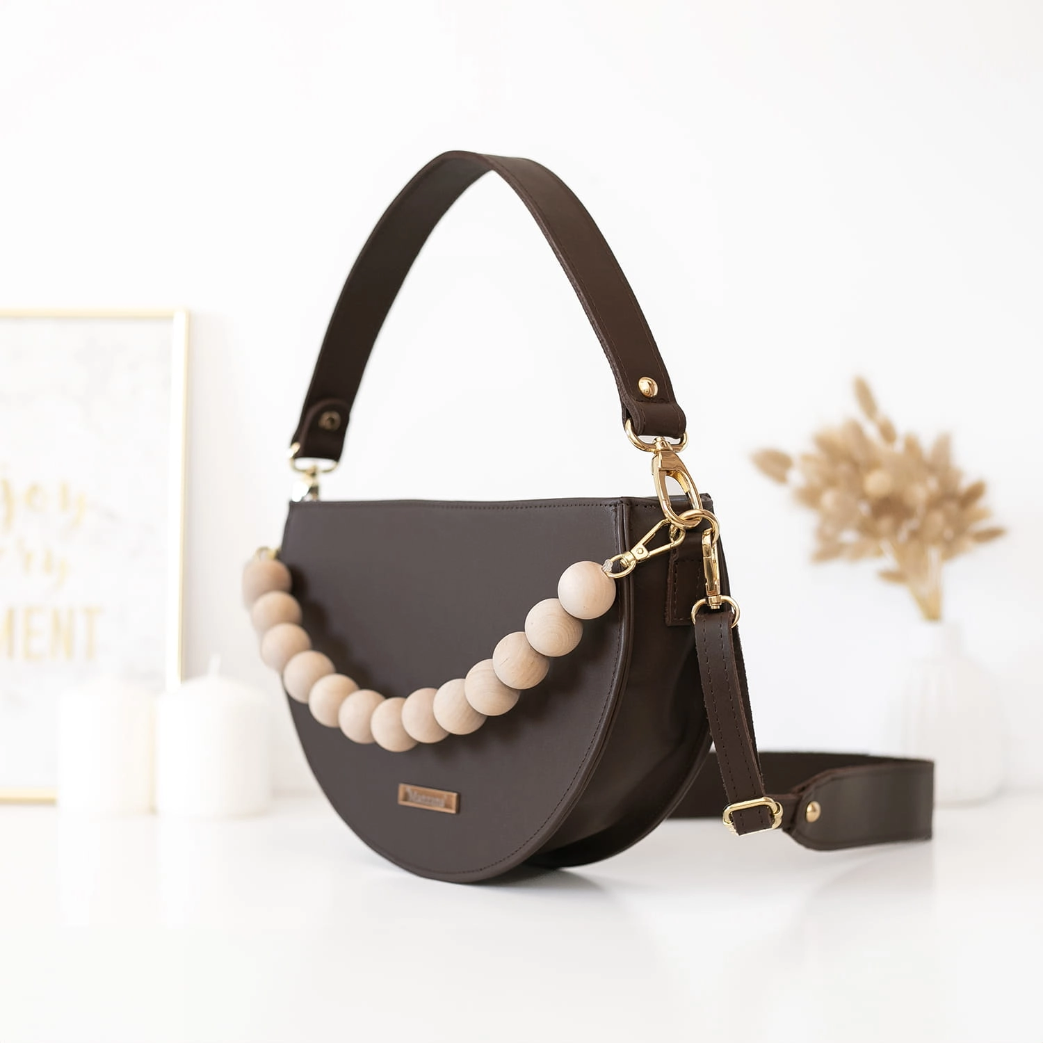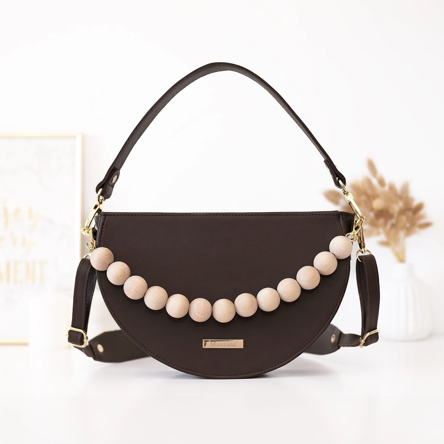 Torebka wykonana jest w całości z matowej naturalnej skóry w pięknym czekoladowym skórze ale to nie wszystko dodaliśmy drewniane korale w naturalnym kolorze drewna.