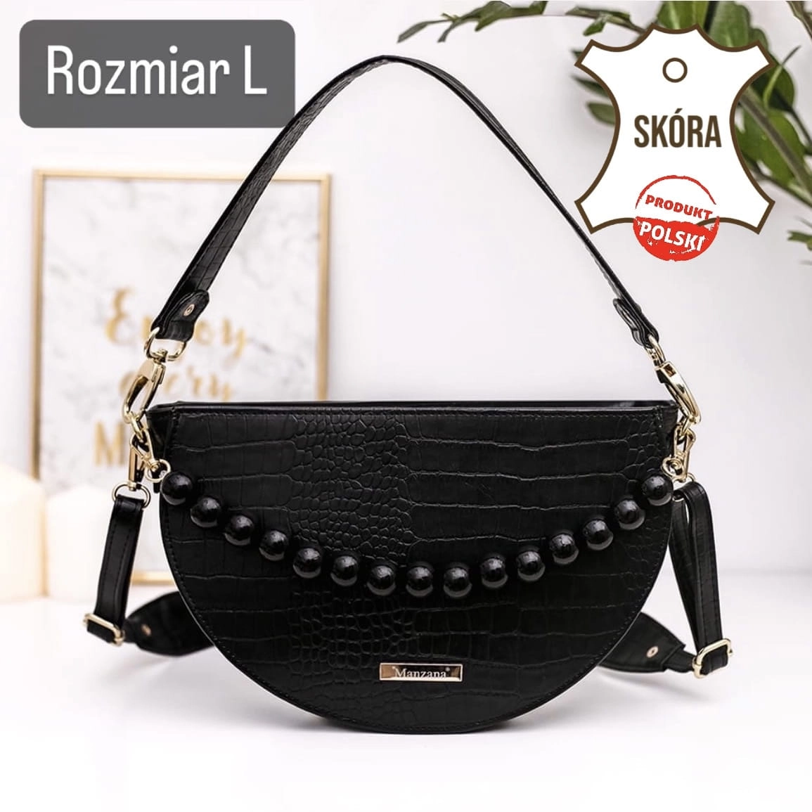 • Długi regulowany pasek z logo manzana