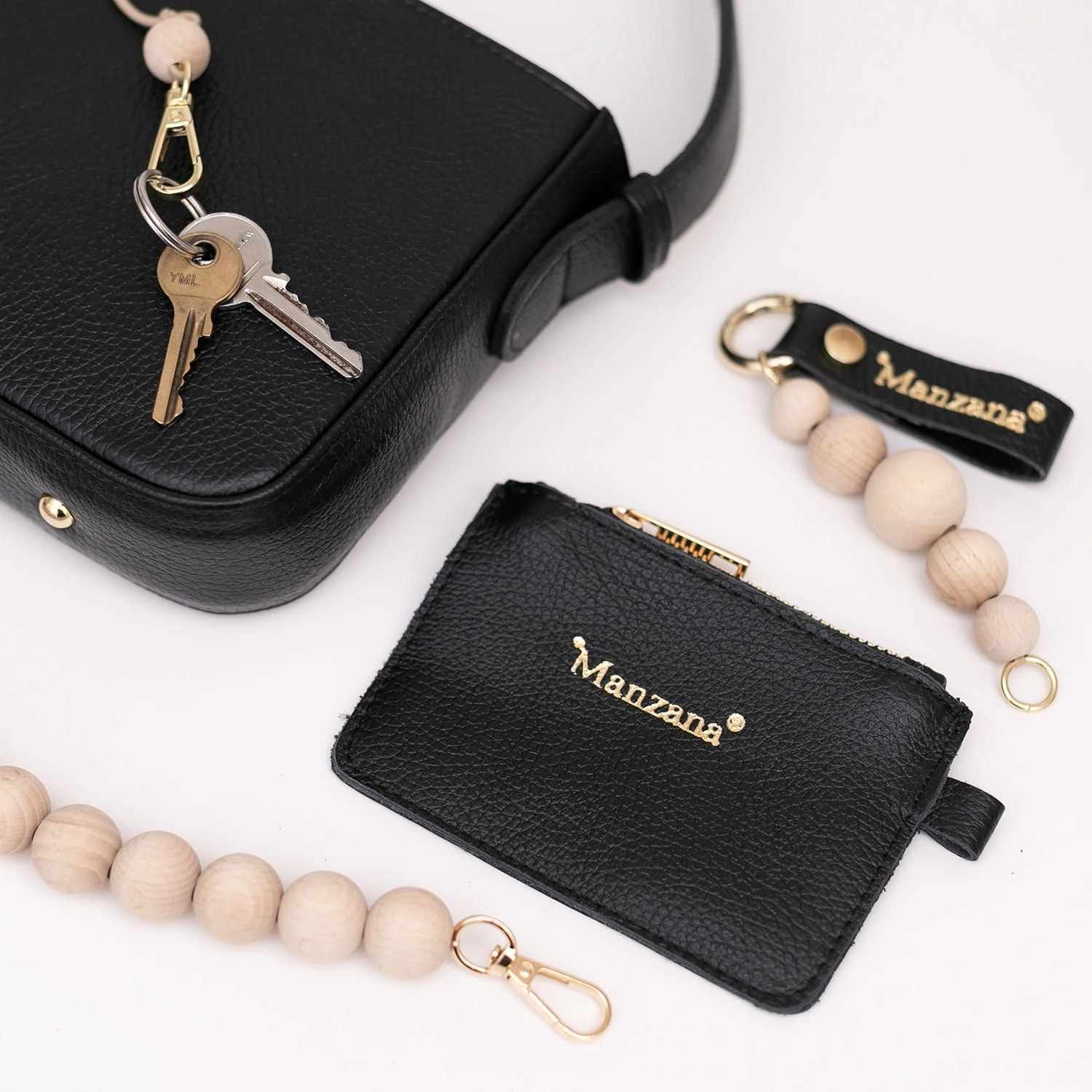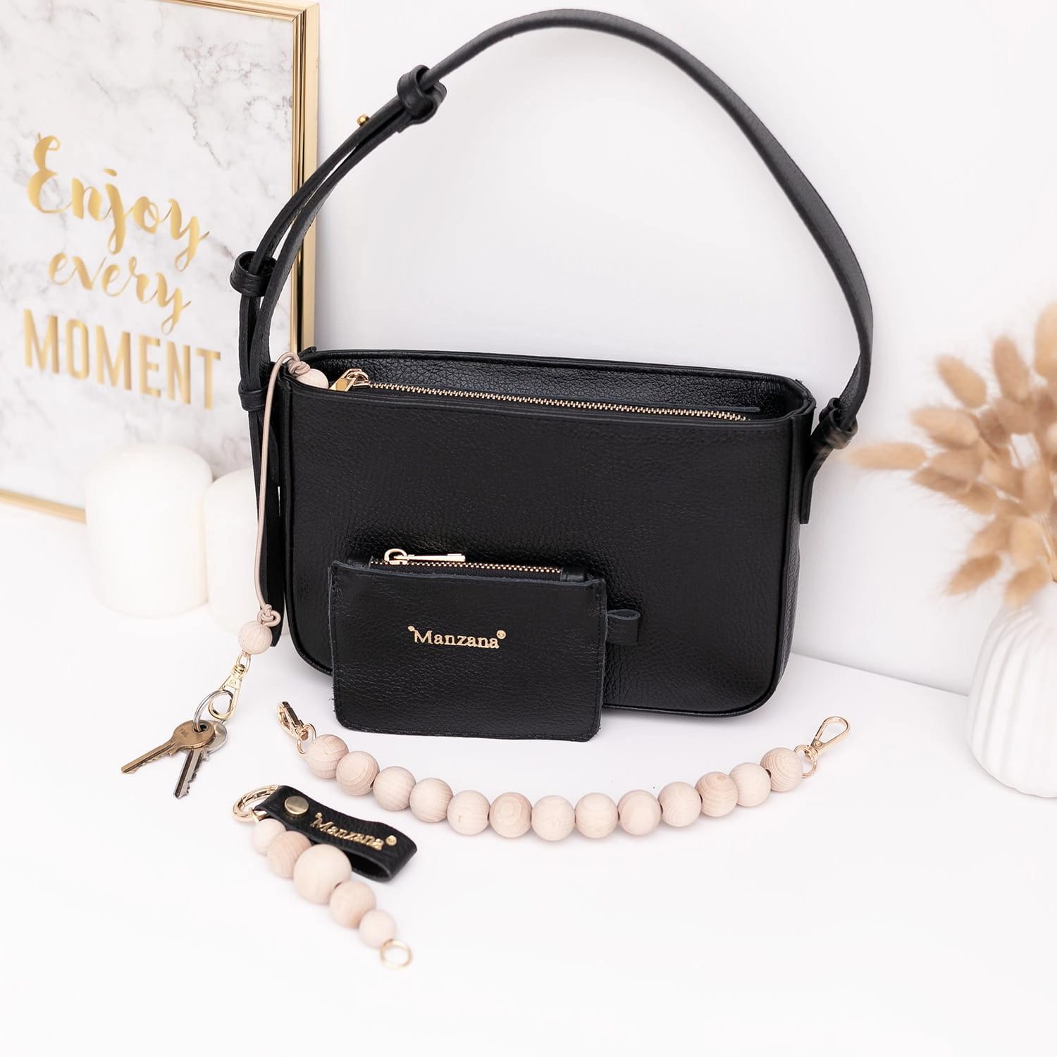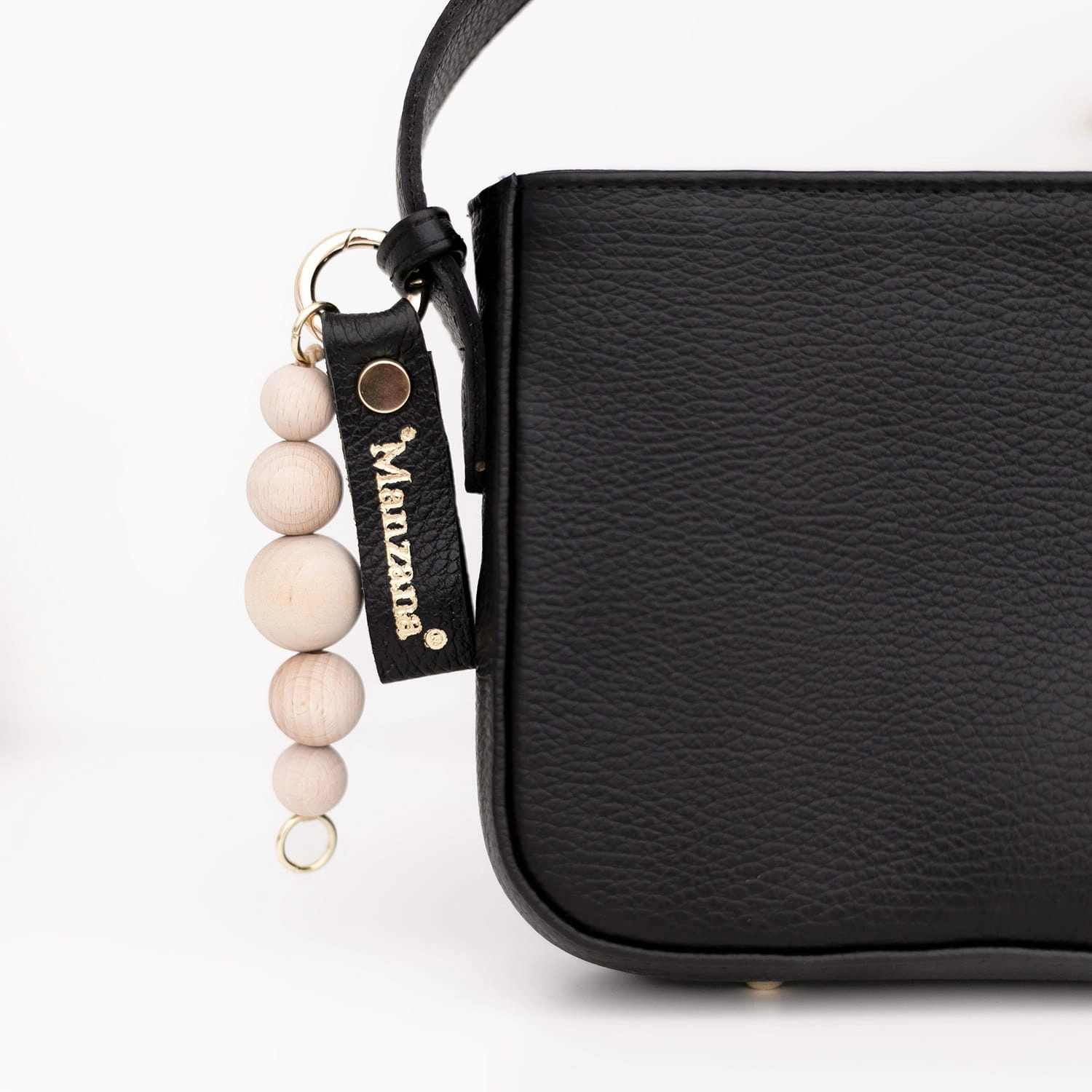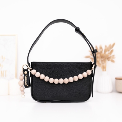 Torebka damska Manzana model Toledo czarna – naturalna skóra, rączka i brelok z koralami naturalnymi