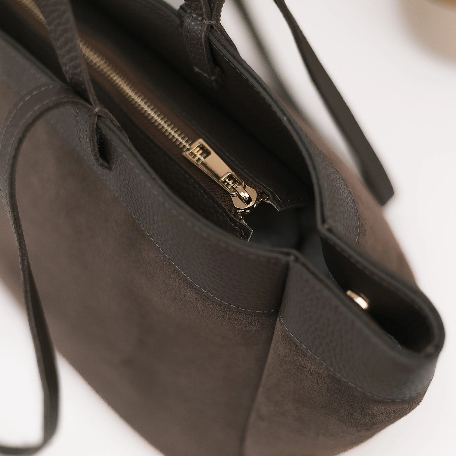 torebka manzana, manzana lanzarote, torebka skórzana damska, czarna torebka zamszowa, torebka do pracy A4, torebka na zamek, shopper skórzany, torba miejska, polska torebka handmade, naturalny zamsz, skóra naturalna, elegancka torebka damska
