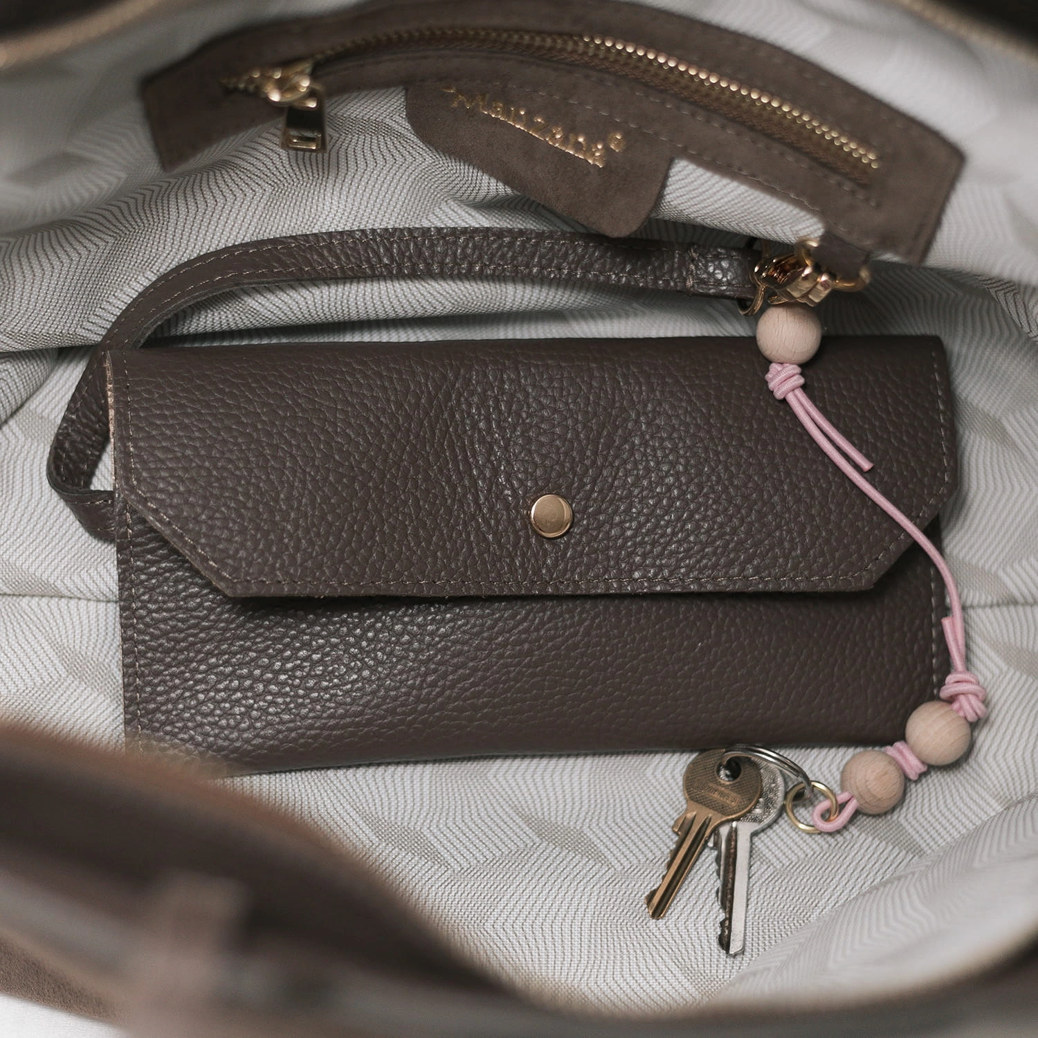 Wnętrze wykończone zostało jasną, wzorzystą bawełnianą podszewką. W środku znajduje się także dopasowana kosmetyczka z naturalnej skóry, którą możesz nosić osobno jako portfel lub małą kopertówkę. Torebka mieści format A4 i idealnie sprawdzi się zarówno do pracy, jak i na co dzień — w miejskim, nowoczesnym stylu.