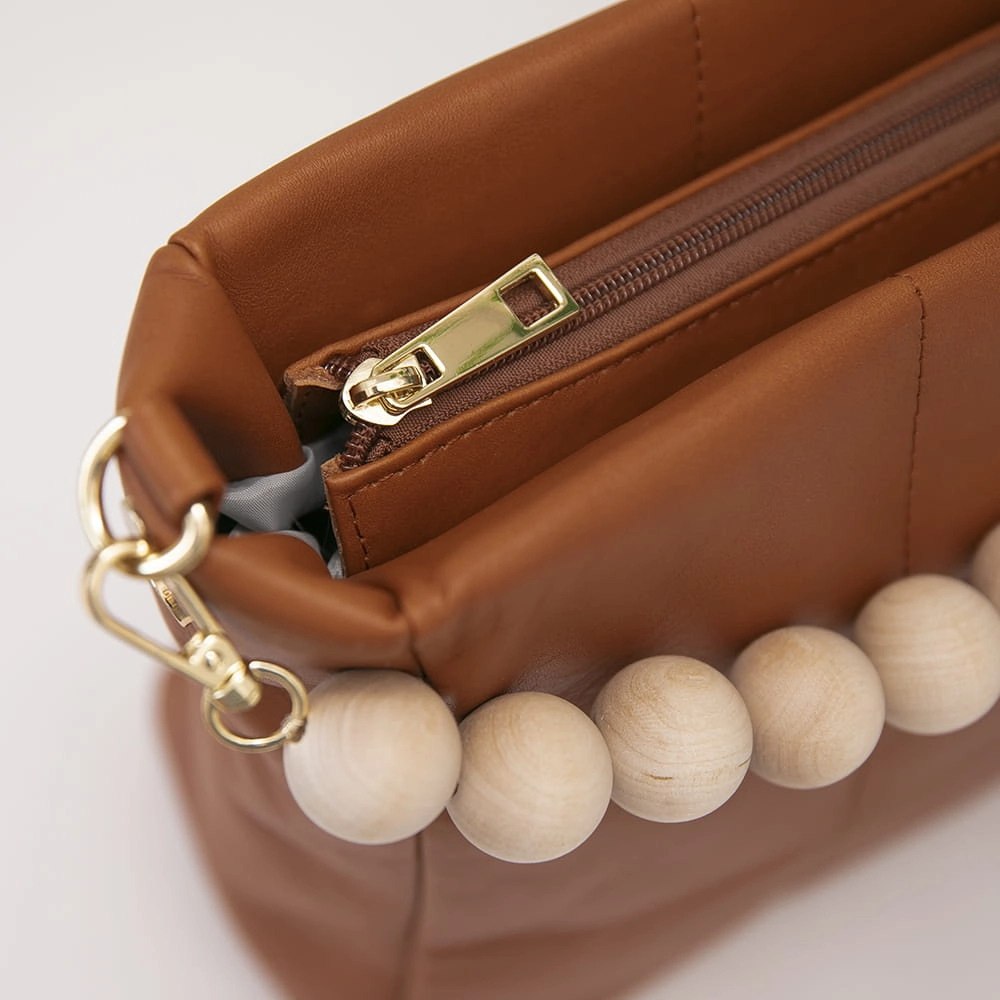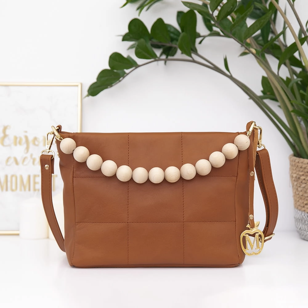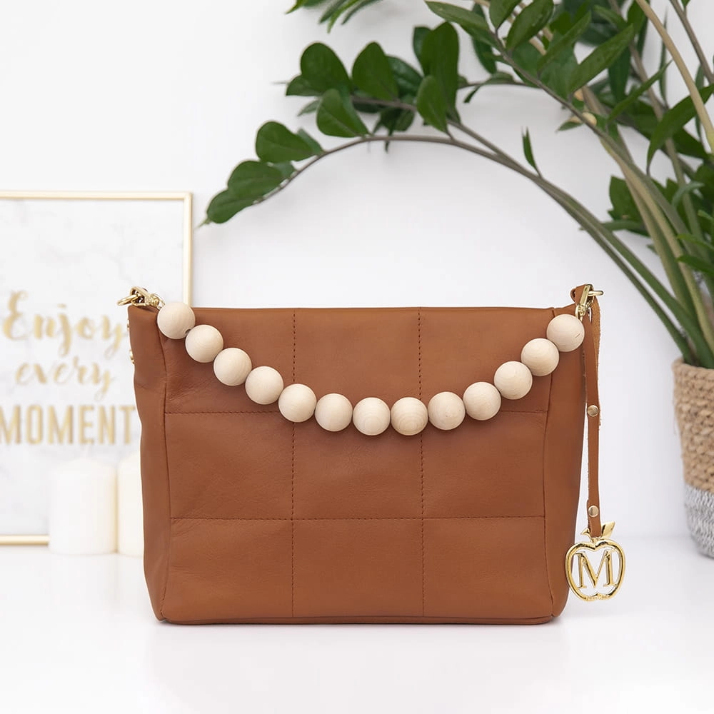 Do torebki dodaliśmy złote dodatki i drewniane naturalne korale, które przełamuje klasykę.
