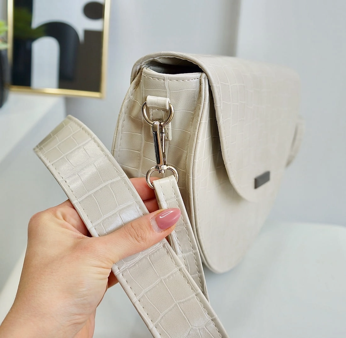 Elegancka listonoszka w ponadczasowym fasonie. Półksiężyc sztywny. Uszyta z pięknej matowej eko skóry krokodyla w kolorze beżowym NUDE.