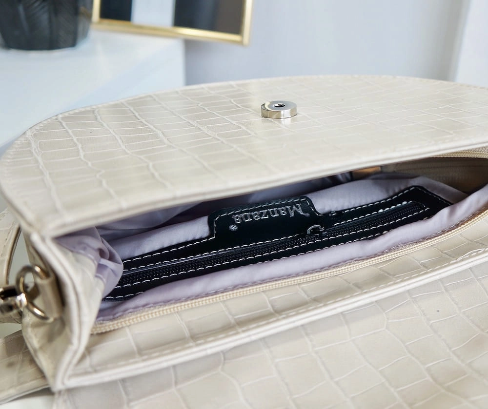 Torebka została uszyta z eko skóry imitacja krokodyla. Usztywniana, jednokomorowa, zapinana na magnetyczny nap.