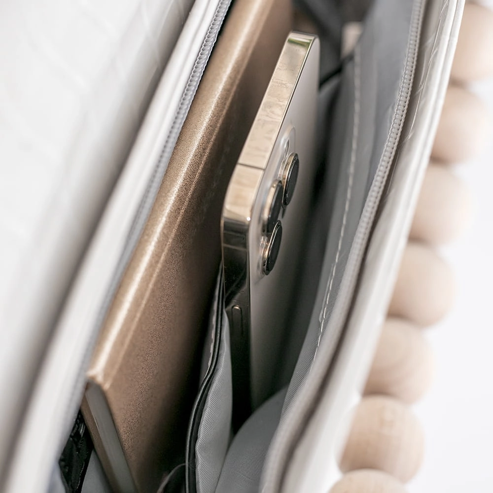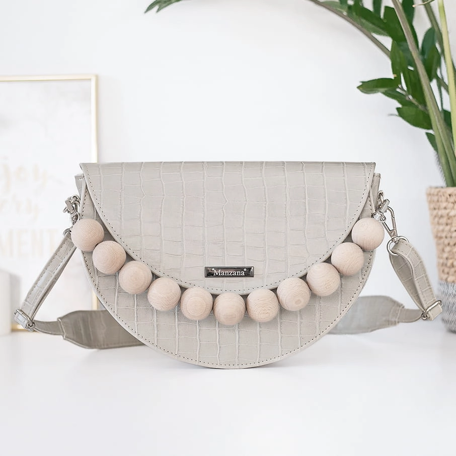 Materiał z jakiego została uszyta to eko skóra imitacja skóry krokodyla w kolorze jasnego beżu NUDE o matowym wykończeniu. Do torebki dodaliśmy duże korale w kolorze naturalnego drewna. Całość jest wyjątkowa i idealna na wiosnę i lato.