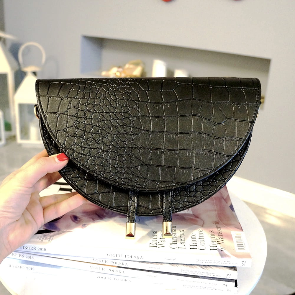Wykonana w całości w krokodylej eko skóry, jest nieco mniejsza od klasycznych, tradycyjnie spotykanych półksiężycowych listonoszek.
