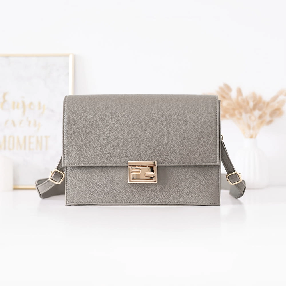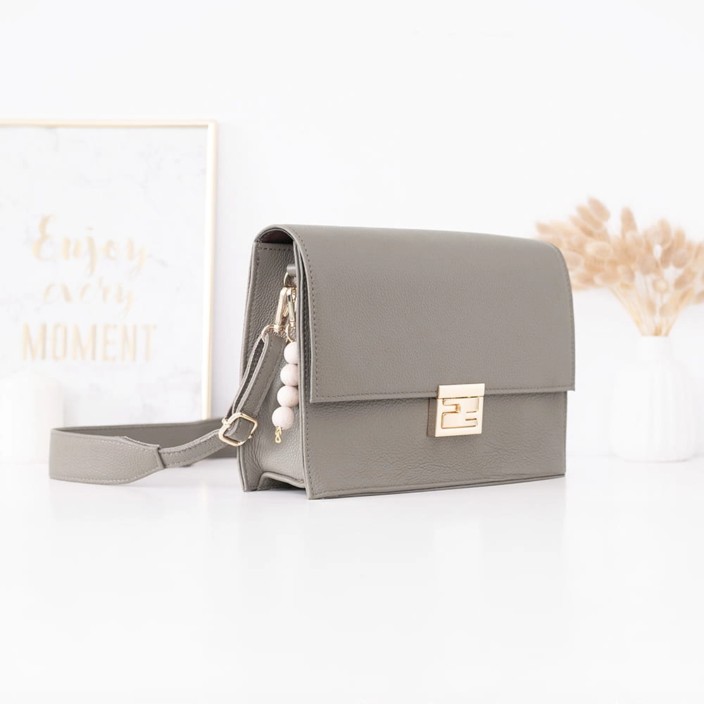 Torebka jest sztywna, posiada złote okucia a na klapce umieściliśmy złote modne zapięcie ale jak każdą torebkę Manzana możesz sama zaprojektować, dlatego w naszych opcjach możesz wybrać srebrne zapięcie oraz srebrne okucia.