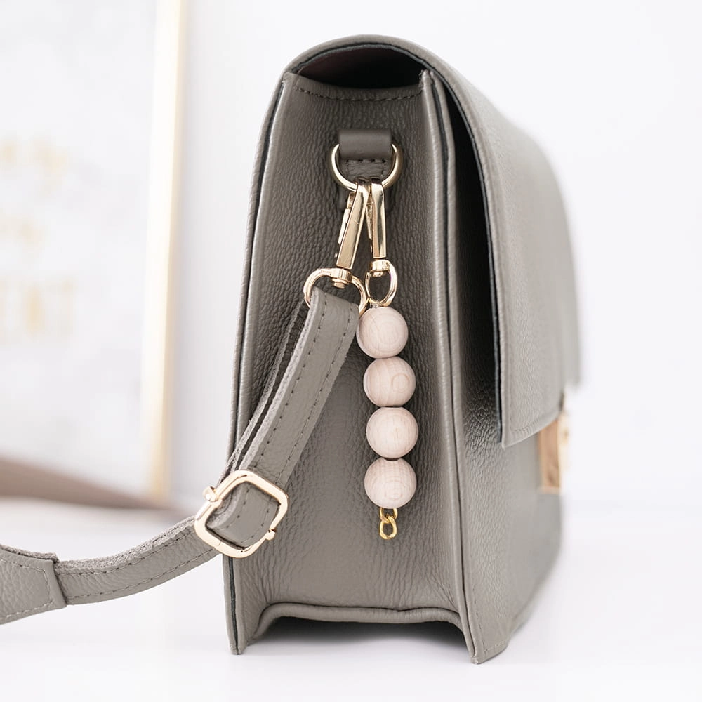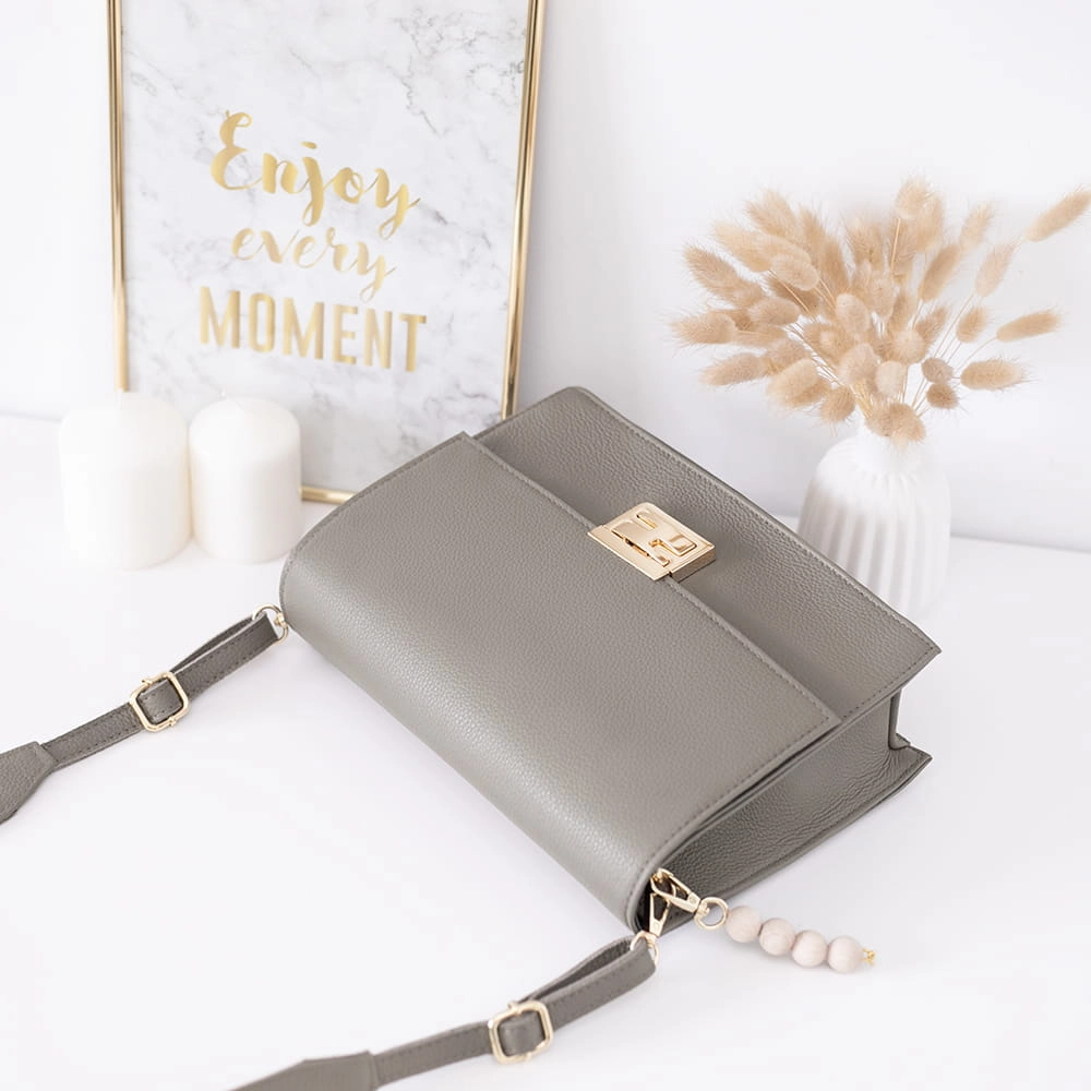 Elegancka listonoszka w kształcie mini teczki uszyta z naturalnej skóry w kolorze chłodnego beżu.