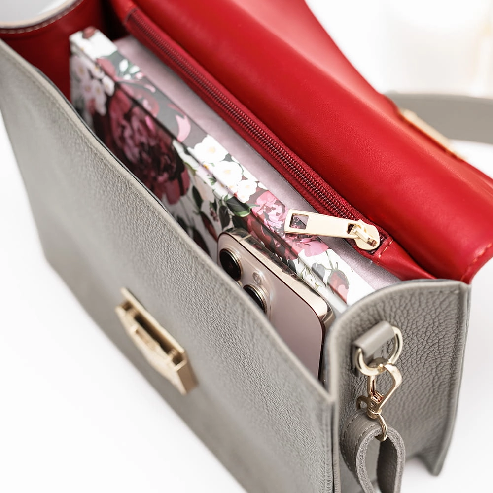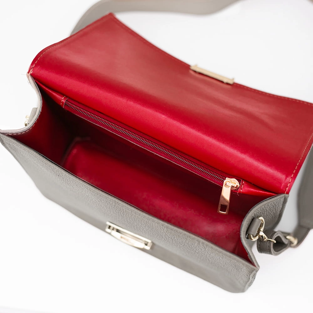 W środku torebka wykończona jest bordową skórą lub czerwonym zamszem i tu również wybór należy do Ciebie. Na zdjęciach jest opcja z czerwonym zamszem.