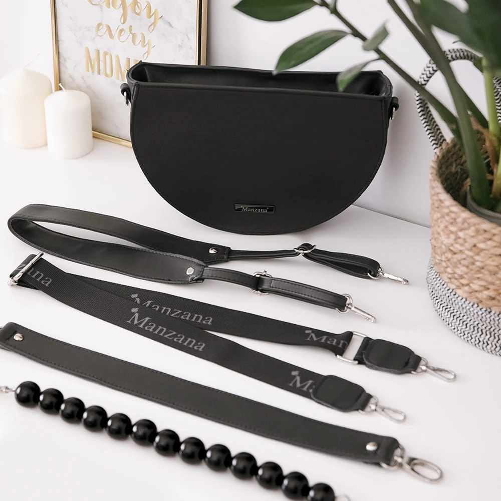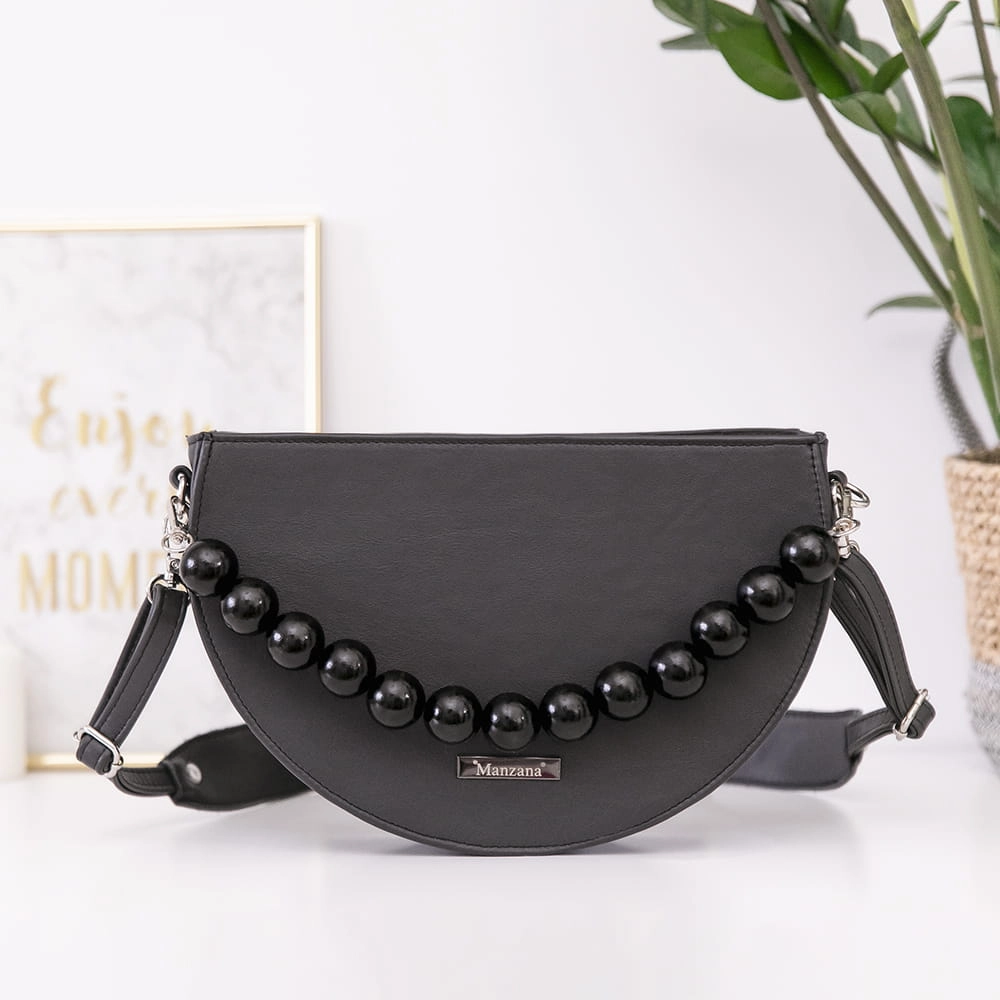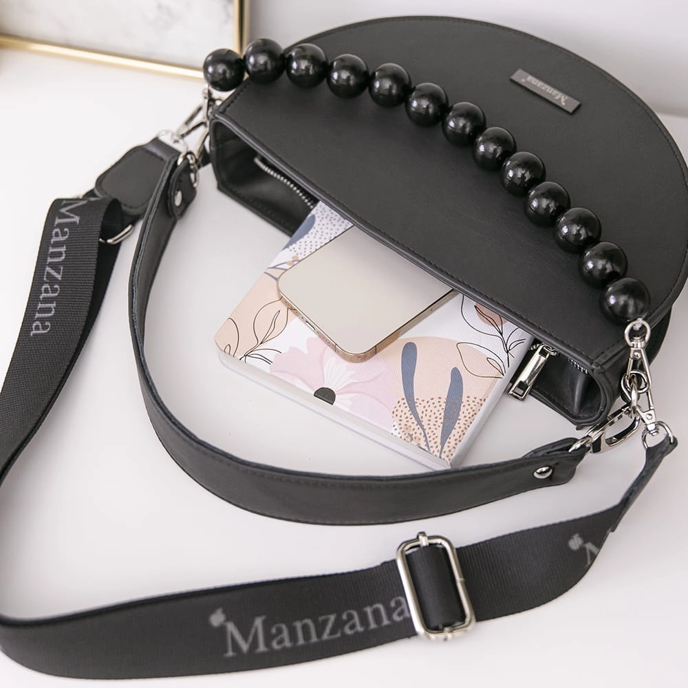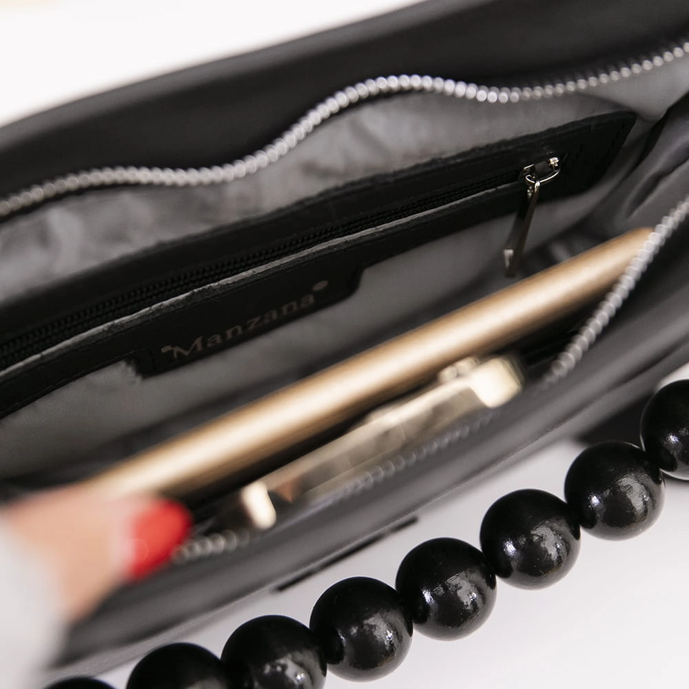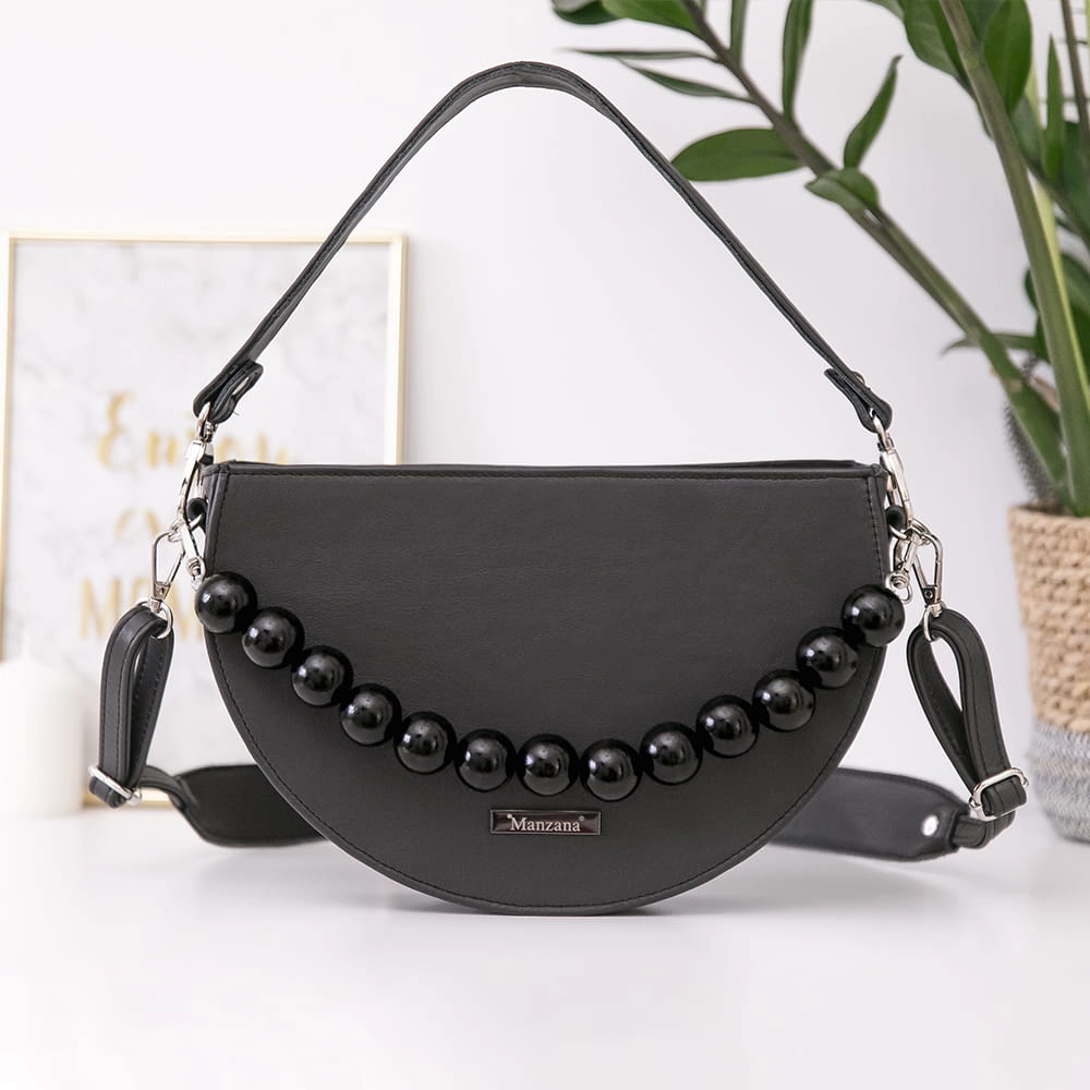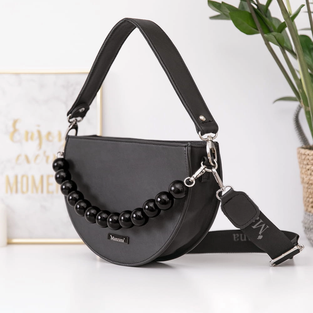 Zostawiliśmy wielkość listonoszki i dodaliśmy złote lub srebrne okucia, krótki pasek do ręki, kolejny pasek - raczka z drewnianymi koralami oraz długie regulowany pasek na ramię.