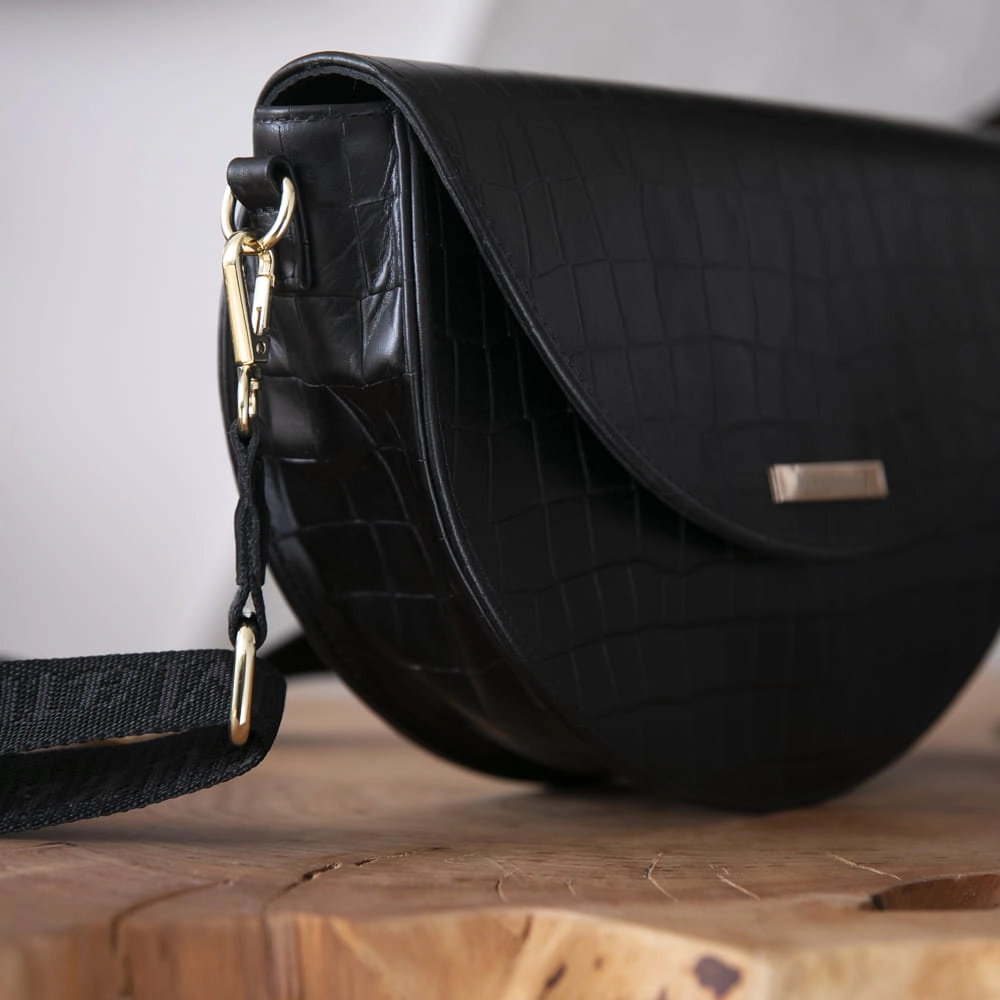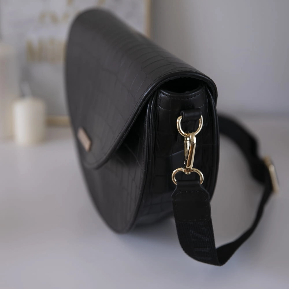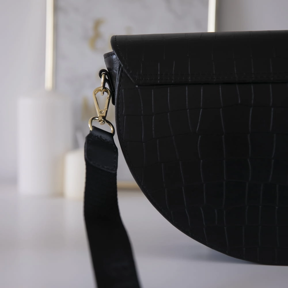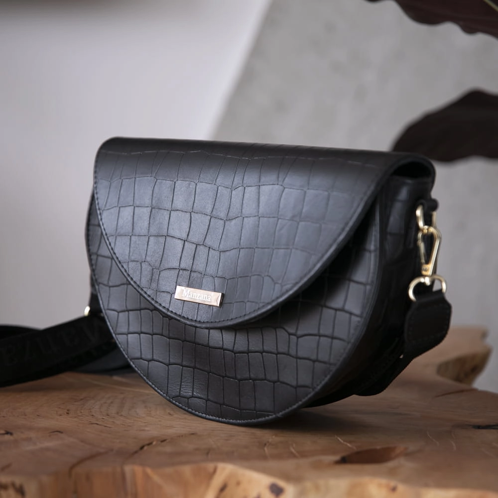 Jeśli do tej pory nie znalazłaś torebki o klasycznym designie, która doskonale zaprezentuje się zarówno w bardzo eleganckiej stylizacji na wielkie uroczystości, jak i w codziennym looku, to mamy dla Ciebie doskonałą propozycję. Listonoszka w kształcie półksiężyca z naszej edycji limitowanej to połączenie wysokiej jakości skóry naturalnej i perfekcyjnego wykończenia. Posiada pół matowe wykończenie a kolor okuć możesz sama wybrać złote lub srebrne. Klasyczny czarny piękny odcień skóry krokodyla.