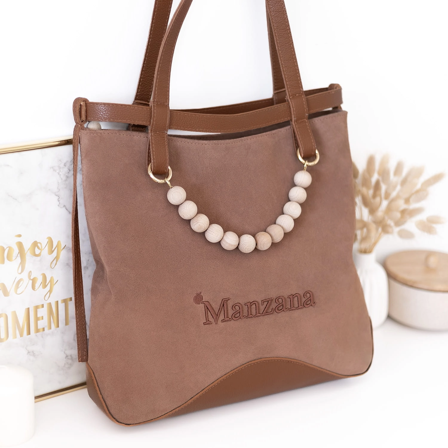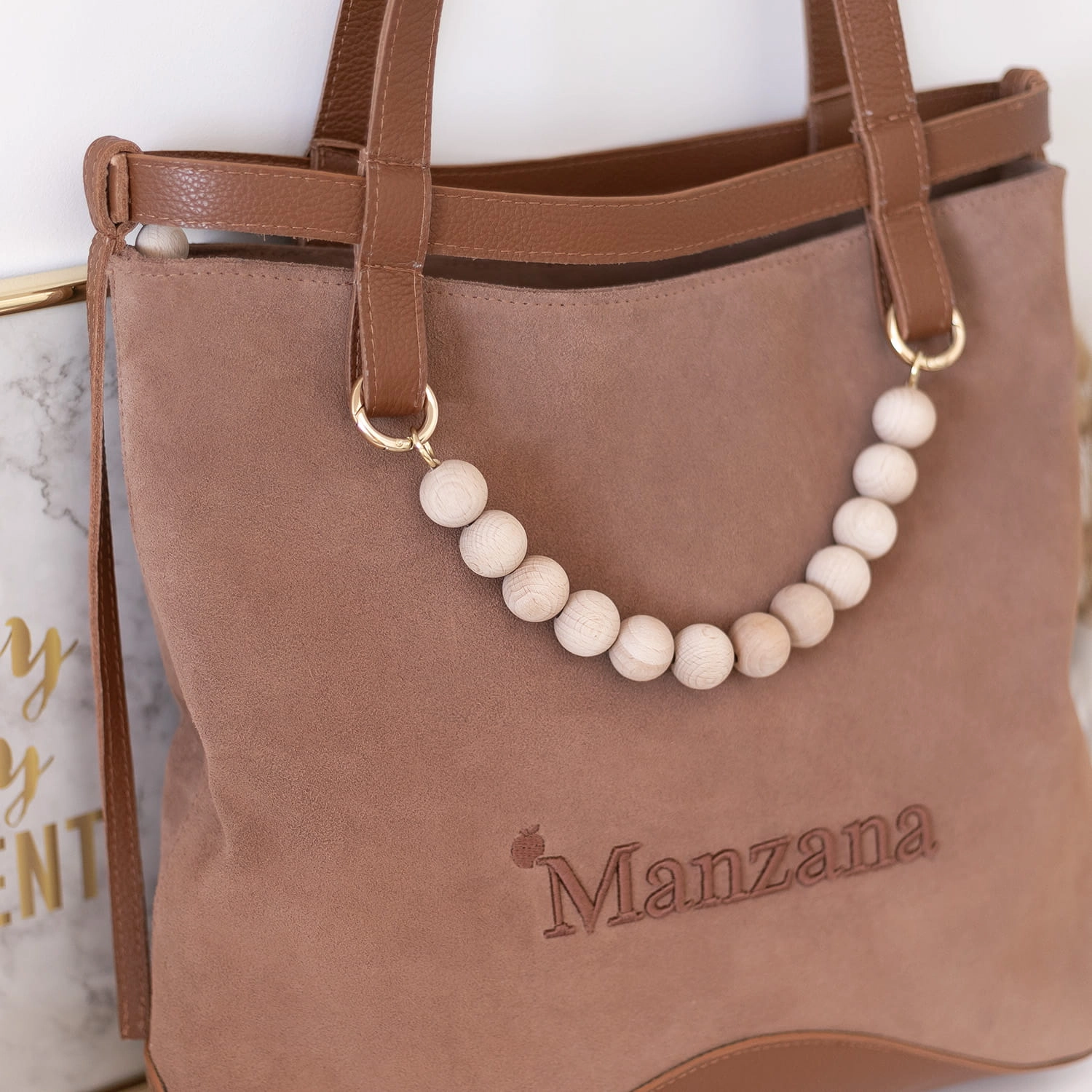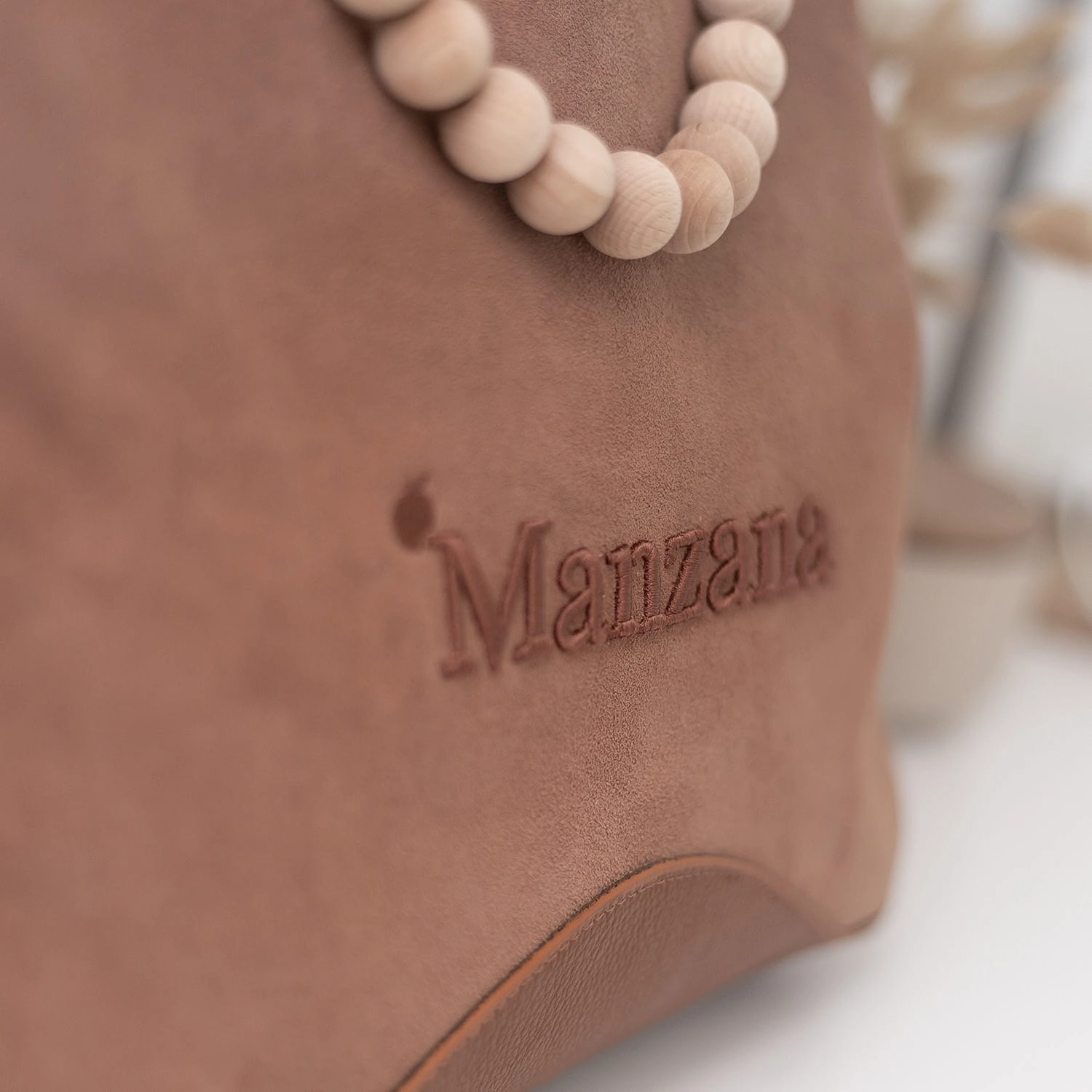 Na froncie torebki znajduje się subtelne, wyszywane logo Manzana z efektem 3D, które nadaje jej luksusowego charakteru. Całość dopełniają długie skórzane rączki oraz dekoracyjny akcent w postaci drewnianych korali.