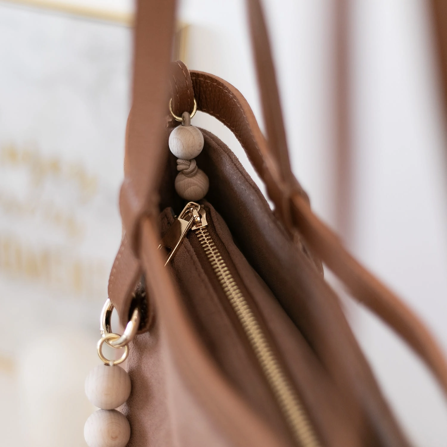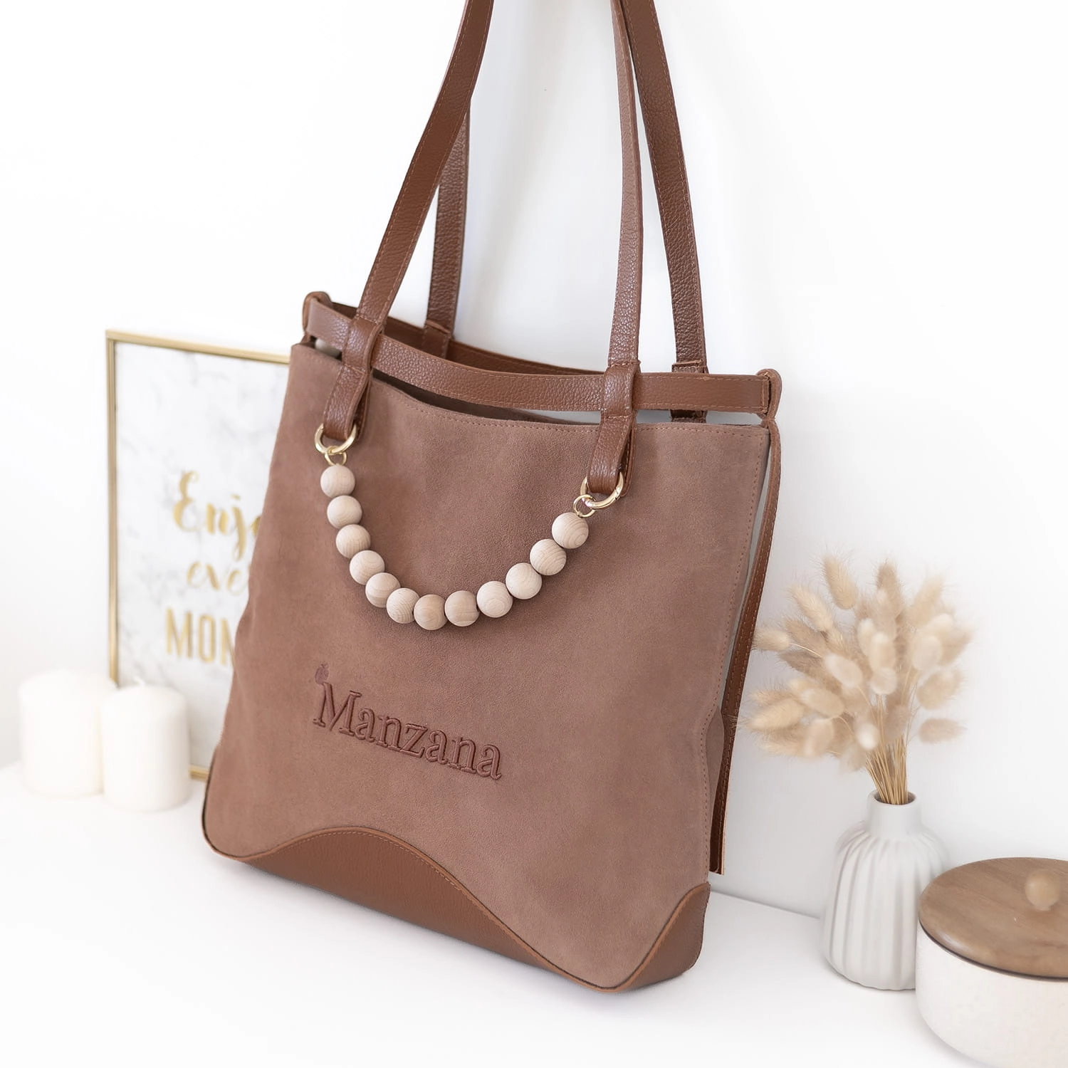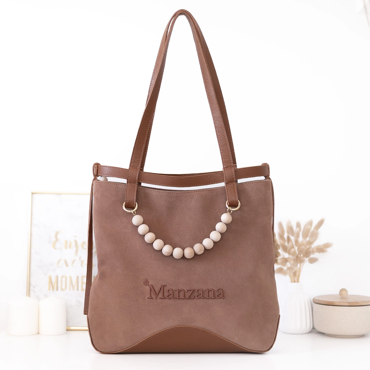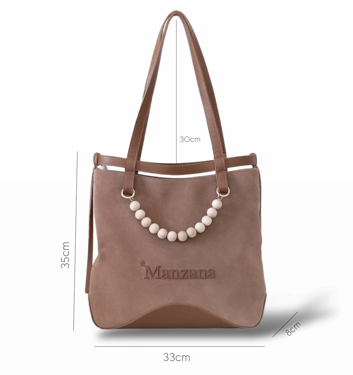 Na froncie torebki znajduje się subtelne, wyszywane logo Manzana z efektem 3D, które nadaje jej luksusowego charakteru. Całość dopełniają długie skórzane rączki oraz dekoracyjny akcent w postaci drewnianych korali.