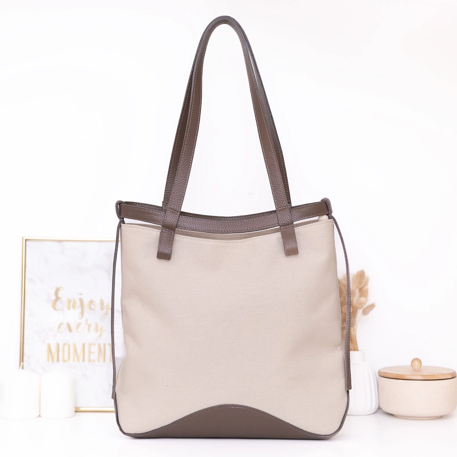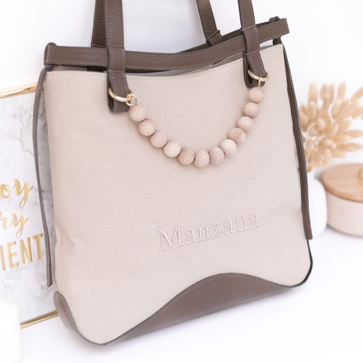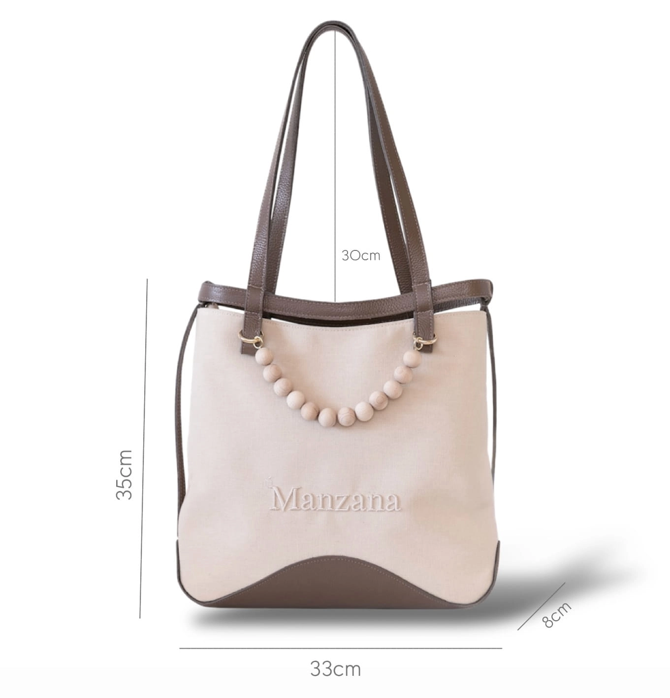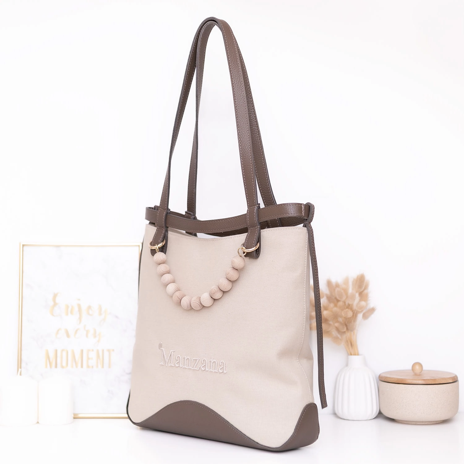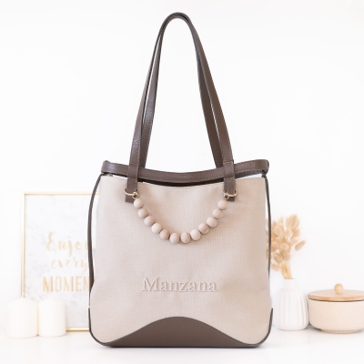 Stylowa i praktyczna – torebka Manzana z bawełny 100% i brązowej skóry naturalnej. Pojemna, elegancka i wygodna – idealna na co dzień, do pracy i na spotkania.