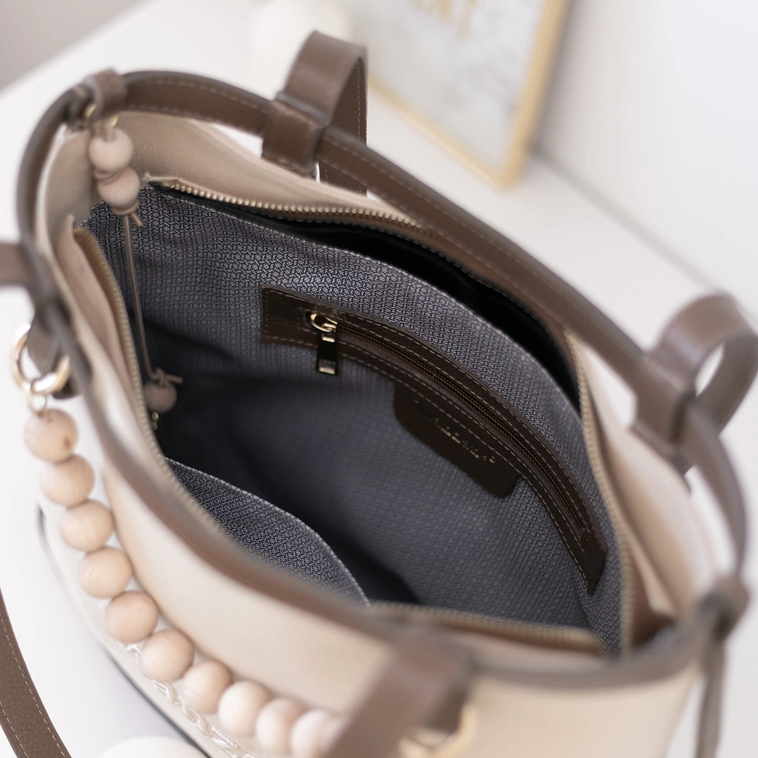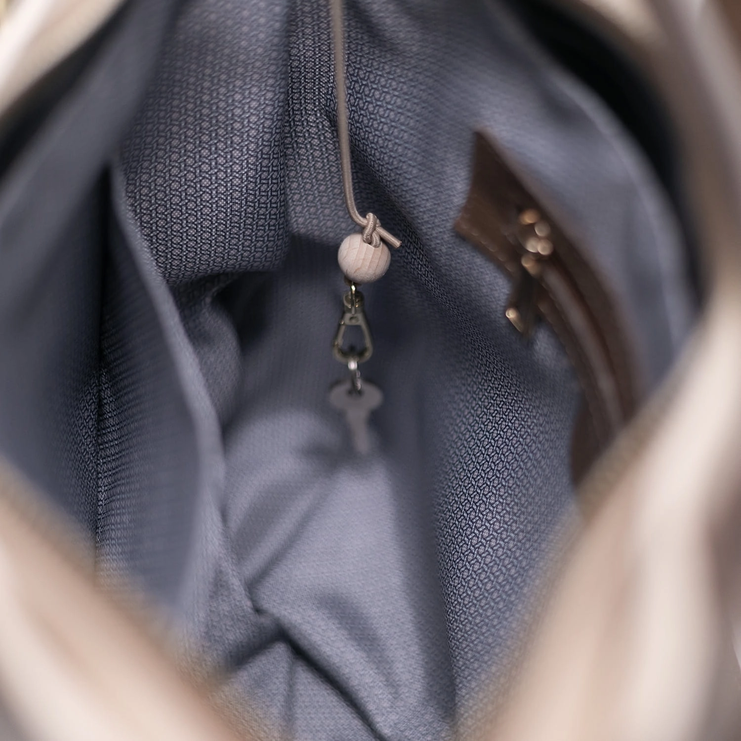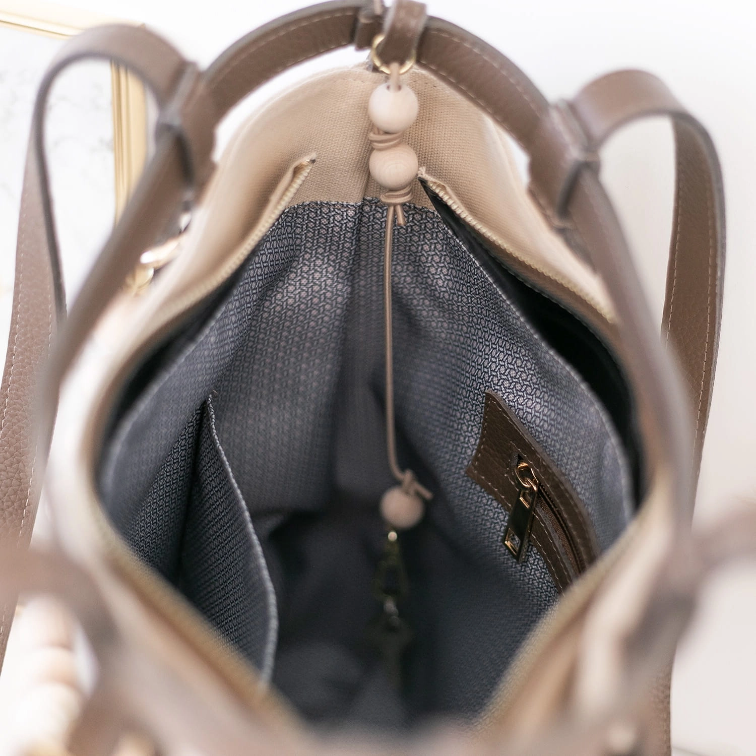 Wnętrze torebki zostało starannie zaprojektowane – wyłożone elegancką podszewką w jasnym kolorze, wyposażone w liczne kieszonki, w tym jedną zapinaną na suwak. Dodatkowym atutem jest praktyczny gadżet – funkcjonalne zapięcie na klucze, dzięki któremu znajdziesz je zawsze na swoim miejscu.