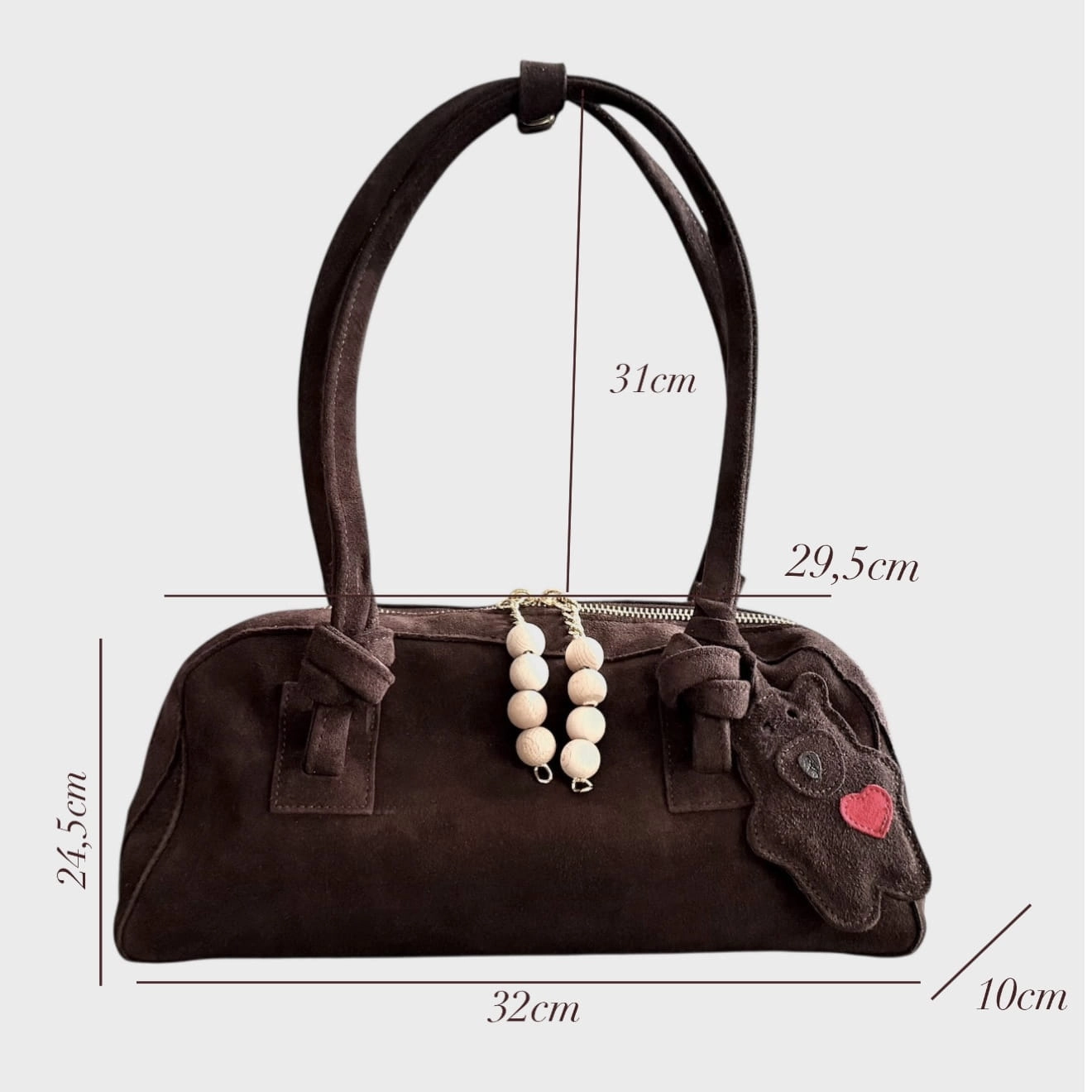 torebka zamszowa damska, torebka skórzana zamsz, elegancka torebka brązowa, torebka handmade, polska torebka skórzana, torebka premium, torebka z drewnianymi koralami, torebka Manzana, torebka na ramię zamszowa