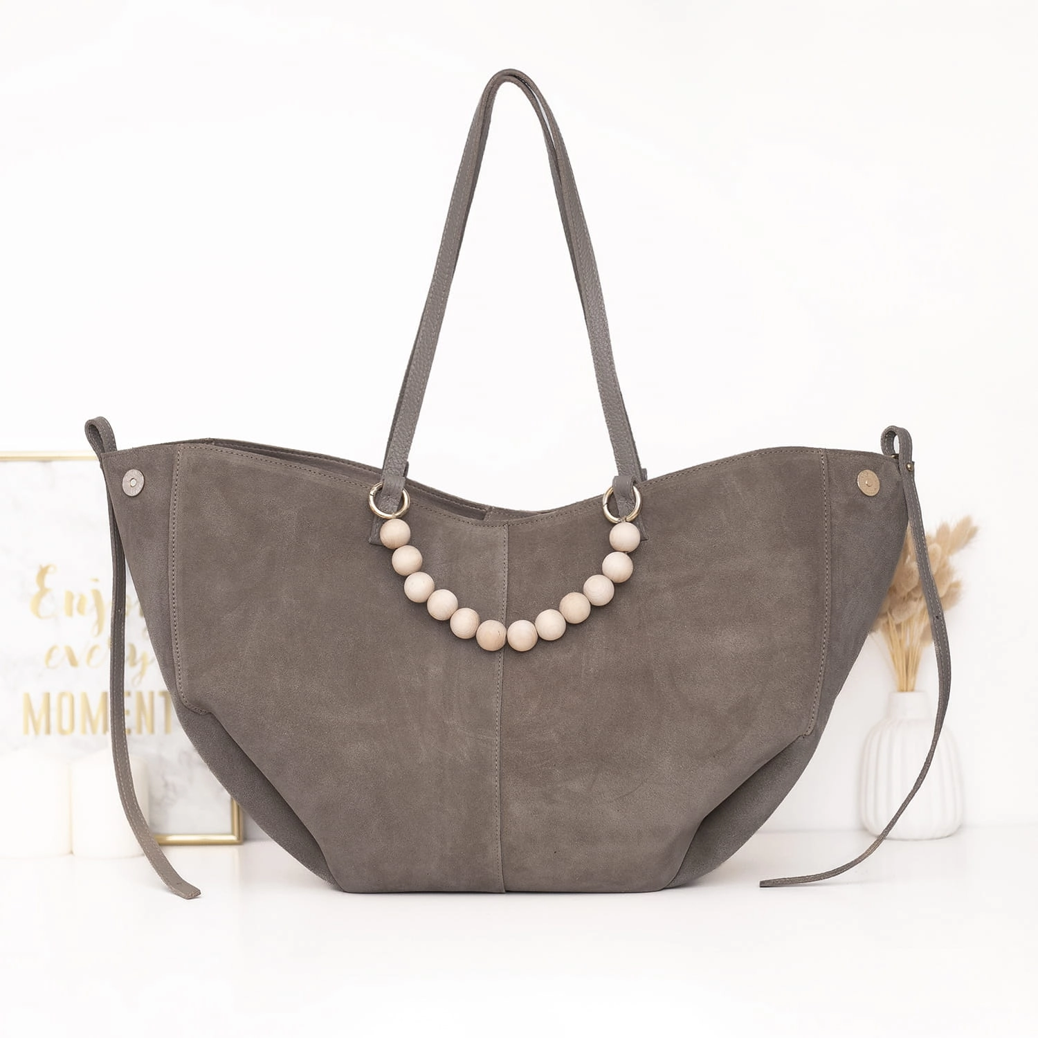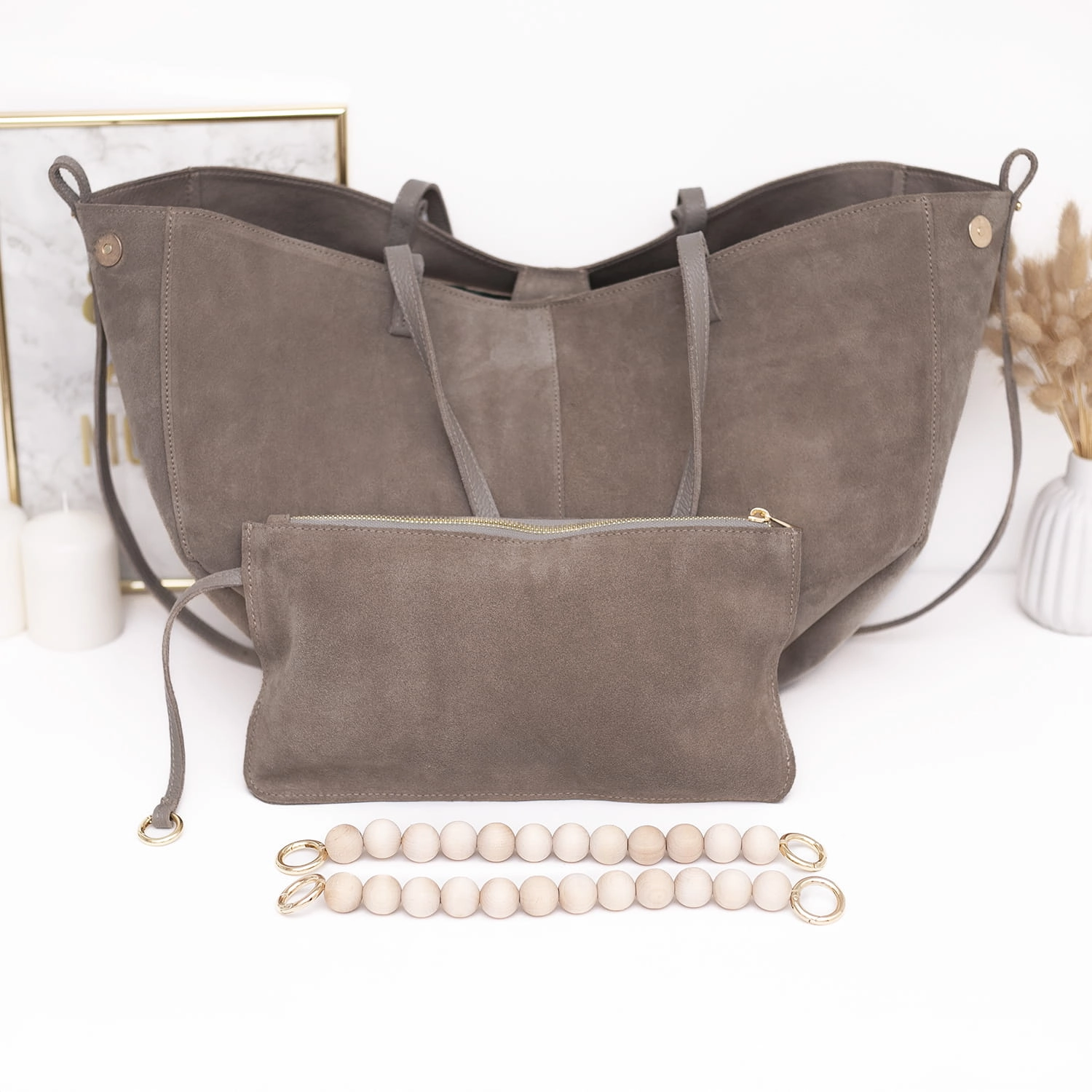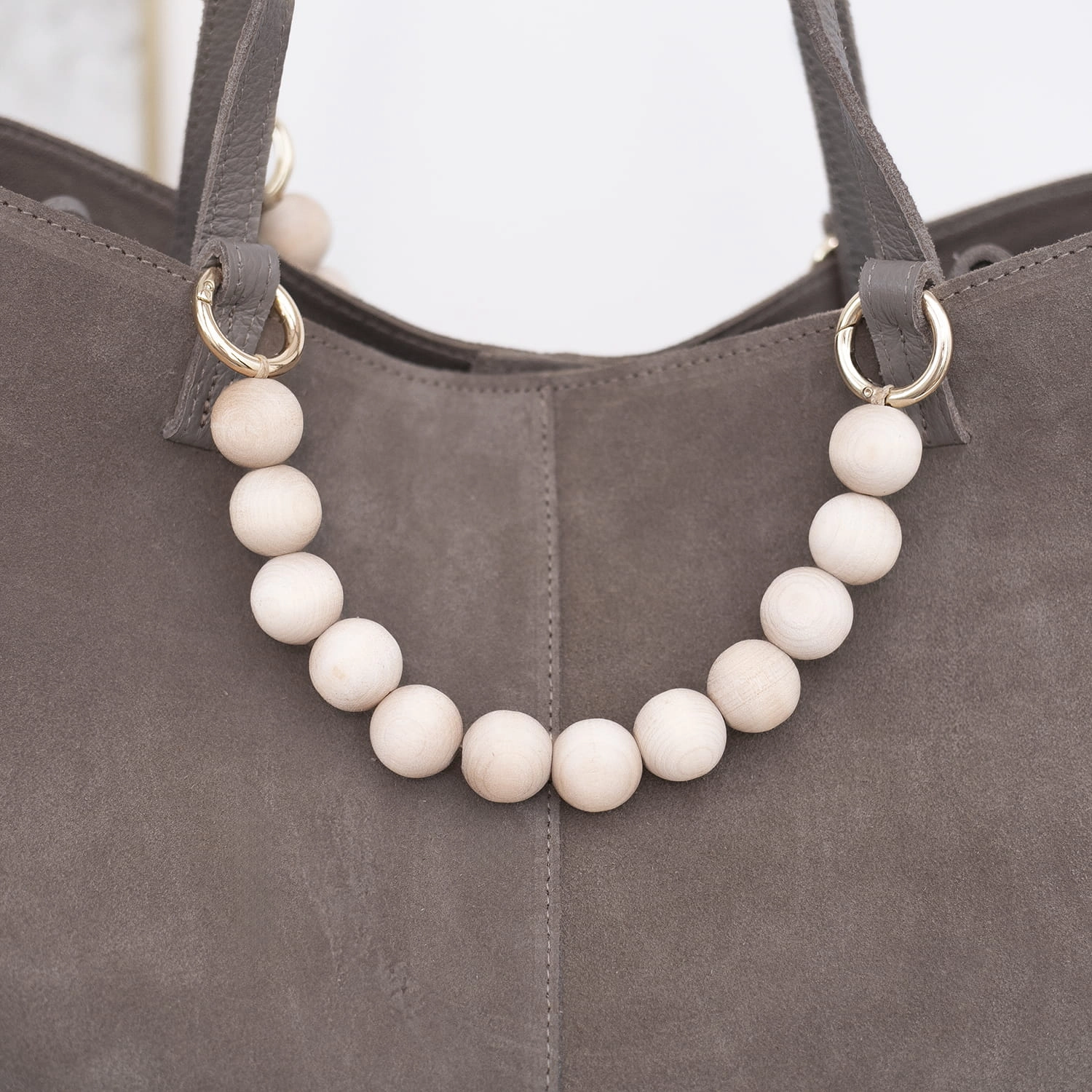 W zestawie znajduje się również dopinana kosmetyczka na drobiazgi oraz wyjątkowa rączka z naturalnych, drewnianych korali, która nadaje torebce unikalny charakter.