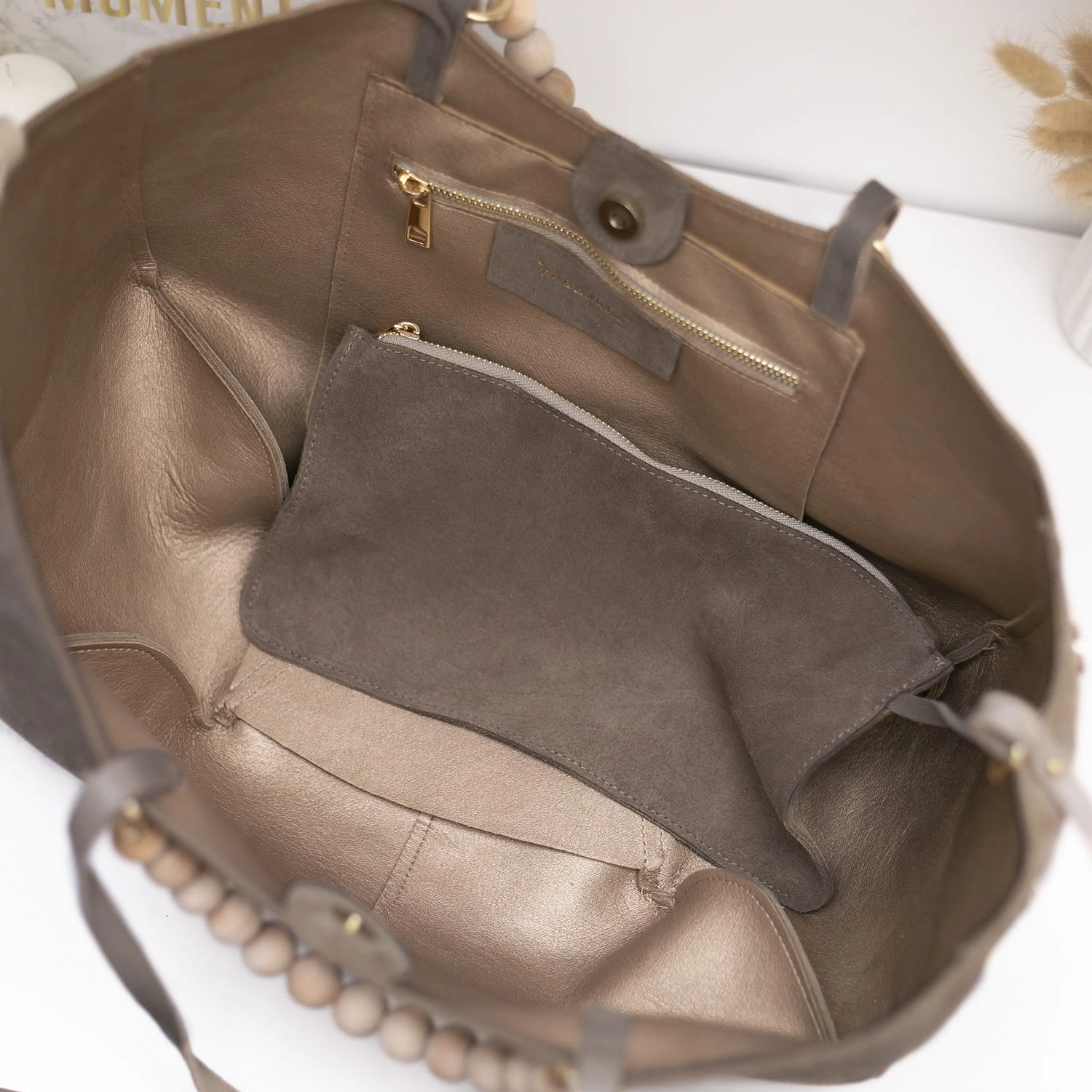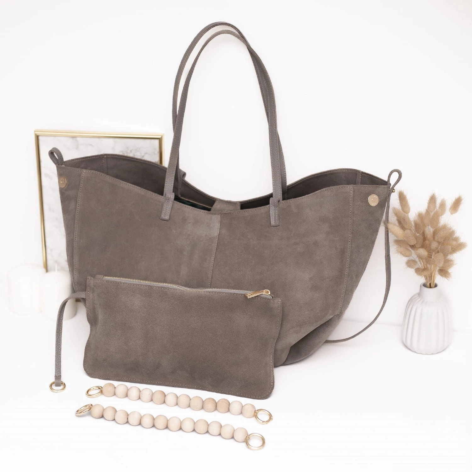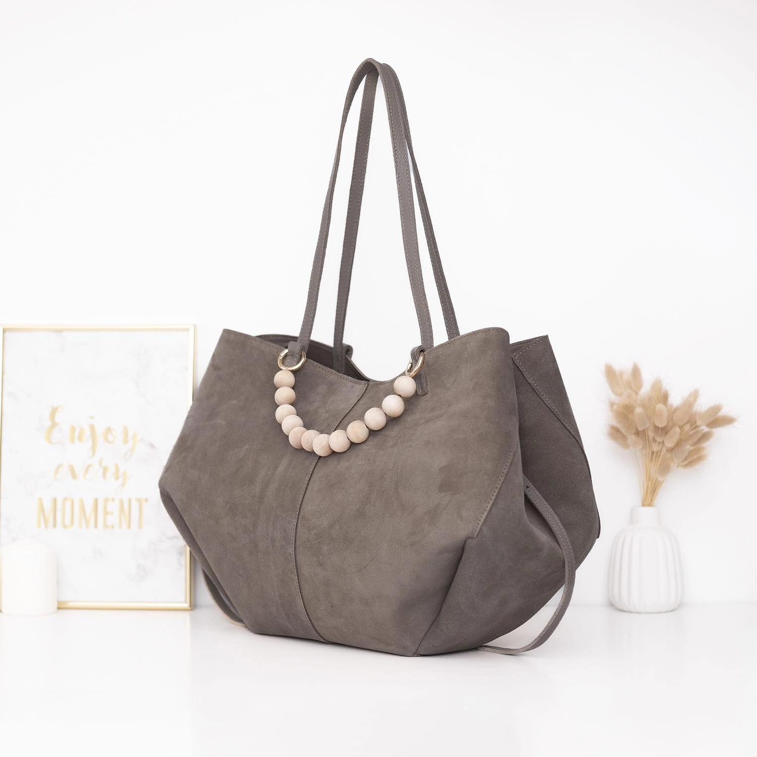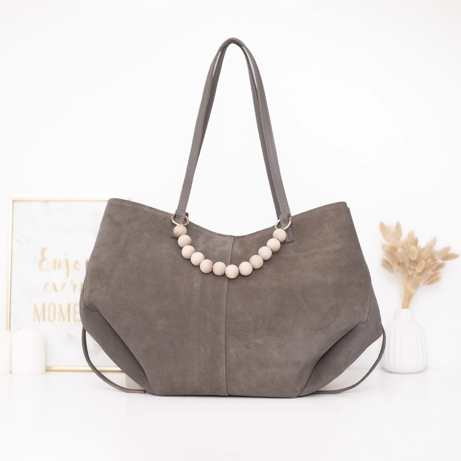 W zestawie znajduje się również dopinana kosmetyczka na drobiazgi oraz wyjątkowa rączka z naturalnych, drewnianych korali, która nadaje torebce unikalny charakter.