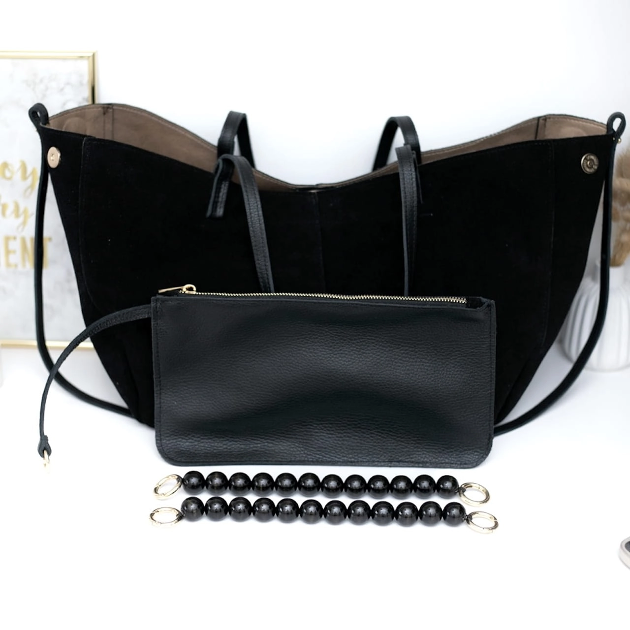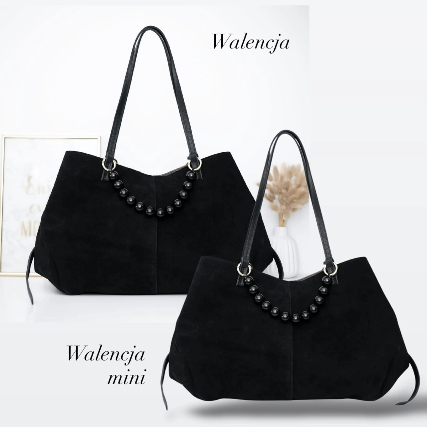 Torebka Walencja to połączenie klasycznej elegancji i nowoczesnego designu. Wykonana z wysokiej jakości, naturalnego zamszu w głębokiej czerni, zachwyca miękkością i wytrzymałością. Ręczne szycie zapewnia najwyższą precyzję wykonania, a unikalne dodatki w postaci naturalnych, czarnych korali dodają jej subtelnego, luksusowego charakteru.