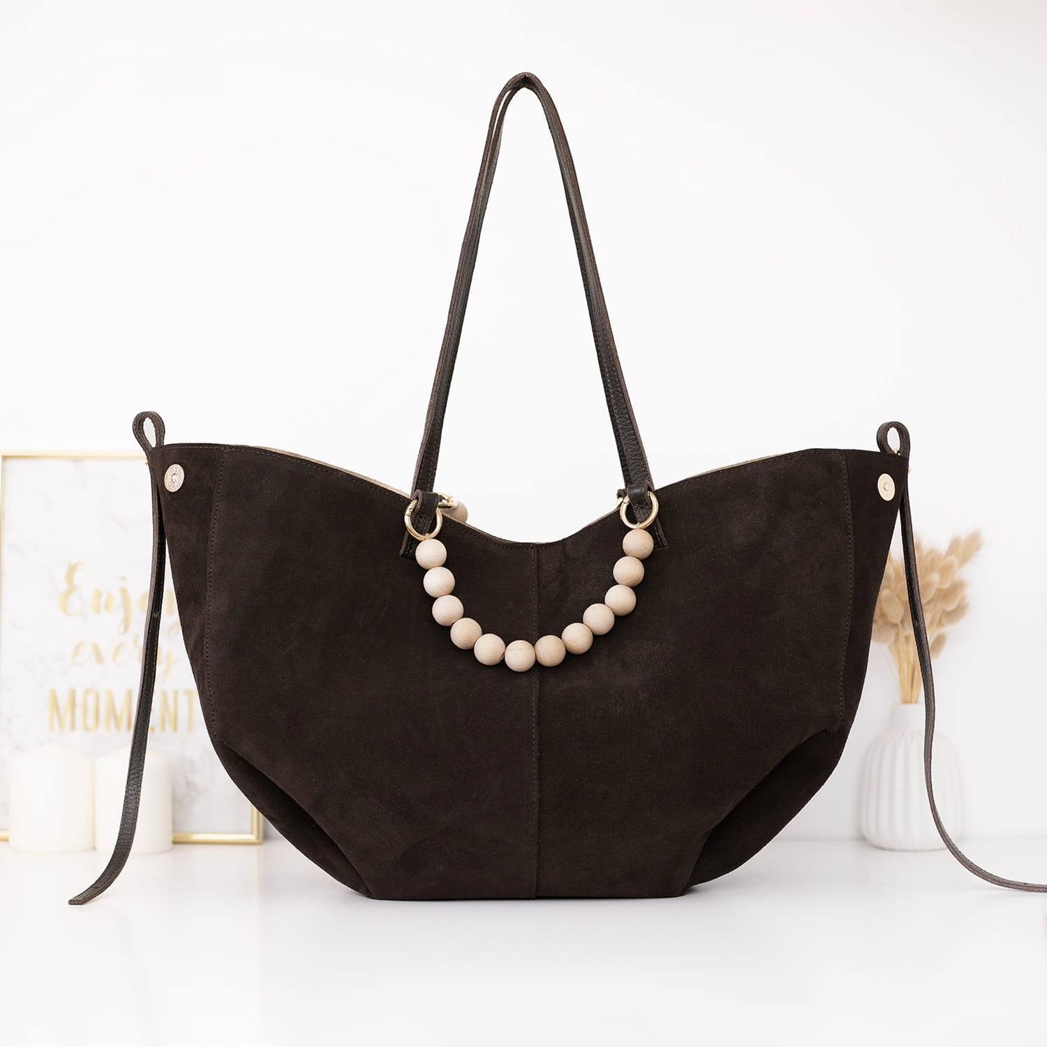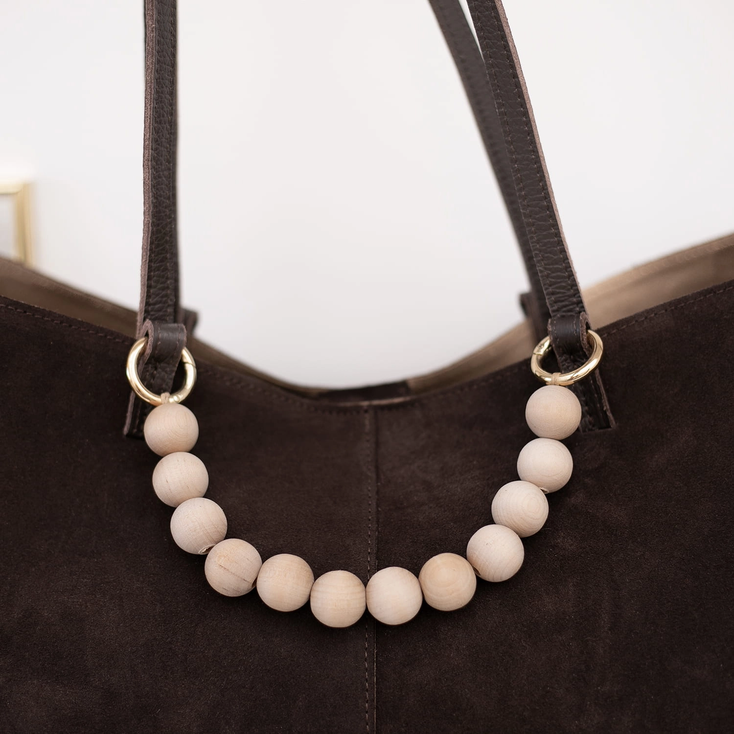 Charakterystycznym elementem torebki są drewniane korale na rączkach, które można odpiąć, dostosowując wygląd do własnych upodobań. Dzięki długiemu paskowi torebkę można wygodnie nosić na ramieniu, co zapewnia komfort użytkowania.
