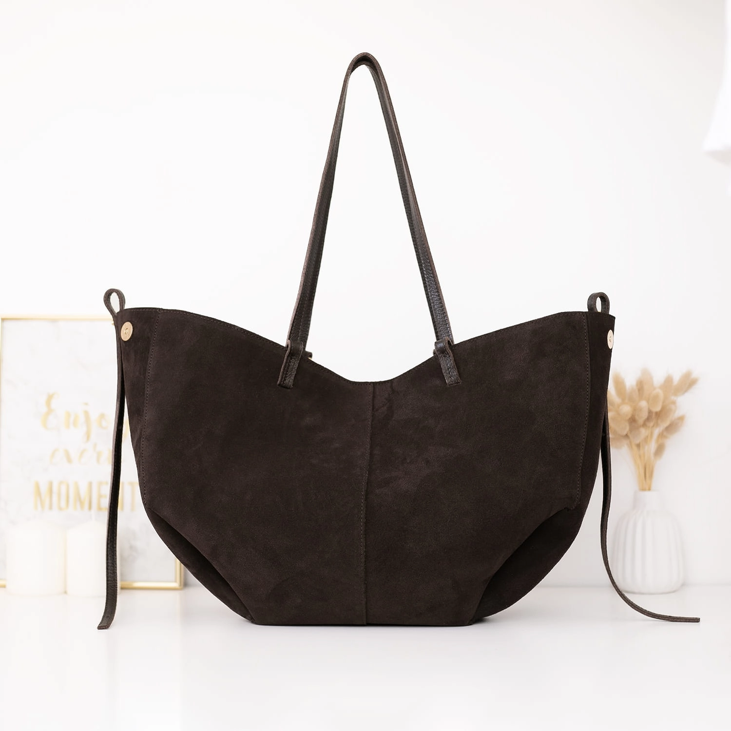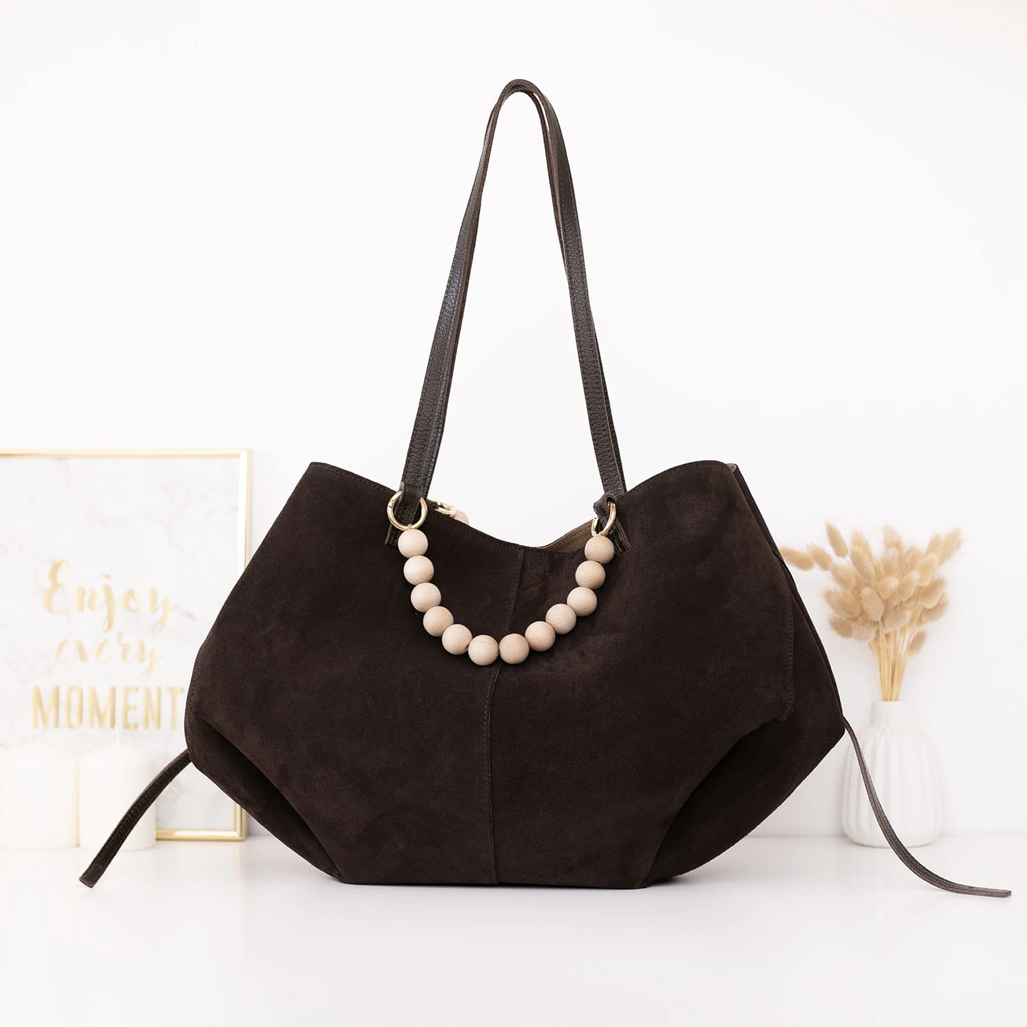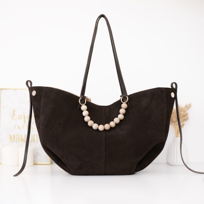 Oryginalna, ręcznie szyta torebka z miękkiego naturalnego zamszu, to propozycja dla kobiet, które cenią sobie elegancję i funkcjonalność. Jej najmodniejszy w tym sezonie kolor czekoladowy sprawia, że pasuje do wielu stylizacji, a nietuzinkowy design przyciąga uwagę.