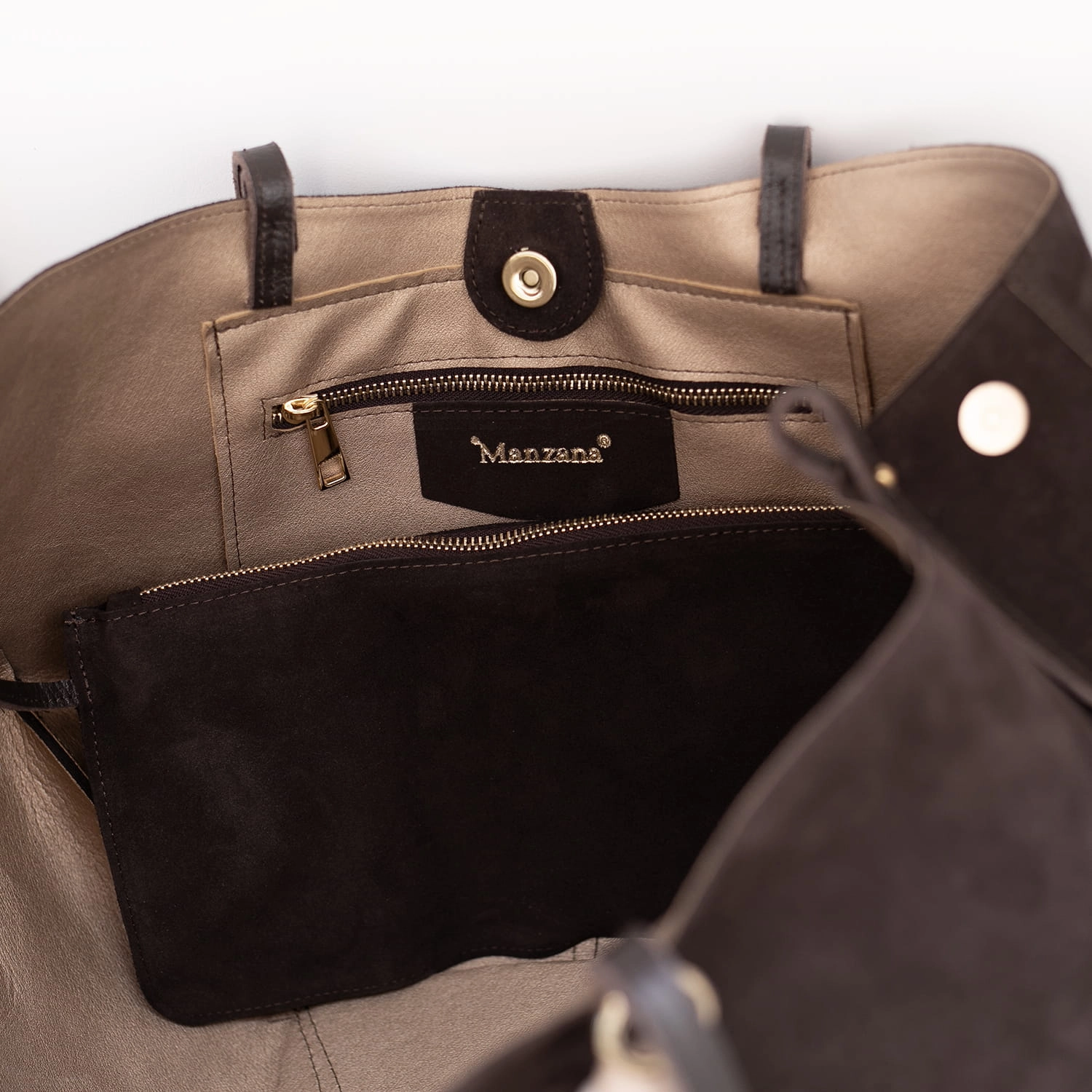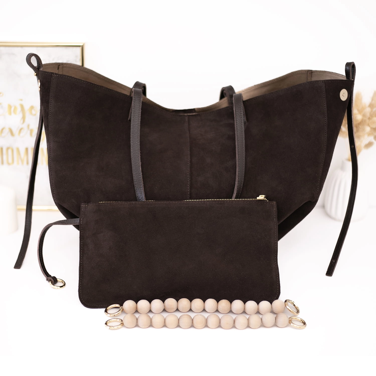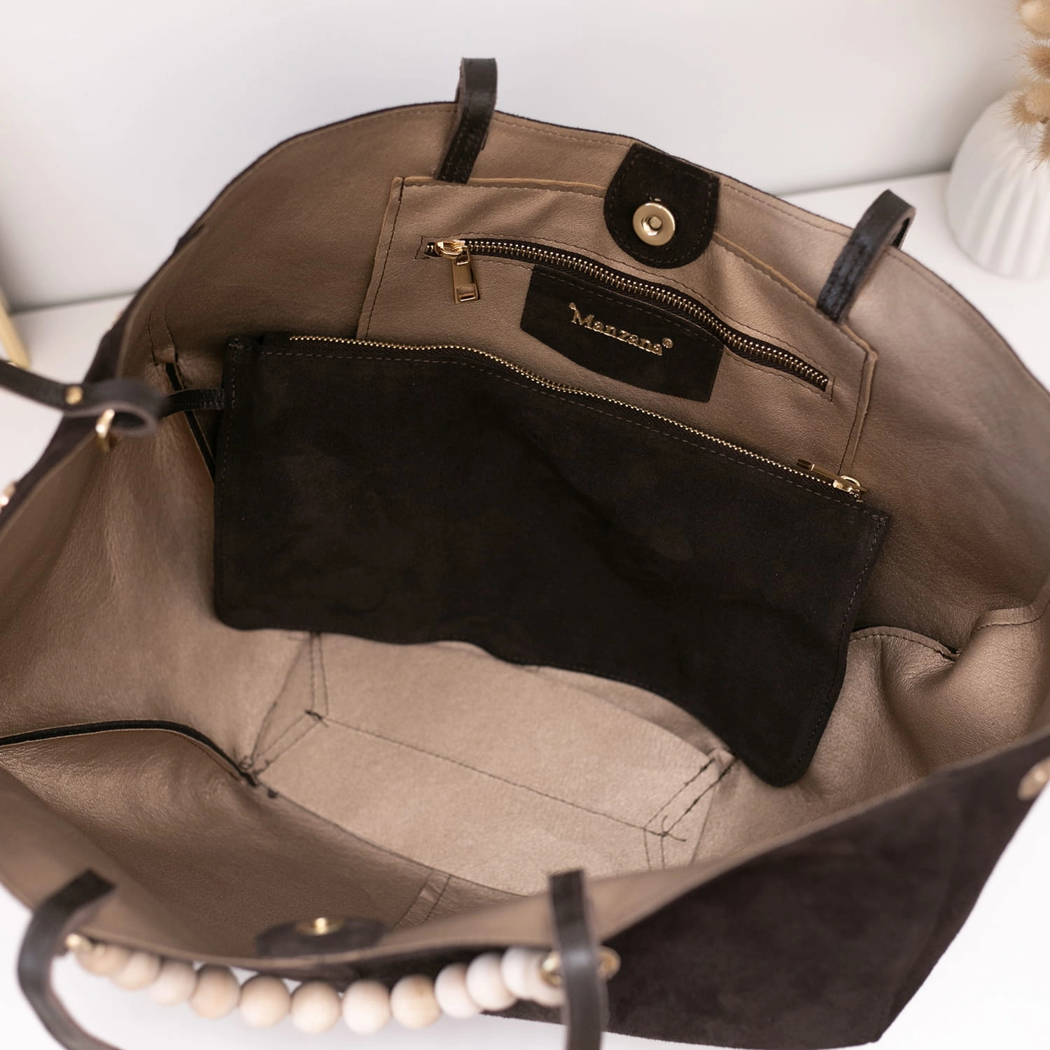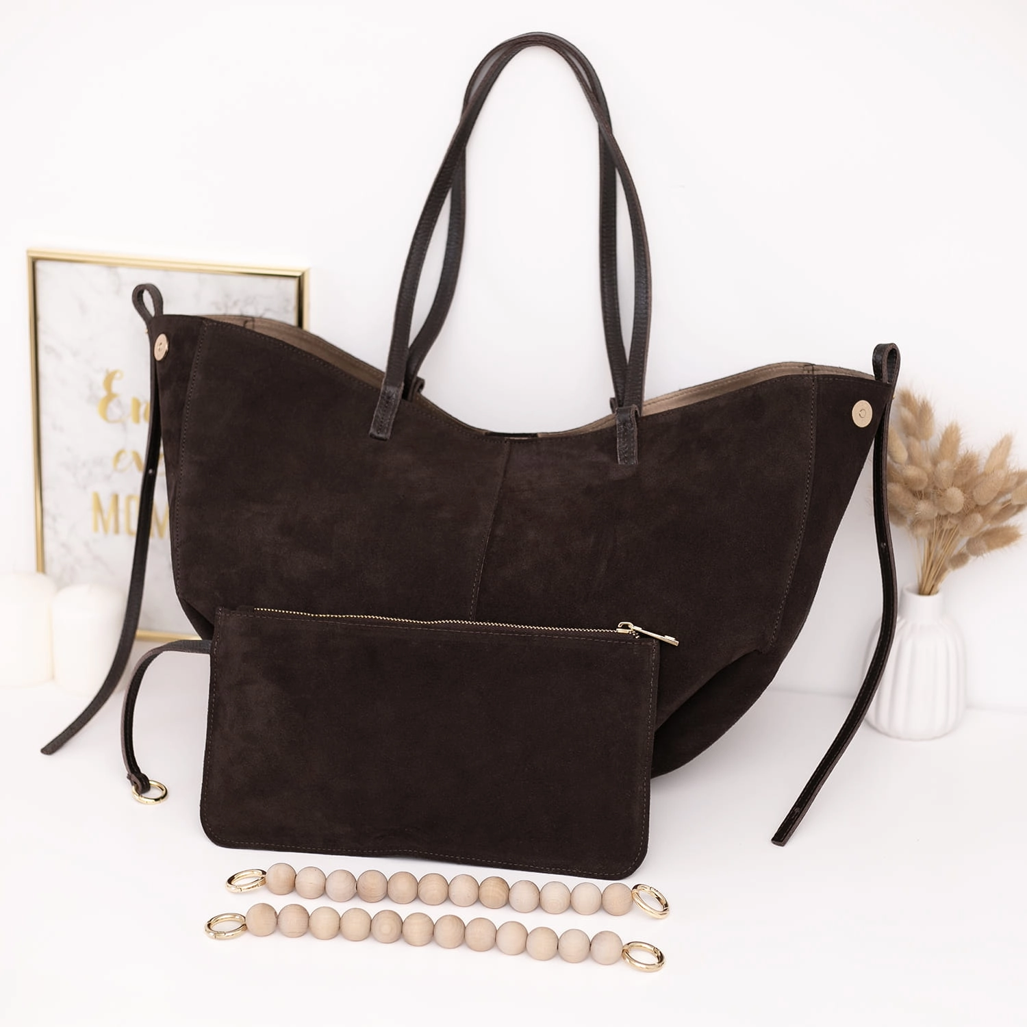 Torebka Walencja z naturalnego zamszu CZEKOLADOWA z wyciąganą kosmetyczka Dwie rączki