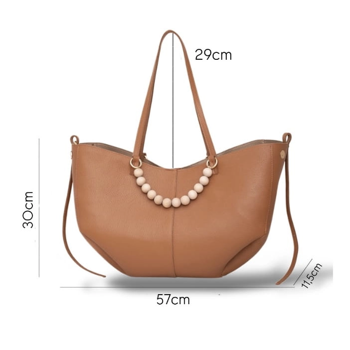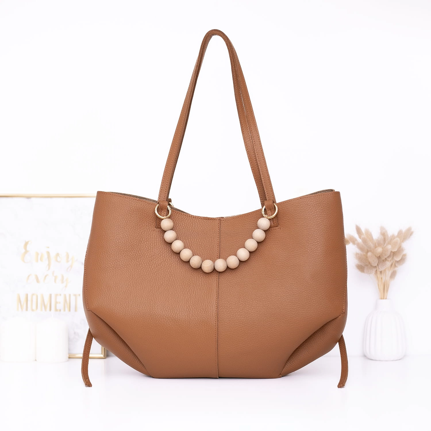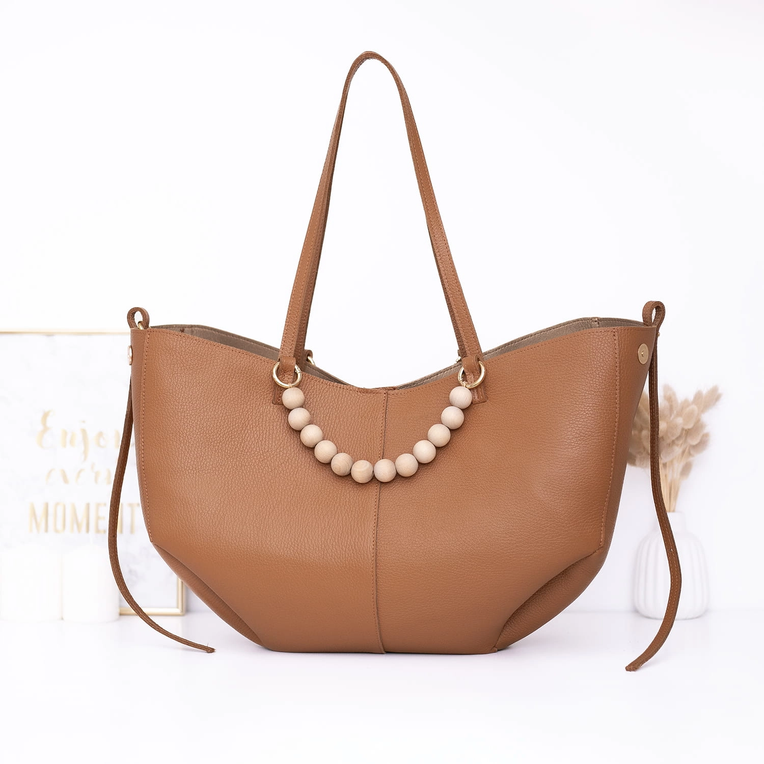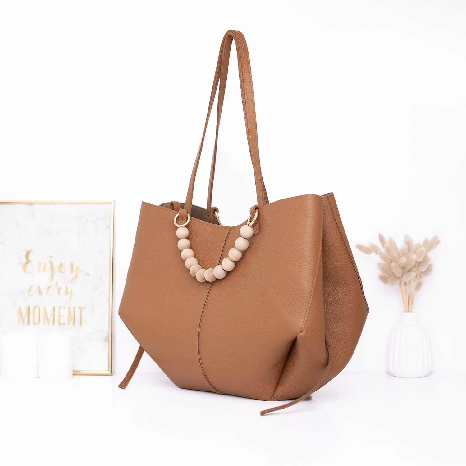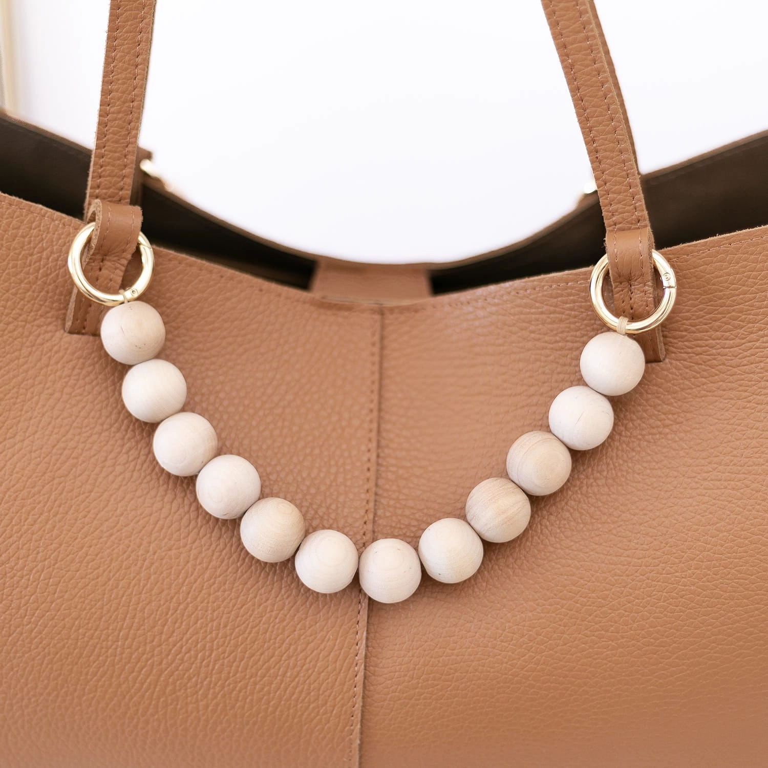 Charakterystycznym elementem torebki są drewniane korale na rączkach, które można odpiąć, dostosowując wygląd do własnych upodobań. Dzięki długiemu paskowi torebkę można wygodnie nosić na ramieniu, co zapewnia komfort użytkowania.
