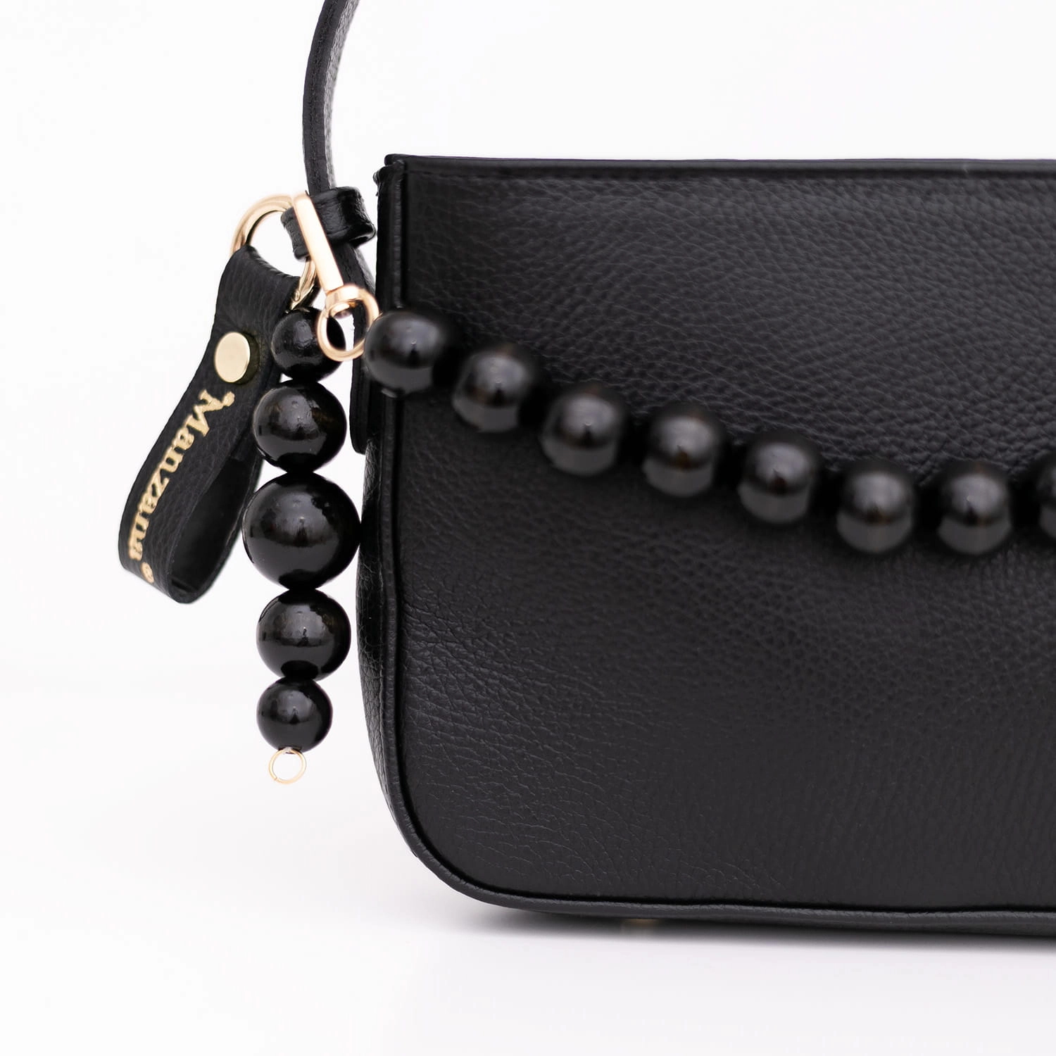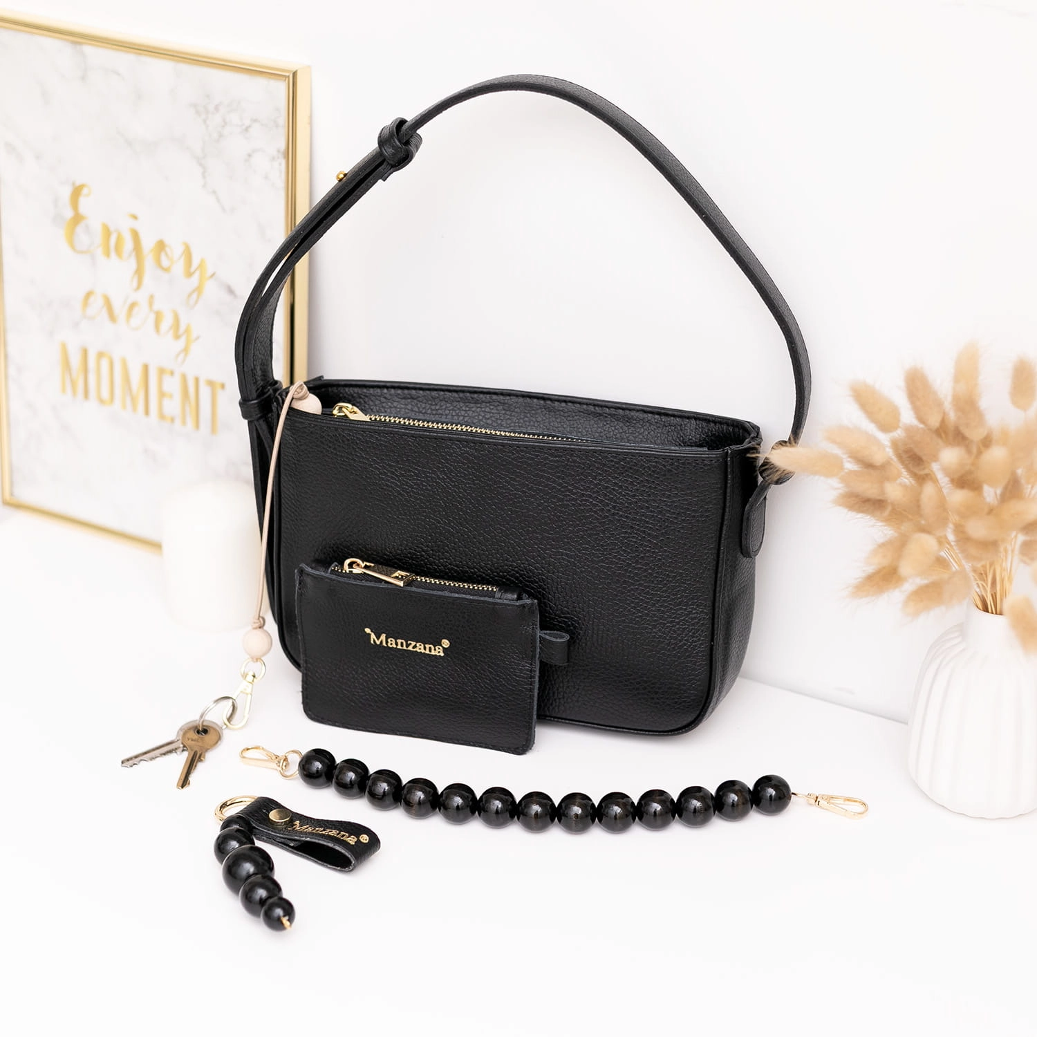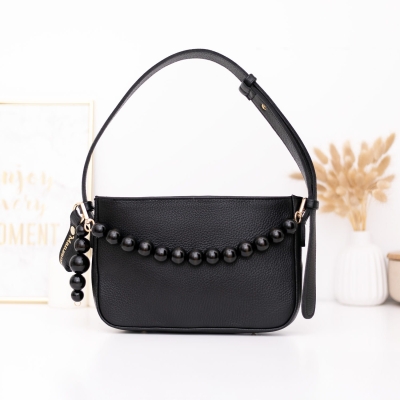 Torebka damska Manzana model Toledo czarna – naturalna skóra, rączka i brelok z koralami naturalnymi