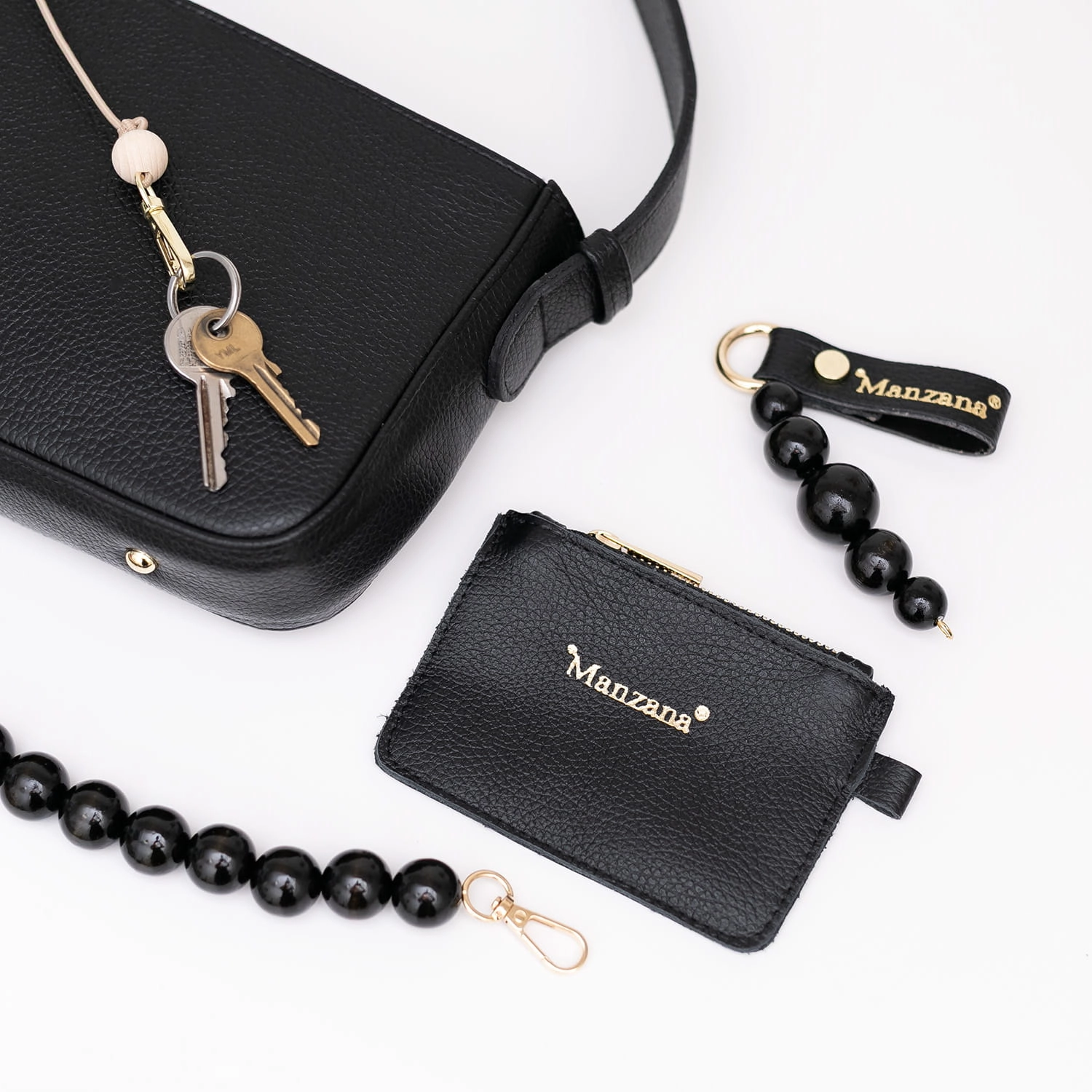 Pełny zestaw (torebka + portfelik + brelok na klucze + brelok z koralikami + dodatkowa rączka z koralikami) – 269 zł. Cena bazowa to 199 zł – sama torebka Toledo bez dodatków. Ty decydujesz, które akcesoria Manzana chcesz dodać do swojej torebki Toledo.