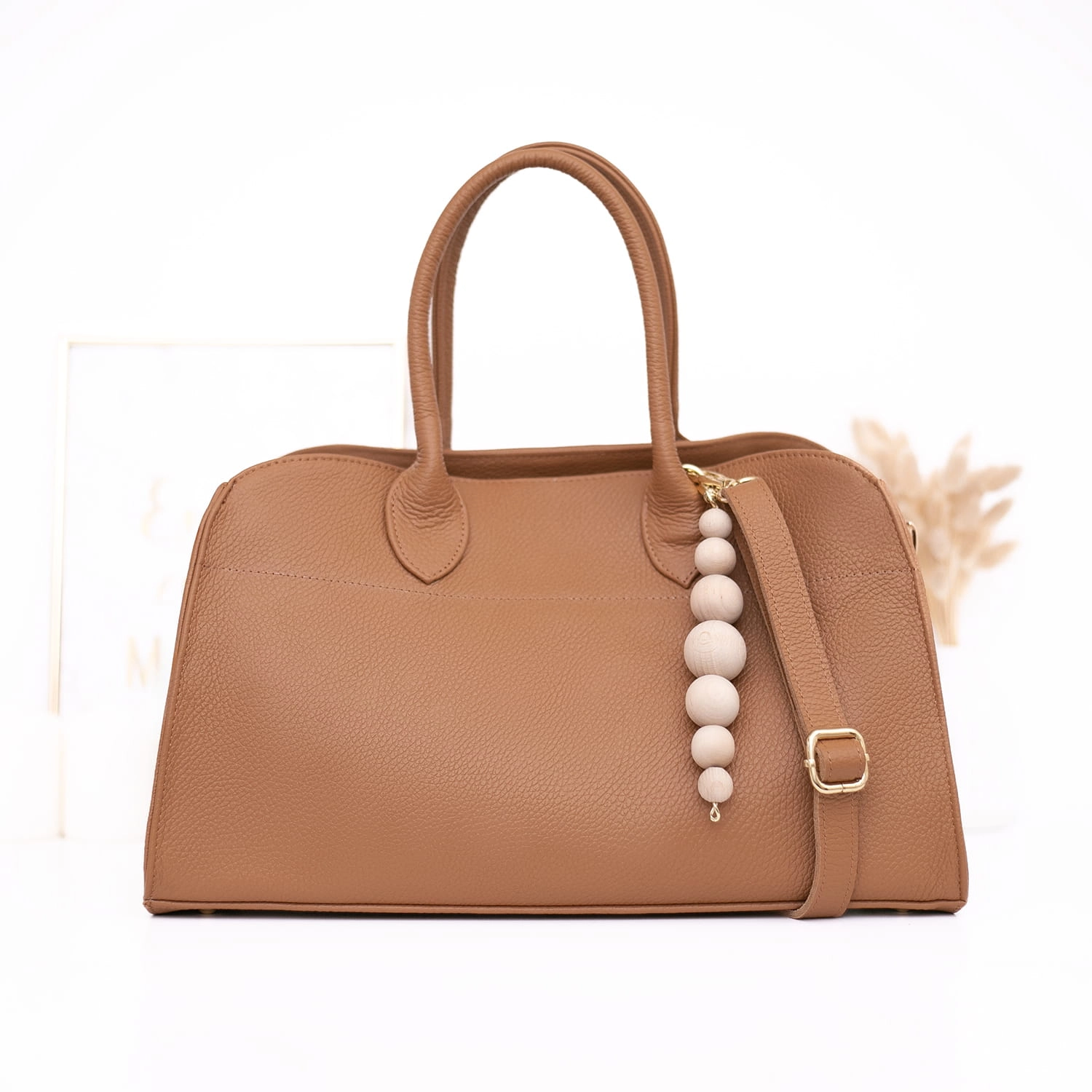To, co uwielbiam w tej torebce, to charakterystyczne dla Manzany korale w formie breloczka. Nadają całości niepowtarzalnego uroku i przyciągają spojrzenia. Do tego jest superpraktyczna — mogę nosić ją w ręku albo na ramieniu, dzięki regulowanemu paskowi.