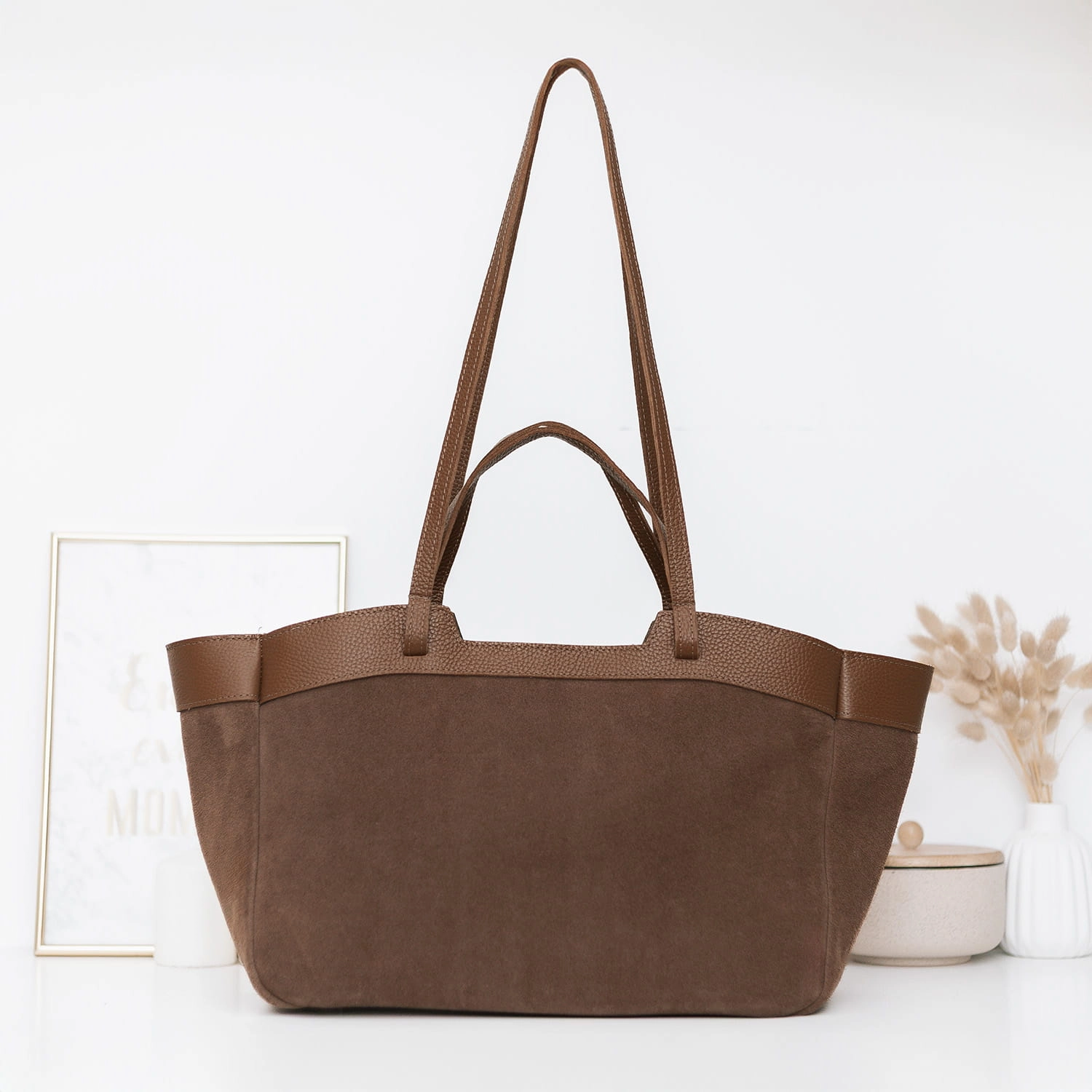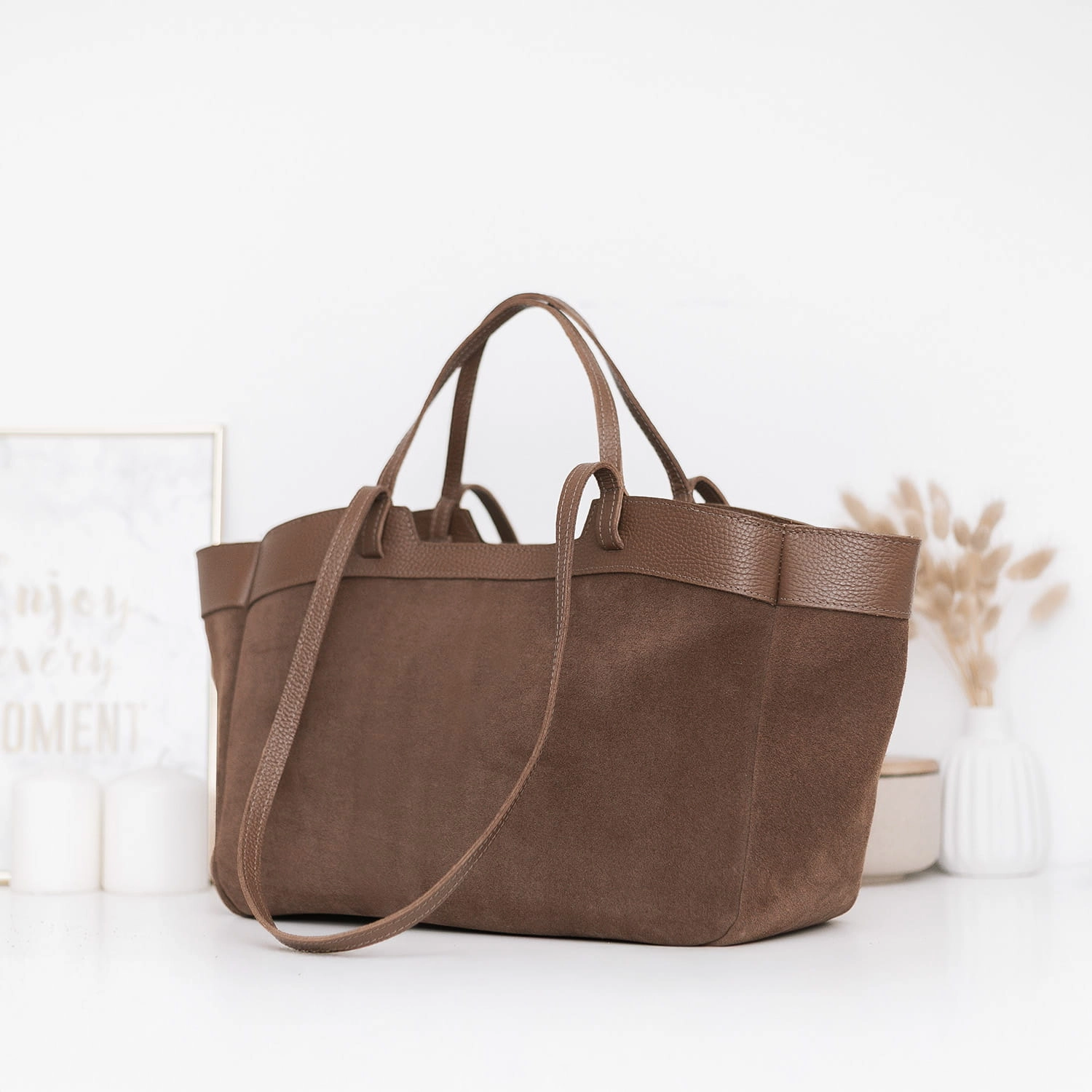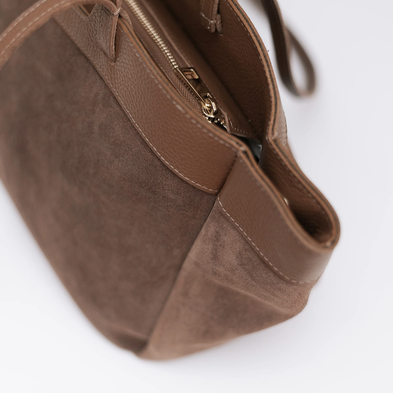 torebka Manzana, Manzana Lanzarote, torebka damska, torebka skórzana damska, torebka zamszowa tabak, torebka do pracy A4, torebka miejska, torebka na zamek, shopper skórzany, torba damska do pracy, polska torebka handmade, naturalny zamsz, skóra naturalna, elegancka torebka damska