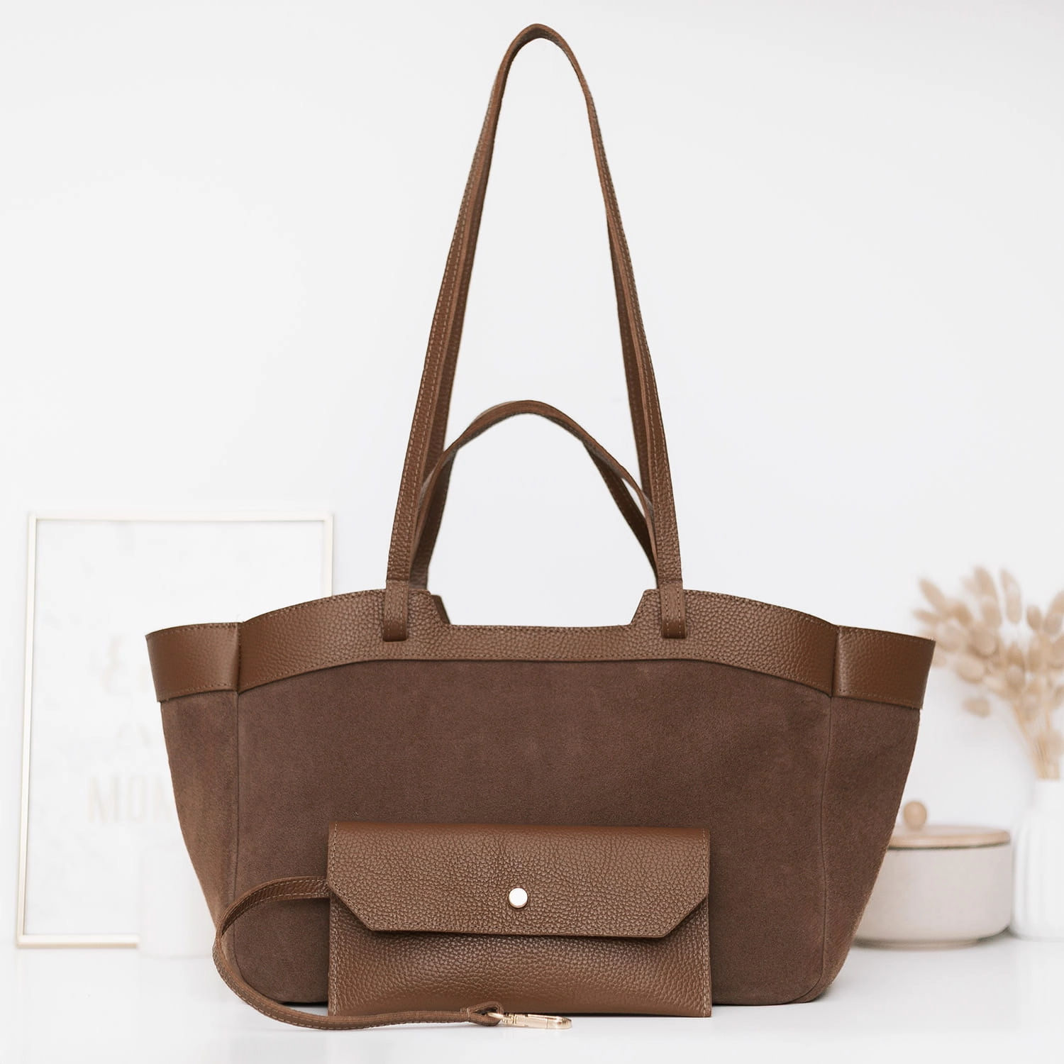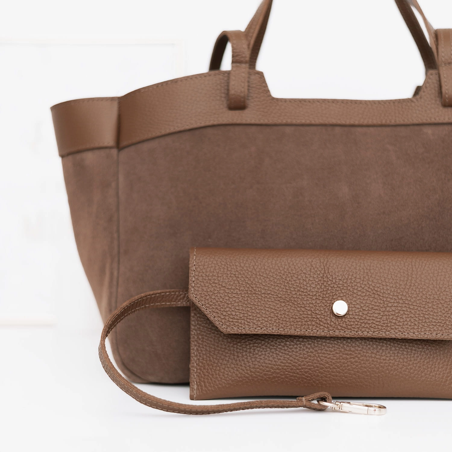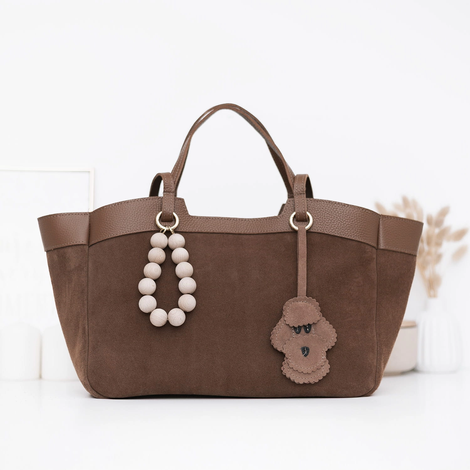 torebka Manzana, Manzana Lanzarote, torebka damska, torebka skórzana damska, torebka zamszowa tabak, torebka do pracy A4, torebka miejska, torebka na zamek, shopper skórzany, torba damska do pracy, polska torebka handmade, naturalny zamsz, skóra naturalna, elegancka torebka damska