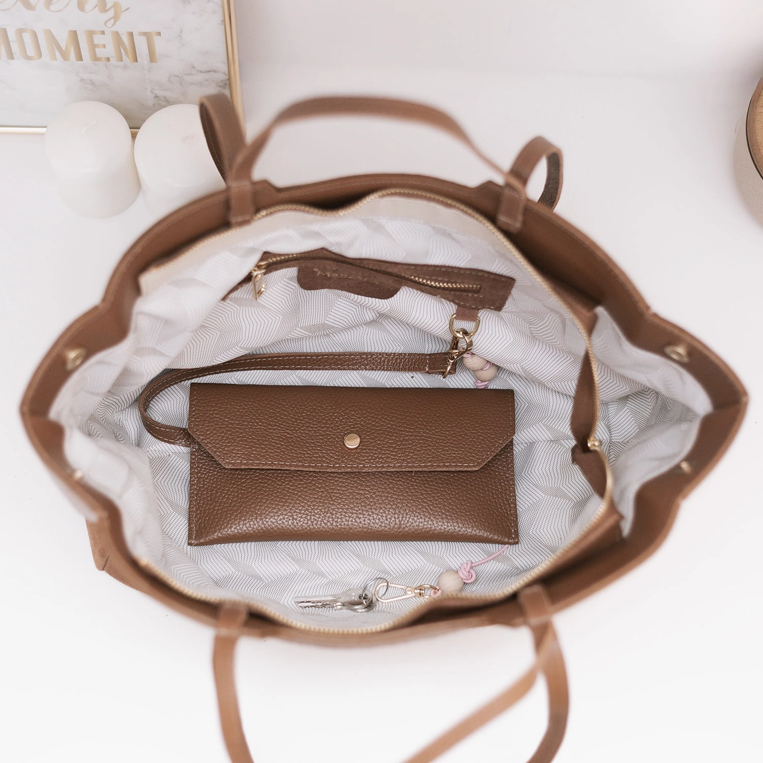 Na spodzie znajdują się stopki ochronne, które zabezpieczają torebkę przed zabrudzeniem i przetarciami. Wnętrze wykończone jest jasną bawełnianą podszewką i zawiera skórzaną kosmetyczkę – praktyczną i elegancką, do noszenia wewnątrz lub osobno.