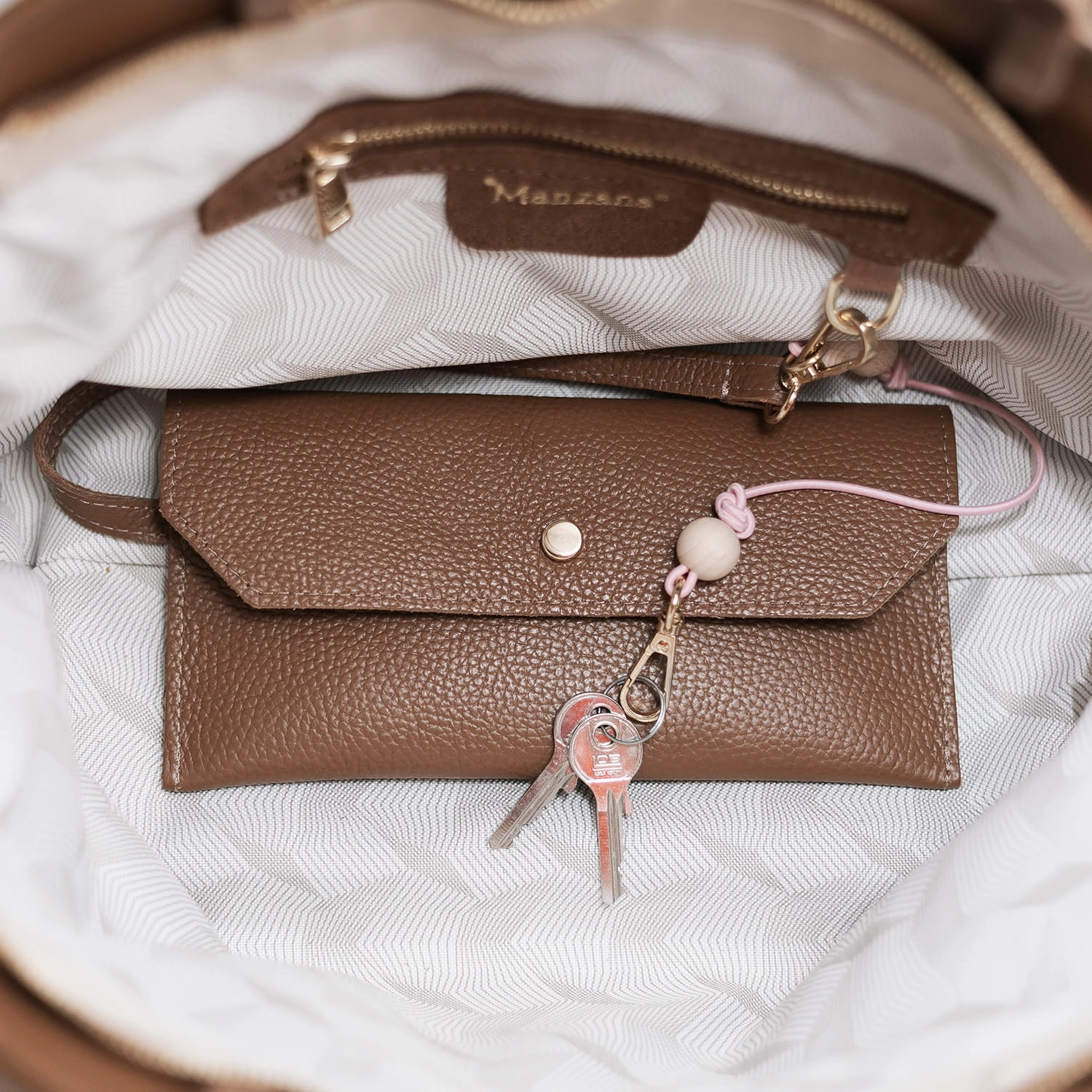 Manzana Lanzarote w kolorze tabak to ponadczasowa, miejska torebka damska wykonana ręcznie z naturalnej skóry licowej i naturalnego zamszu. Odcień tabak to szlachetna, ciepła tonacja brązu, która pięknie komponuje się zarówno z jasnymi, jak i ciemnymi stylizacjami.