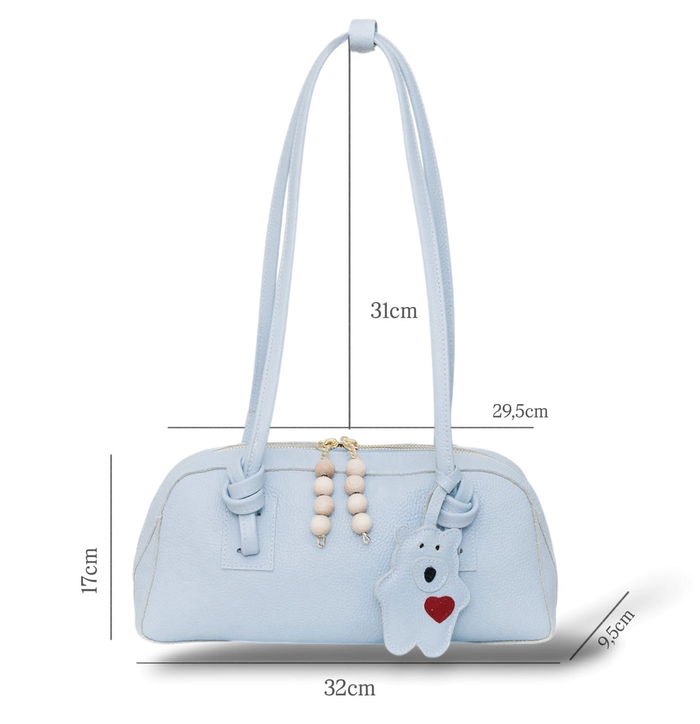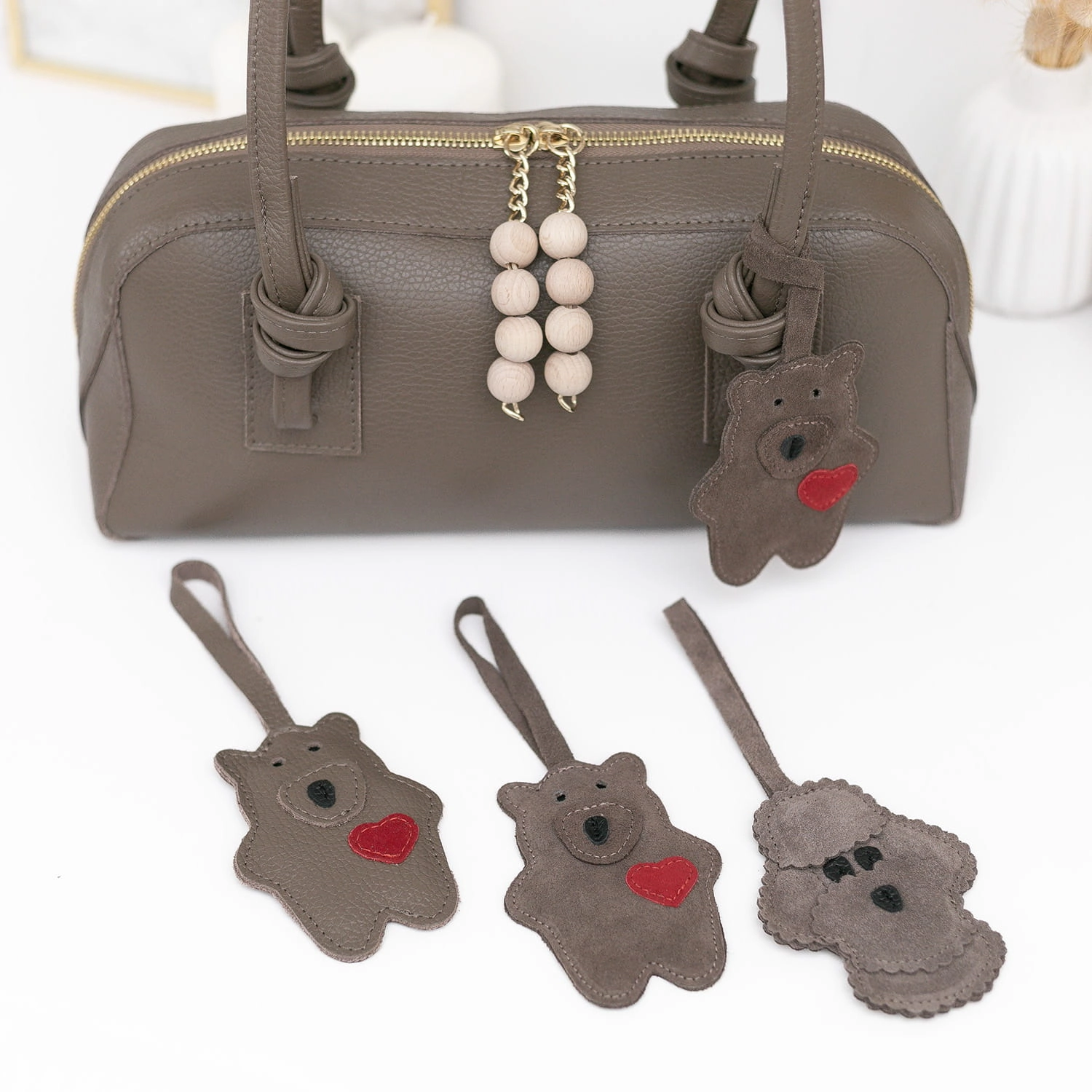 Skórzana zawieszka w kształcie misia z czerwonym sercem dodaje torebce uroku i osobowości. To detal, który sprawia, że model nie jest chłodny ani formalny staje się bliższy, cieplejszy i bardziej „kobiety”. To balans między elegancją a miękkością.